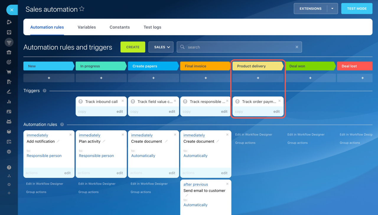 Automation rules and triggers in CRM help automate customer interactions. Automation rules perform routine tasks, like sending emails, planning activities, and creating documents. Triggers track customer actions and changes in CRM, such as email link clicks, incoming calls, invoice payments, and more. When a specific action occurs, the trigger moves a CRM item to its designated stage.