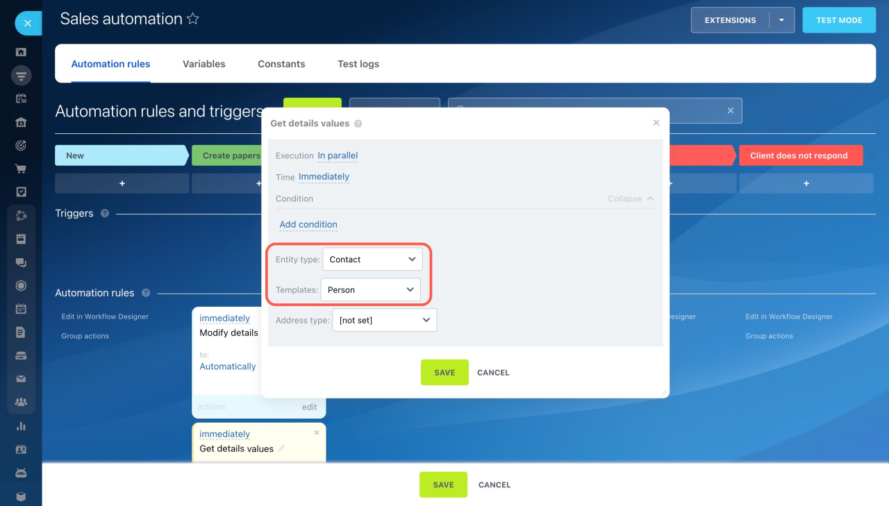 When a deal moves to the Create papers stage, the automation rule changes the Address field value in the contact details.