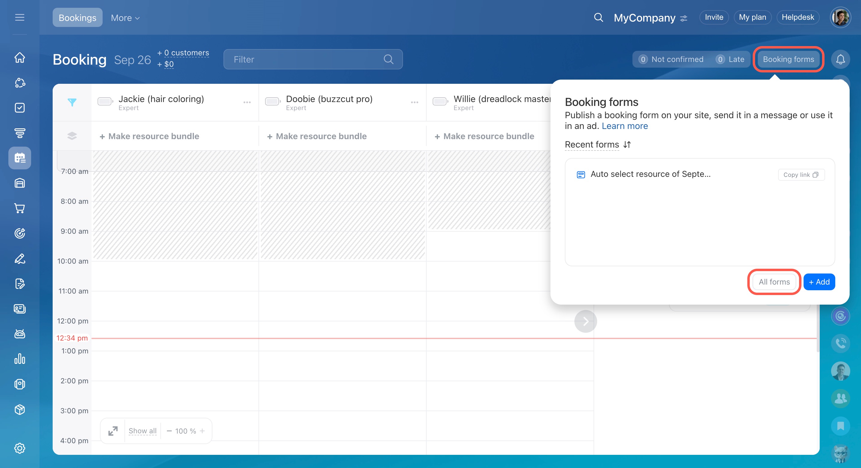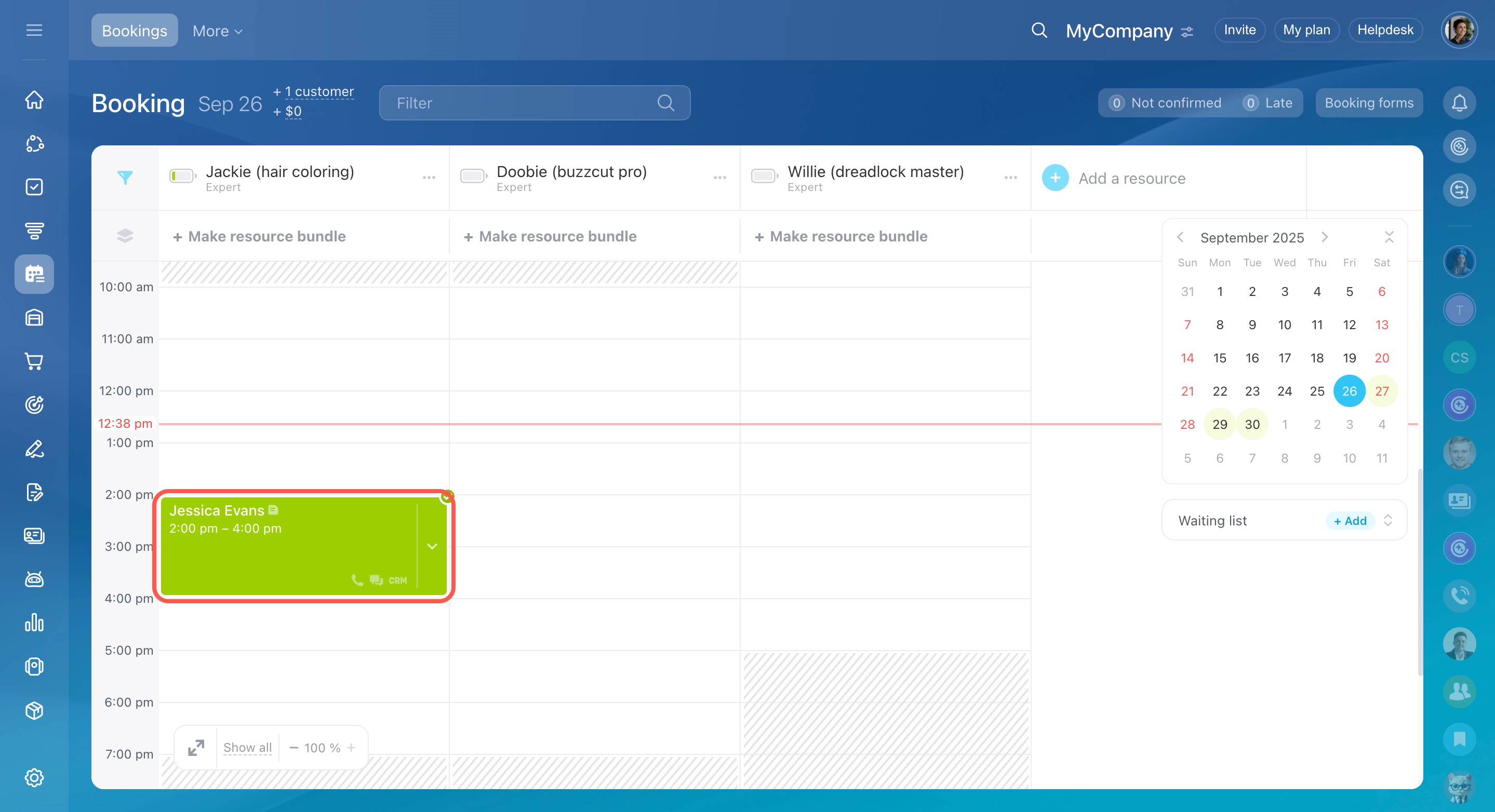 - Select from all resources. The customer selects the specialist, date, and time. It is convenient when a specific specialist is needed. For example, a customer wants to book service only with a particular hairdresser.