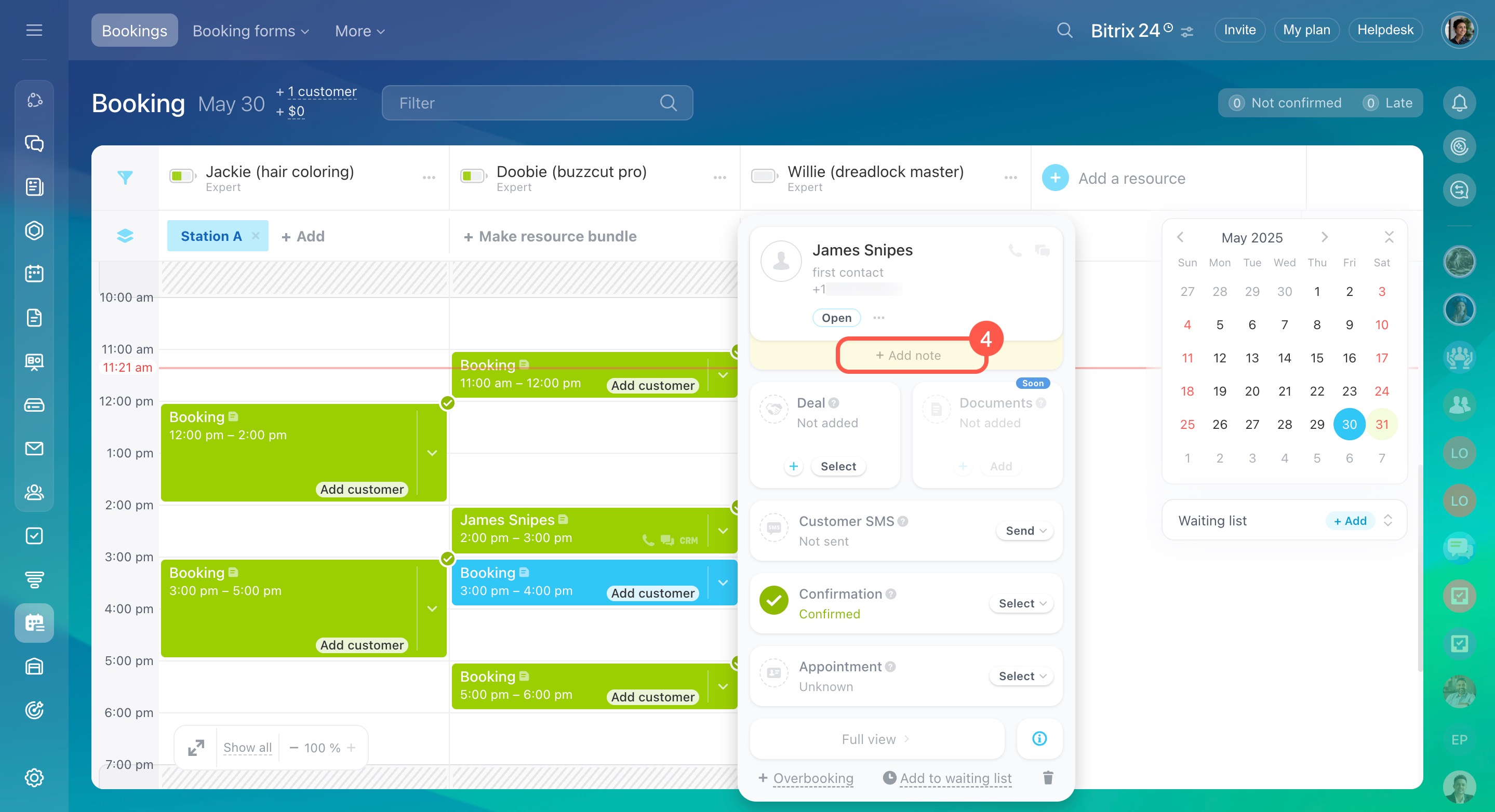 Add a customer, link a deal from CRM, and leave a note with important details in the entry.
