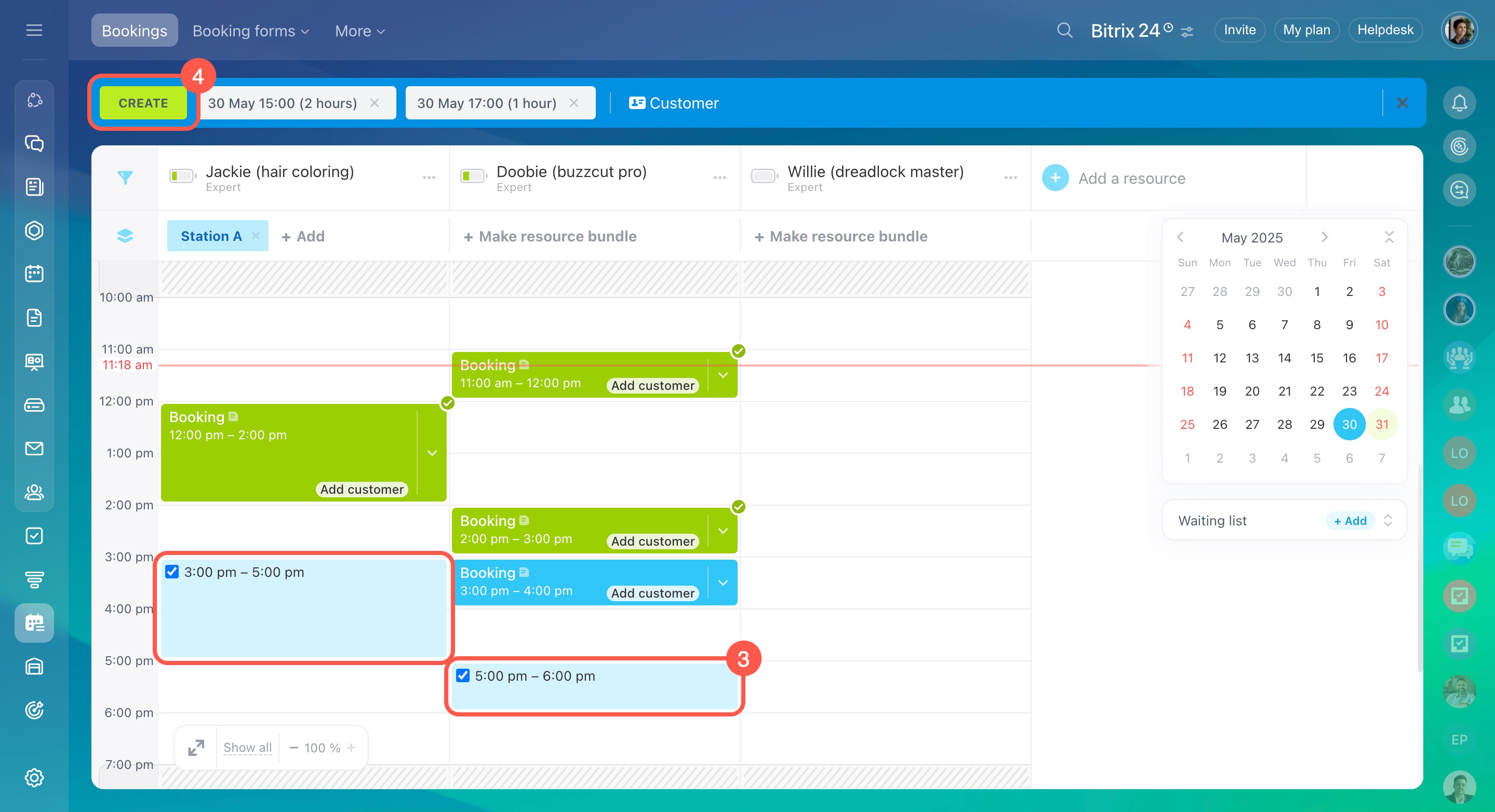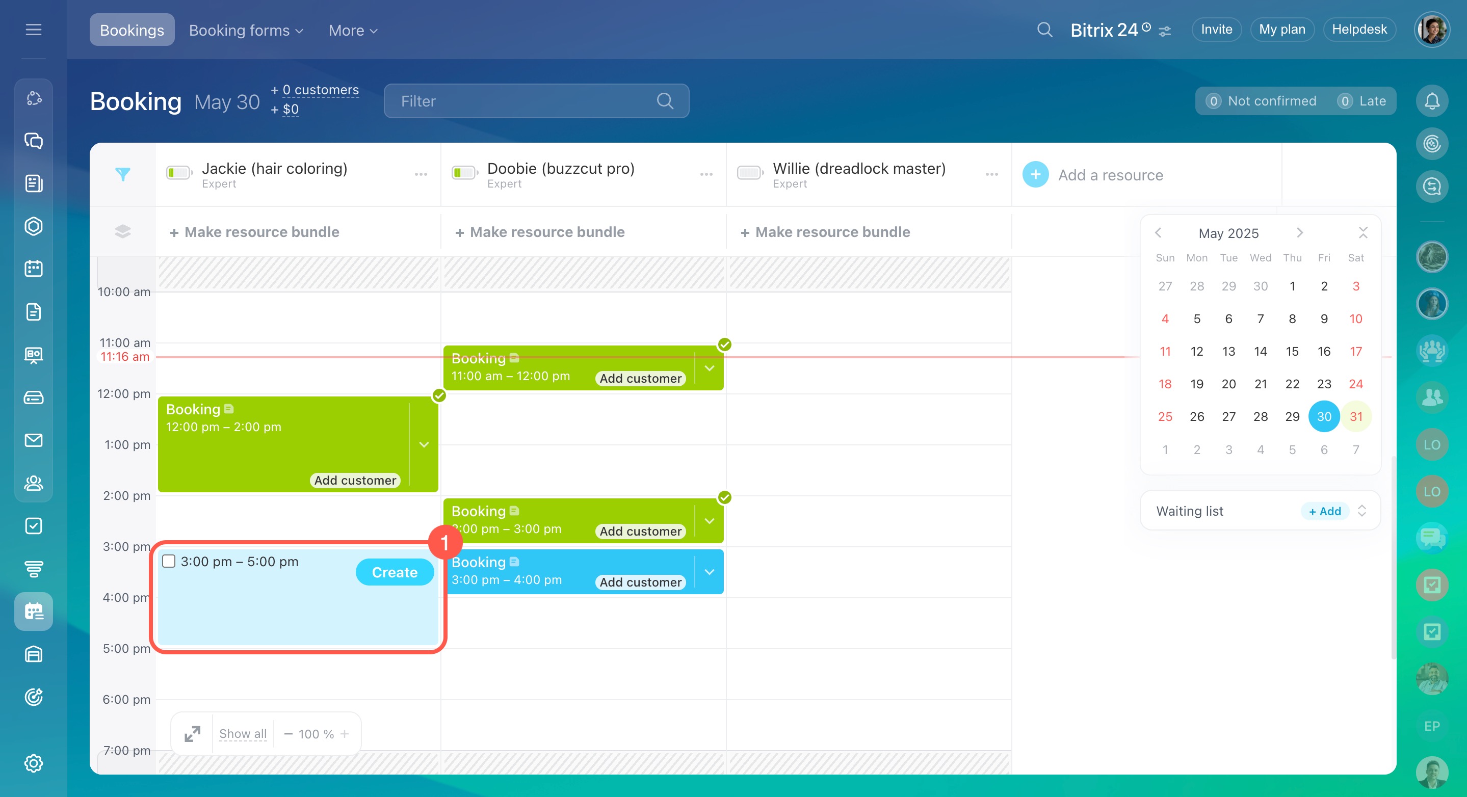 Select a time slot under the desired resource and click Create. You can create several bookings for one customer at once.