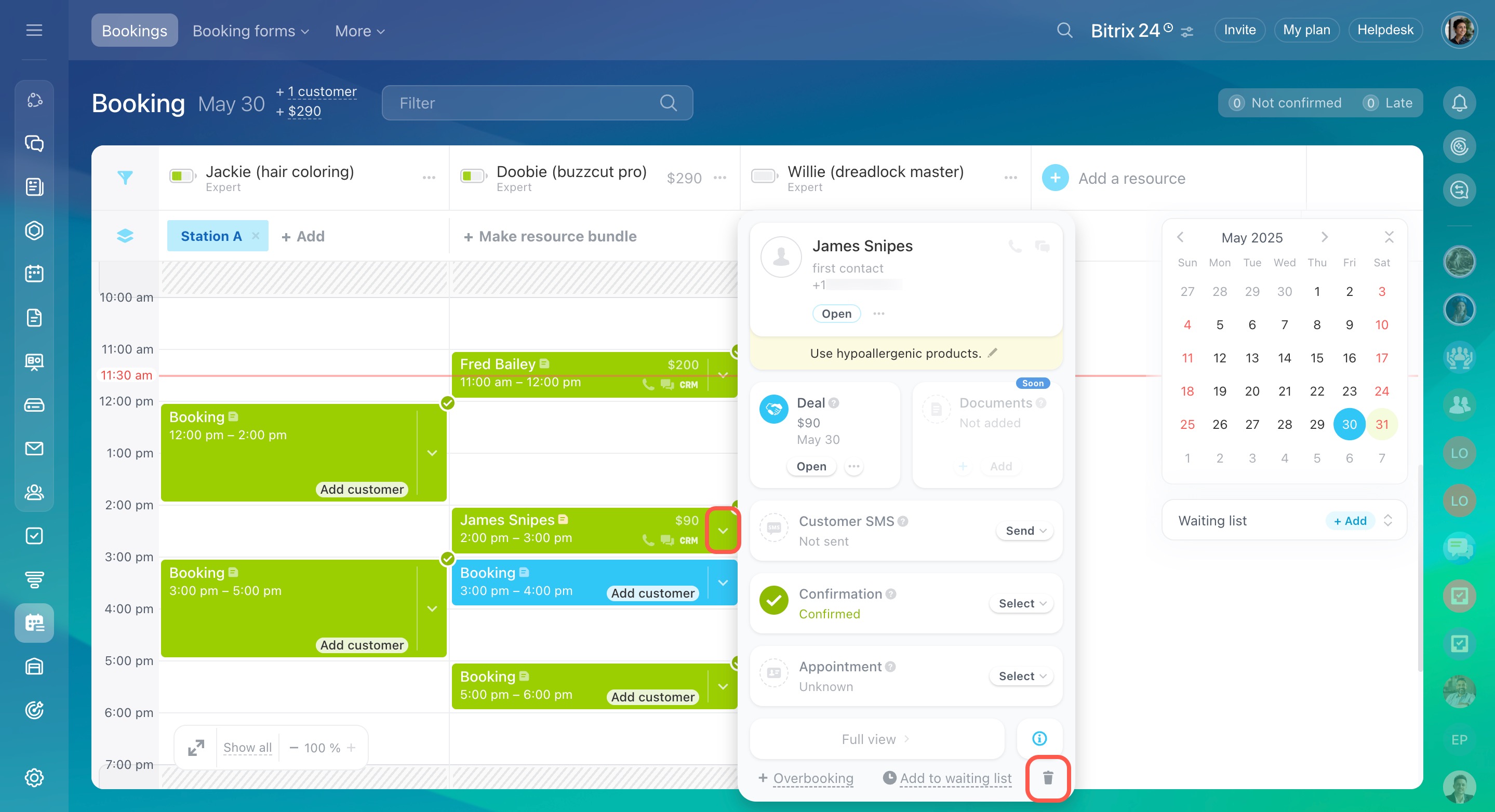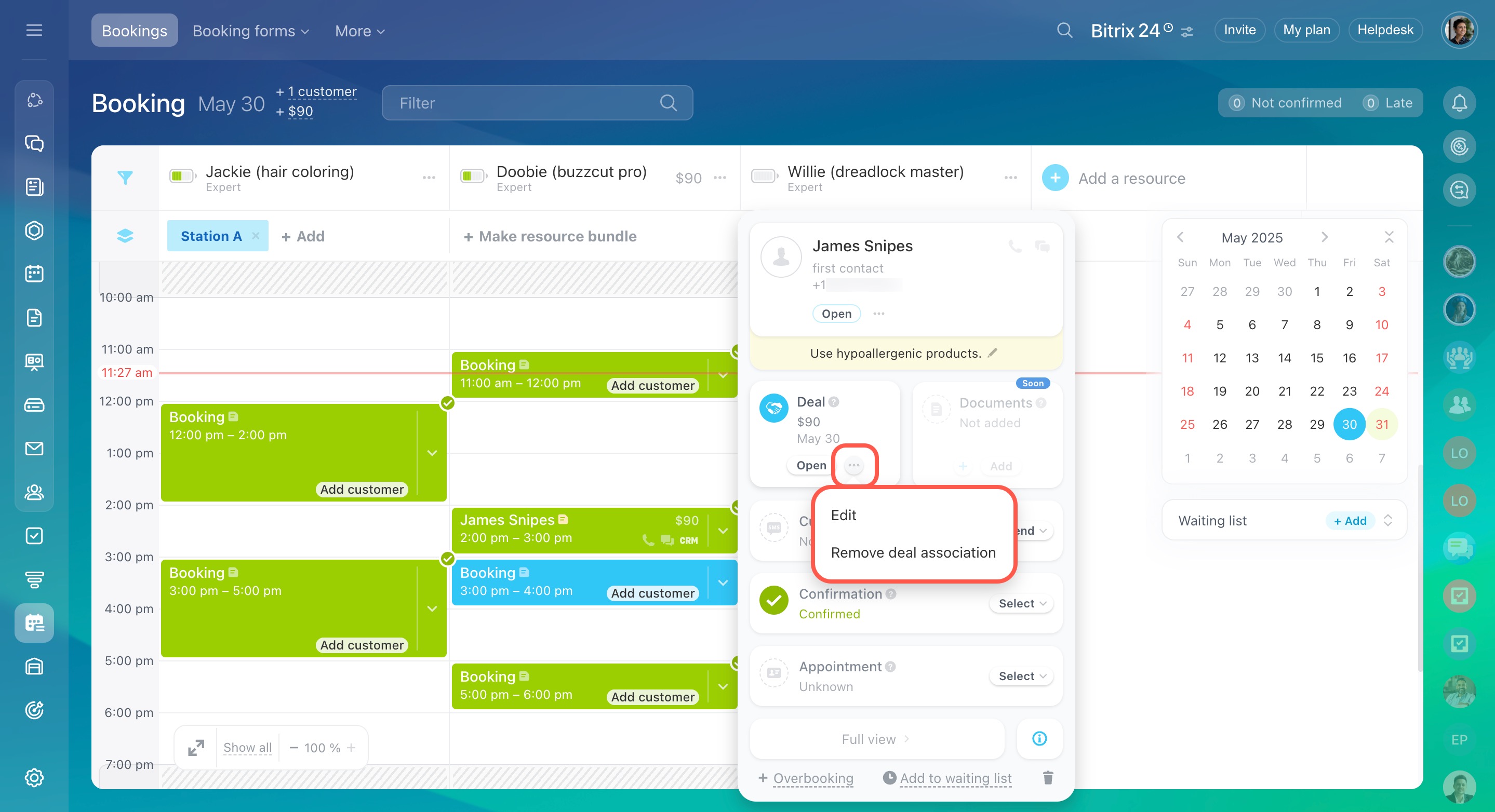 To edit or delete a deal linked to the booking, click the three dots (...) and choose the desired action.