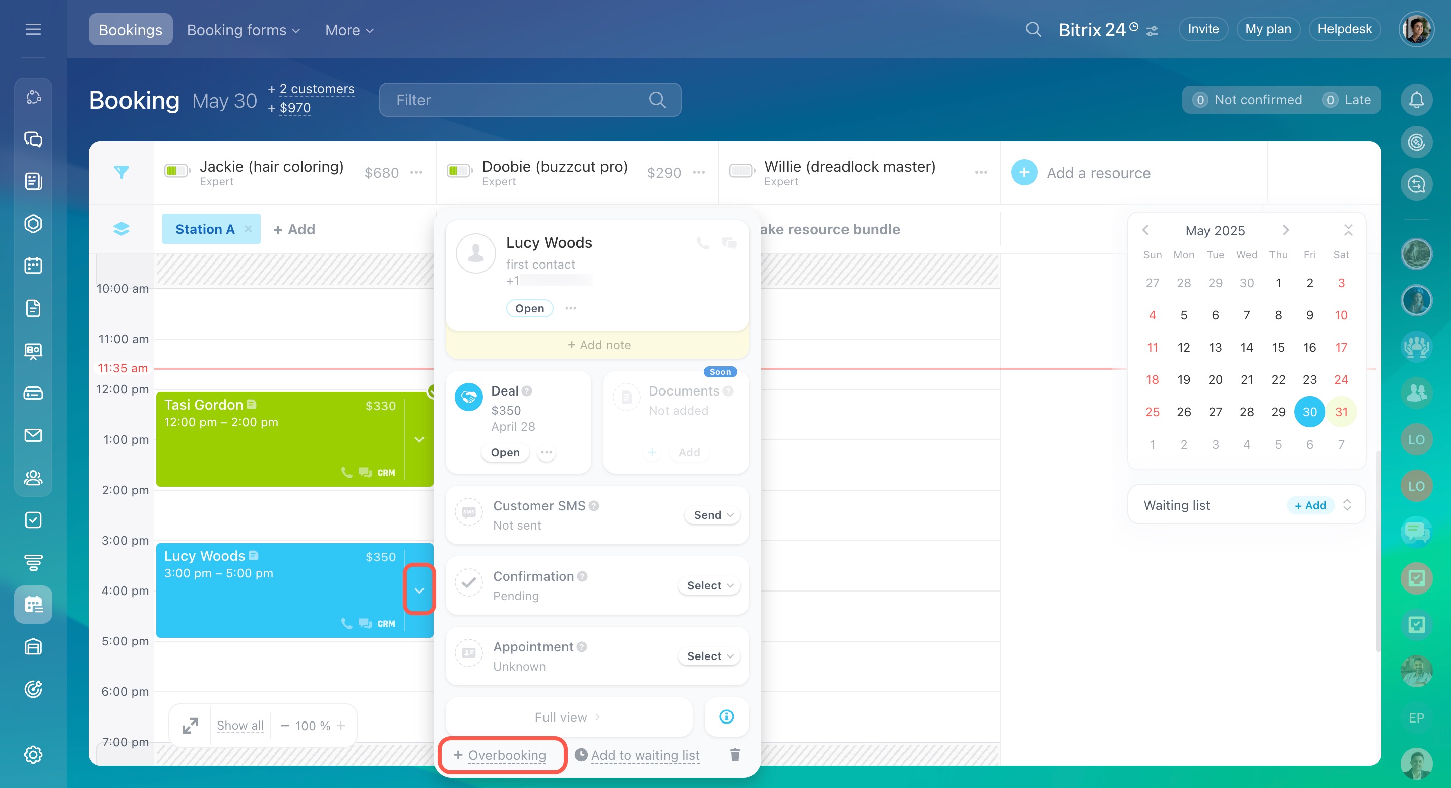 - Add a customer to the appointment. Click the arrow in the existing entry block and select Overbooking. Fill out the form by adding another customer and linking a deal.
