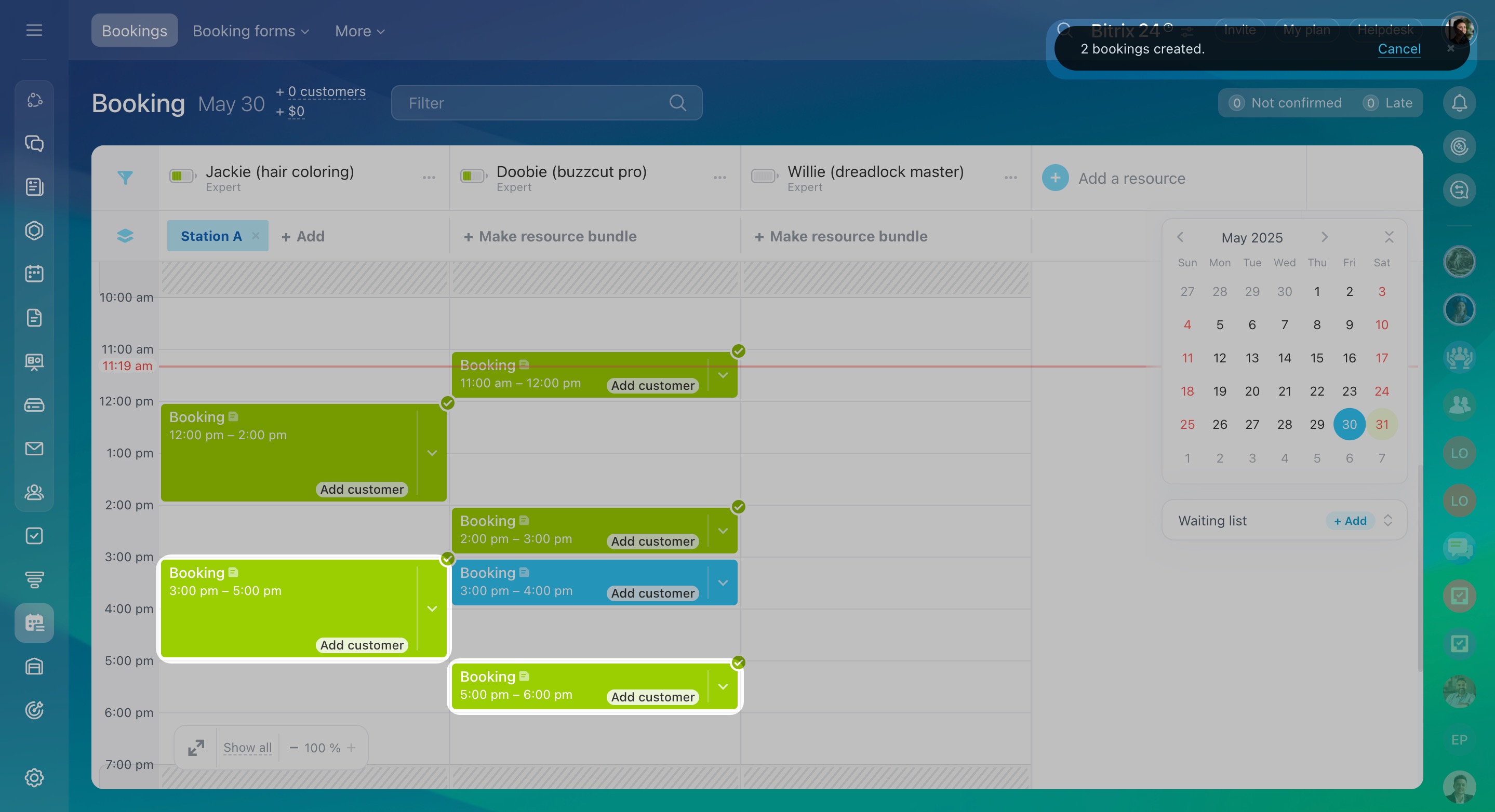 - To book multiple appointments for a customer, select several time slots on the schedule board.