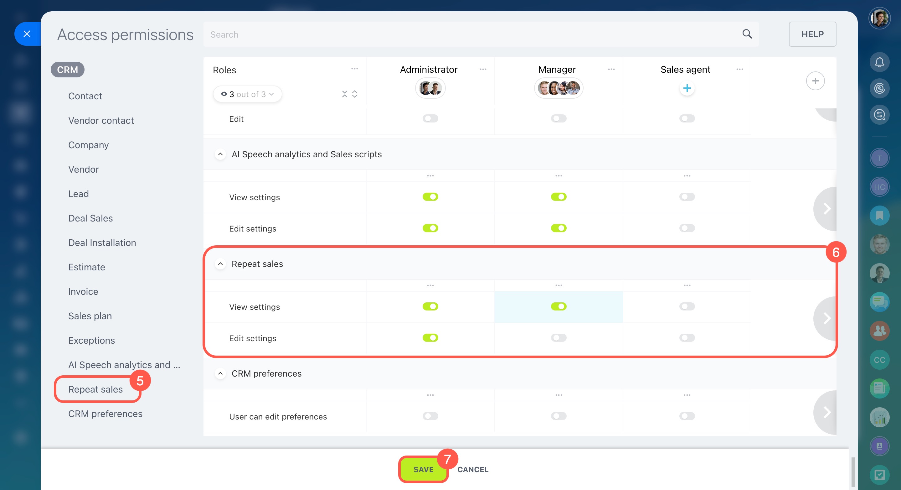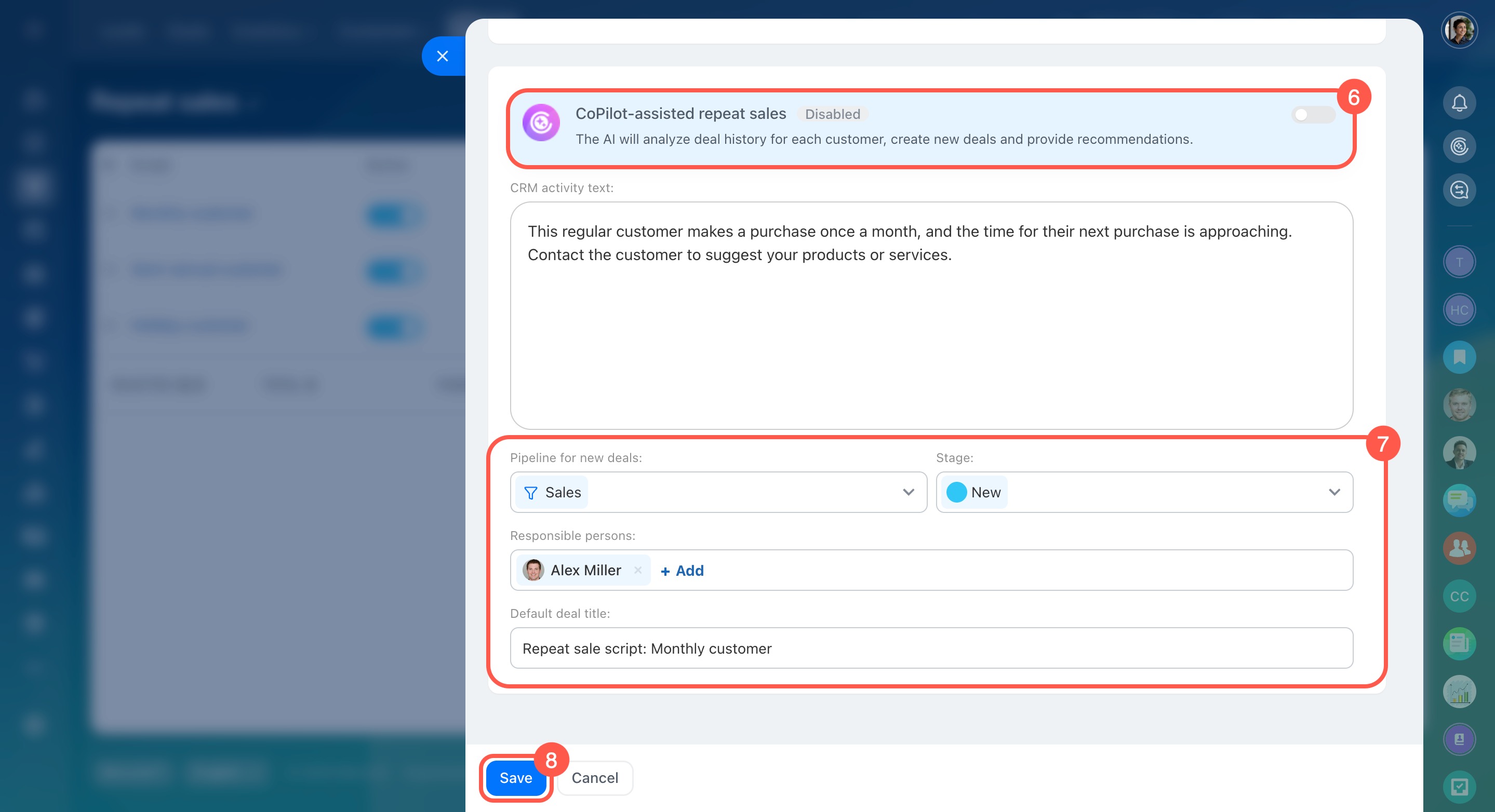 Enable repeat sales. By default, AI regularly identifies customers who are likely to buy again. However, it doesn't create repeat deals unless this feature is enabled. Only administrators or users with permission to edit deals can turn on deal creation via a special banner in CRM.