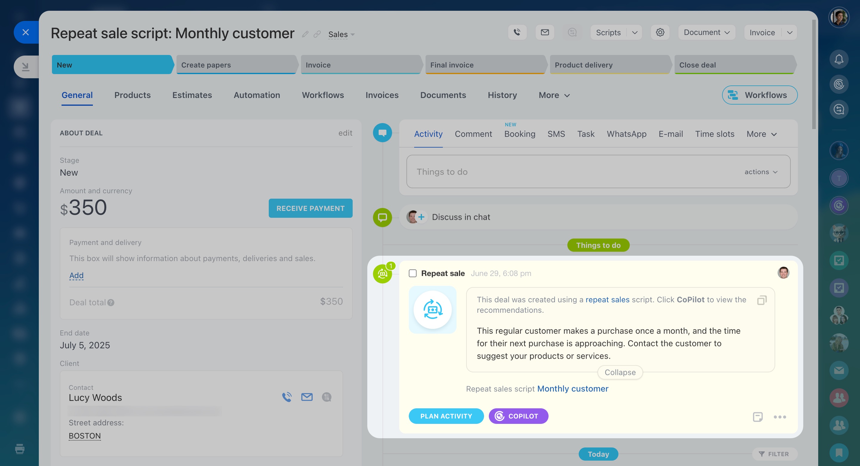 Repeat sales are planned purchases from customers who interacted with your business before. The Repeat sales tool uses AI to identify customers who are likely to buy again and automatically creates deals for them. CoPilot adds an activity to each deal with personalized recommendations for your sales agents on what to offer and how to lead the conversation.