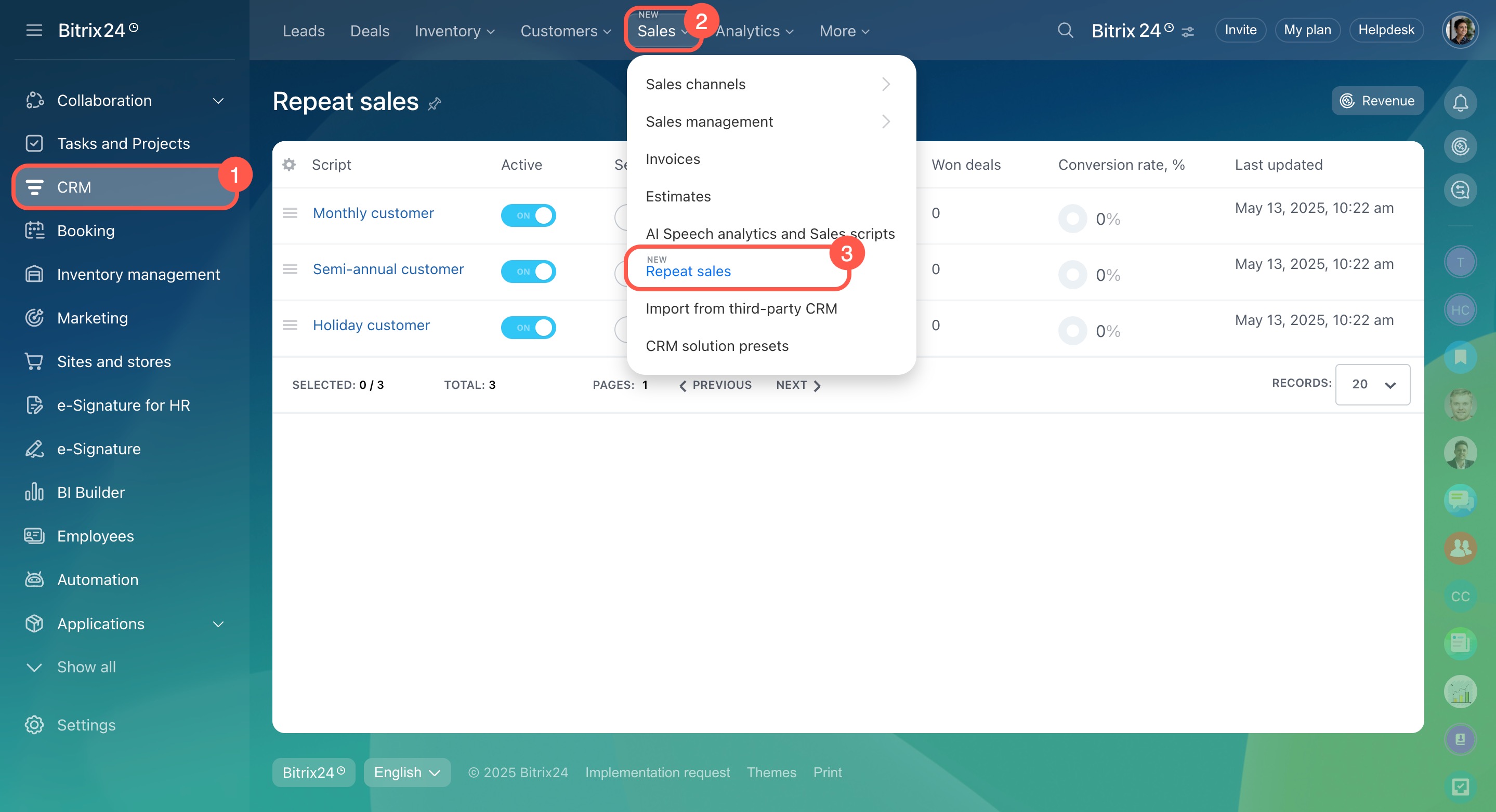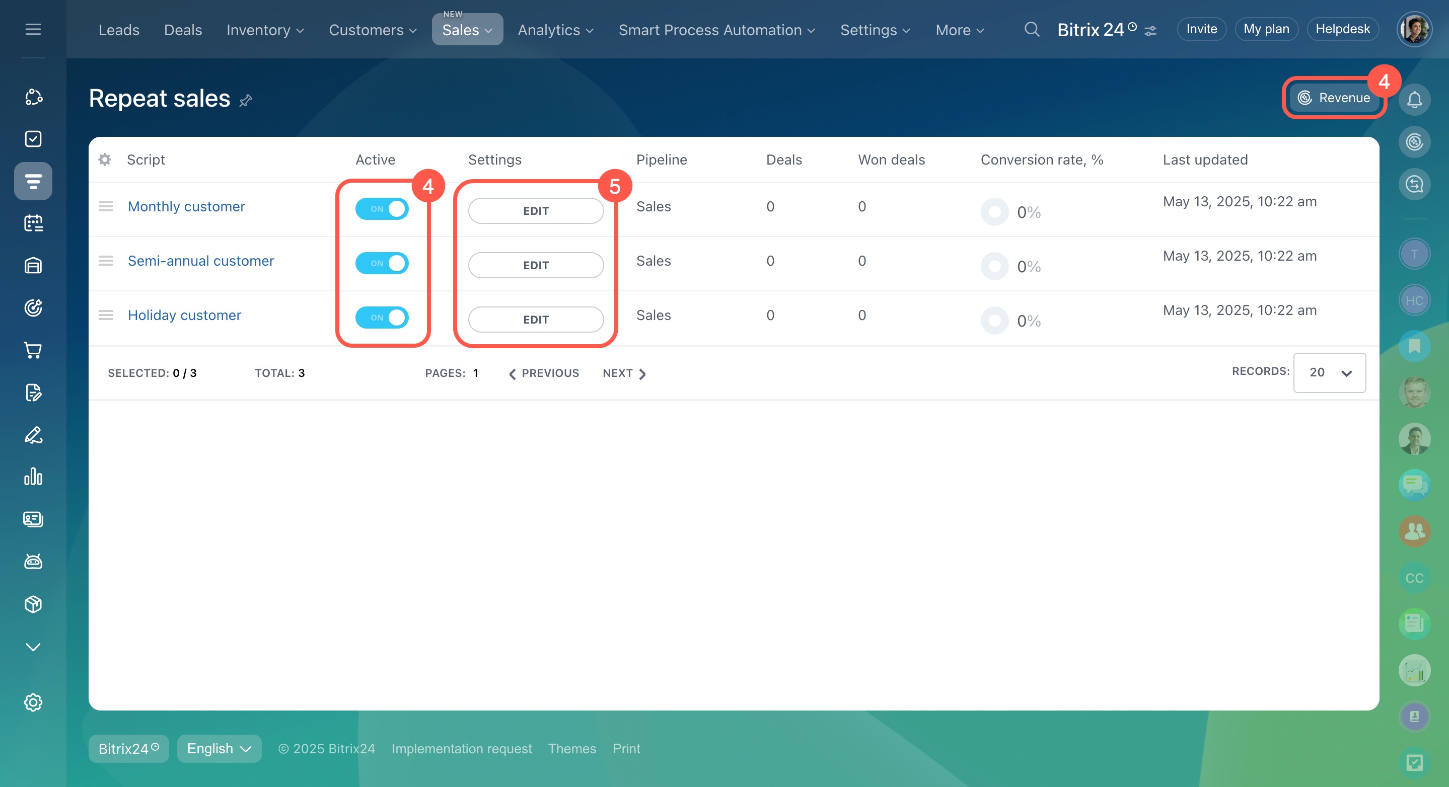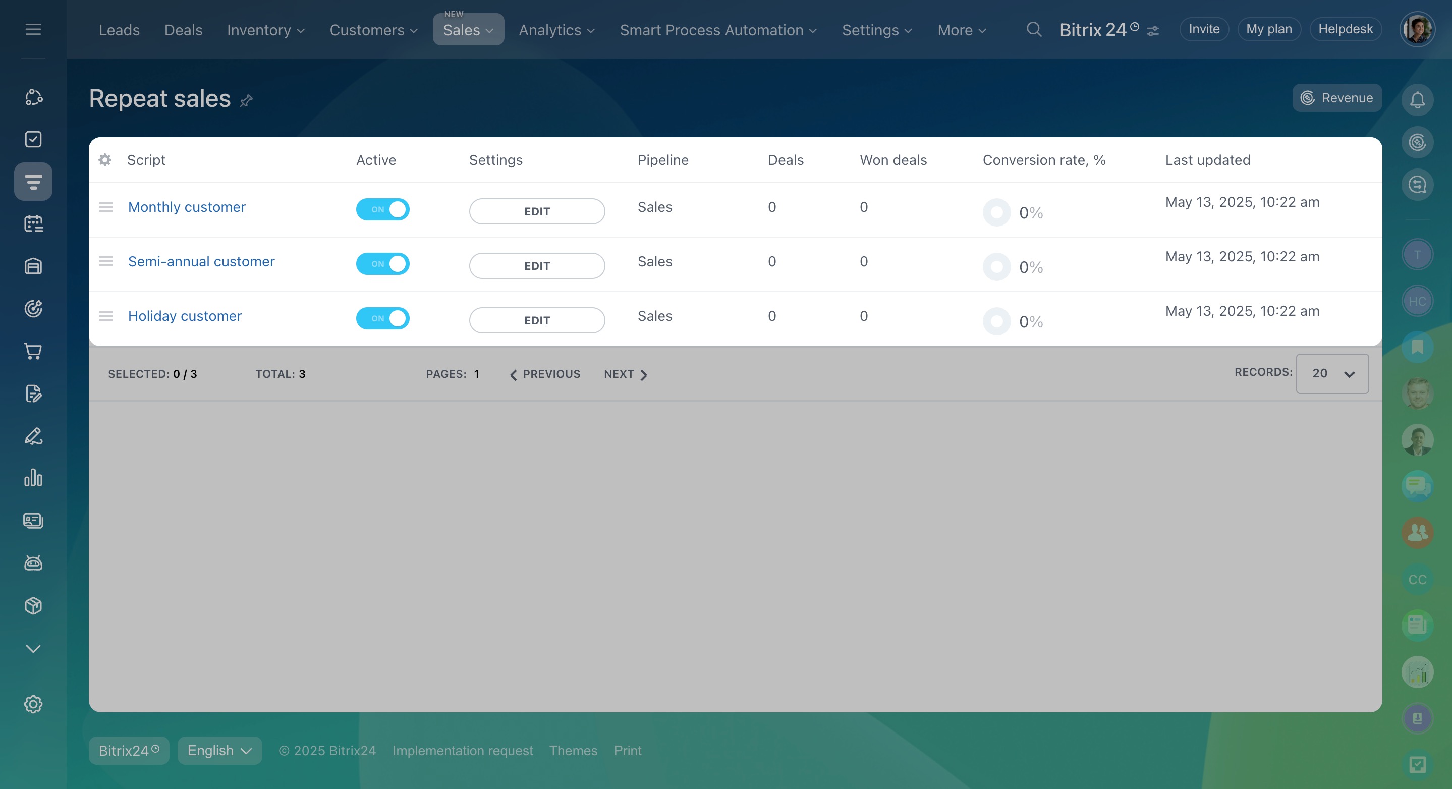 Go to CRM > Sales > Repeat sales and select which scripts will automatically create repeat deals: Monthly customer, Semi-annual customer, or Holiday customer.