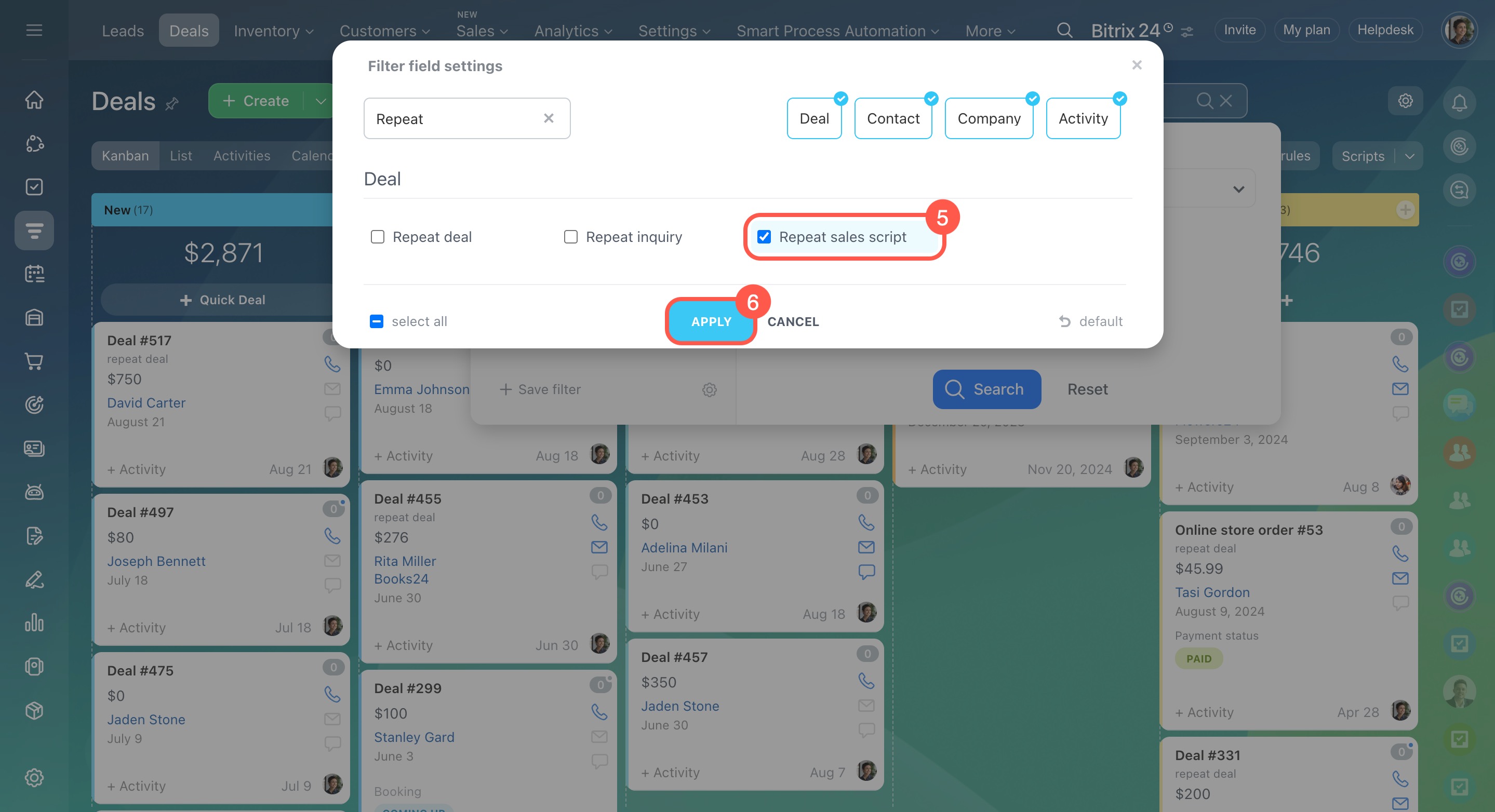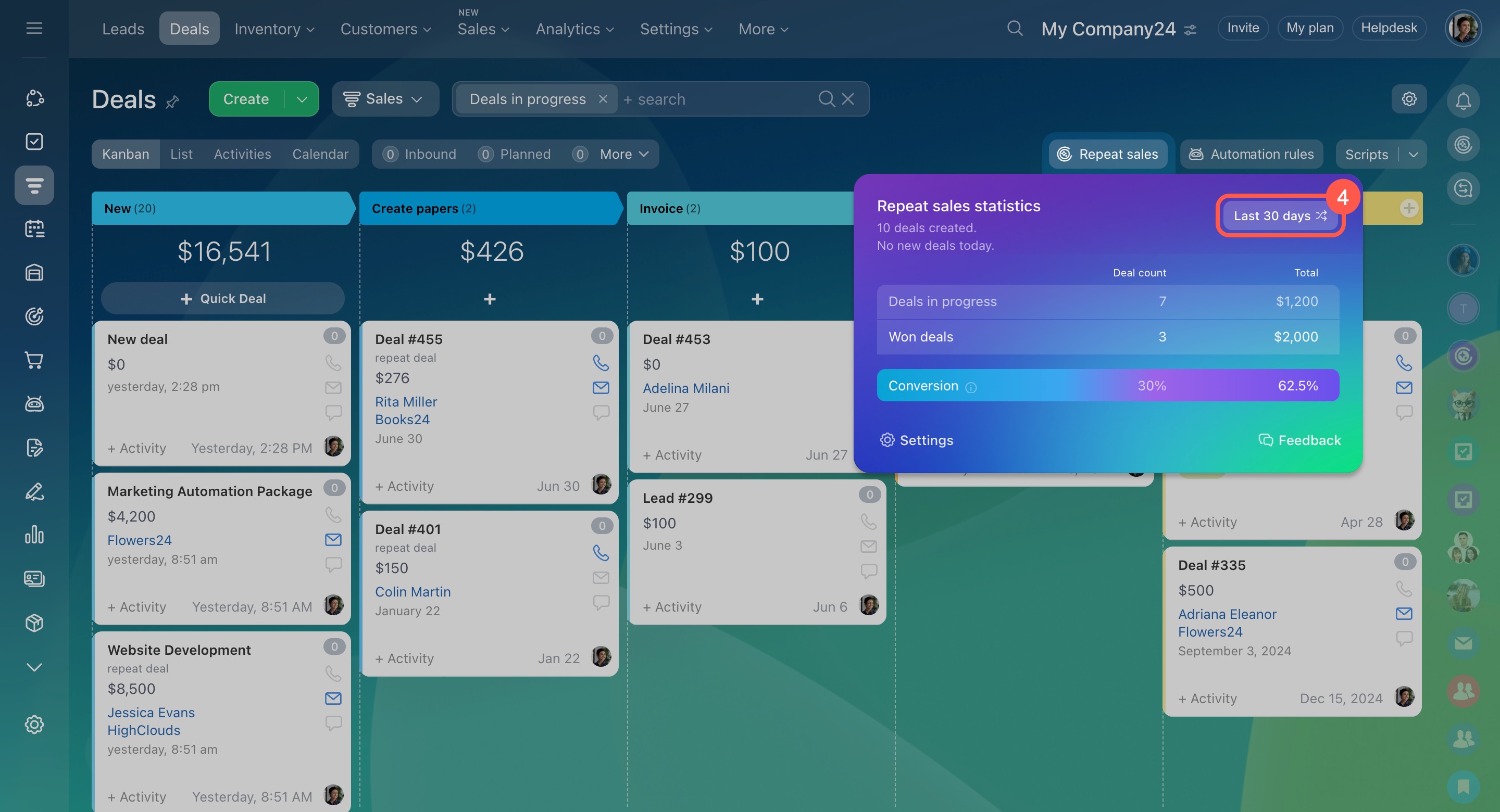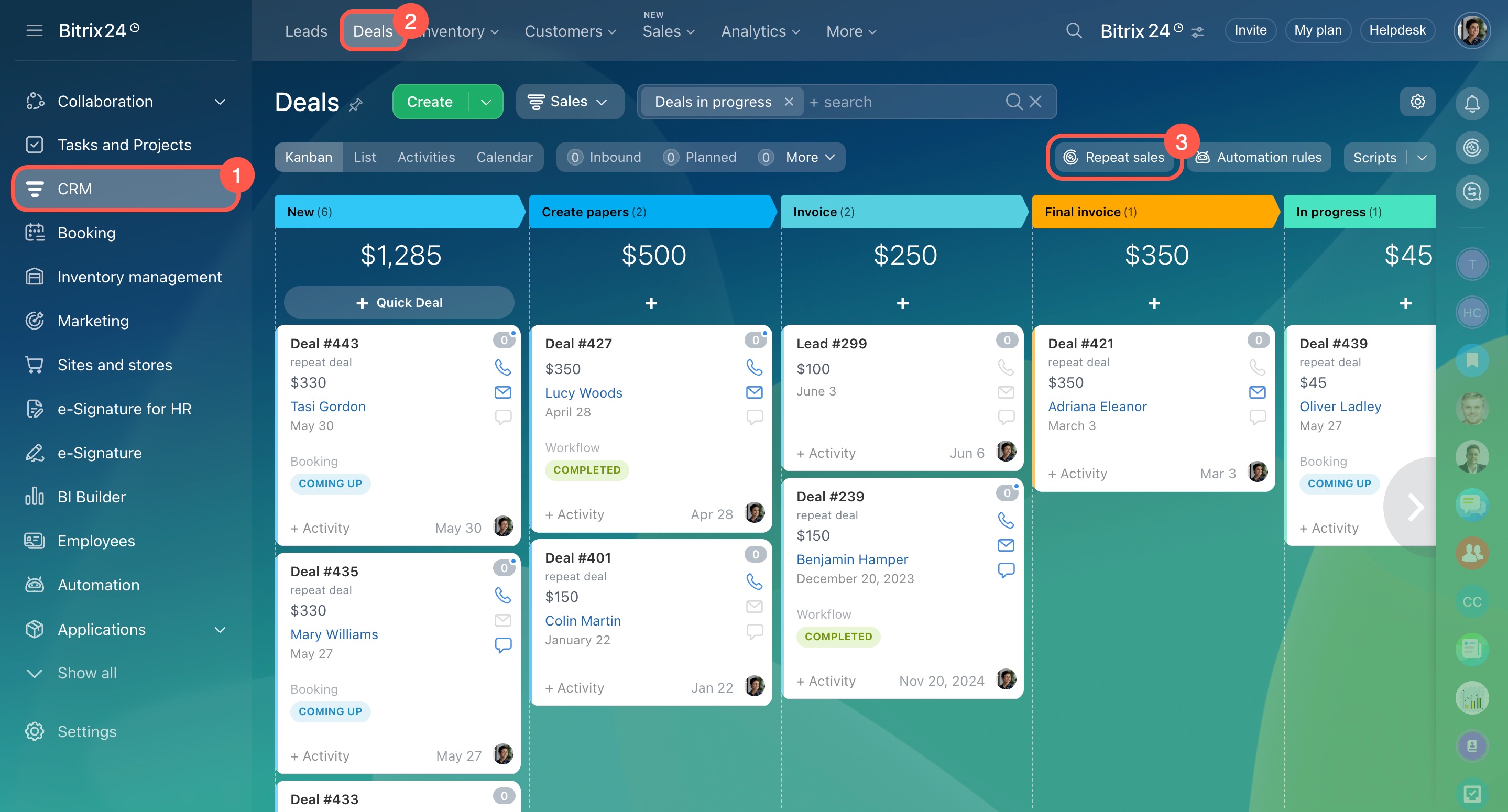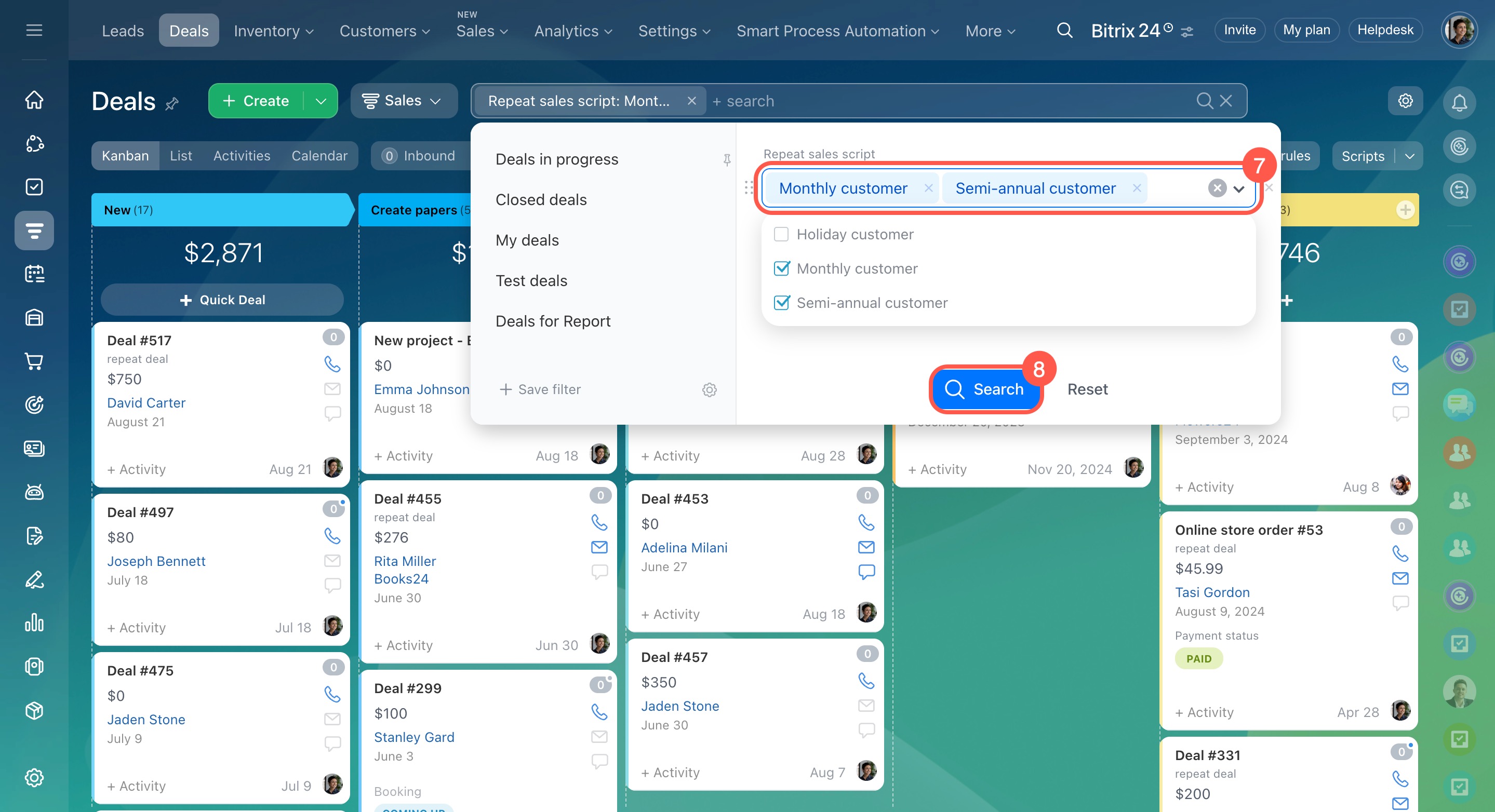 Go to CRM > Sales > Repeat sales and select which scripts will automatically create repeat deals: Monthly customer, Semi-annual customer, or Holiday customer.