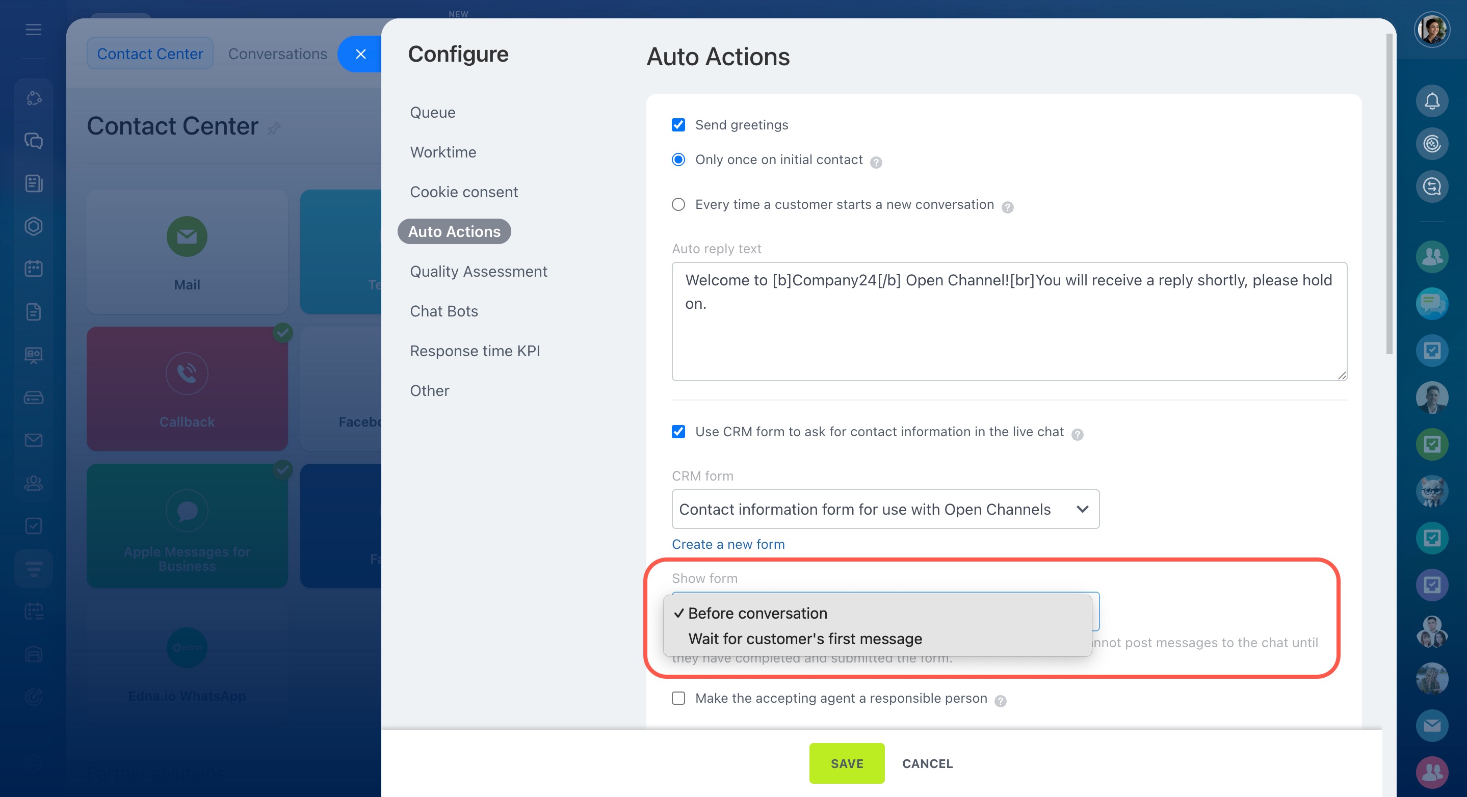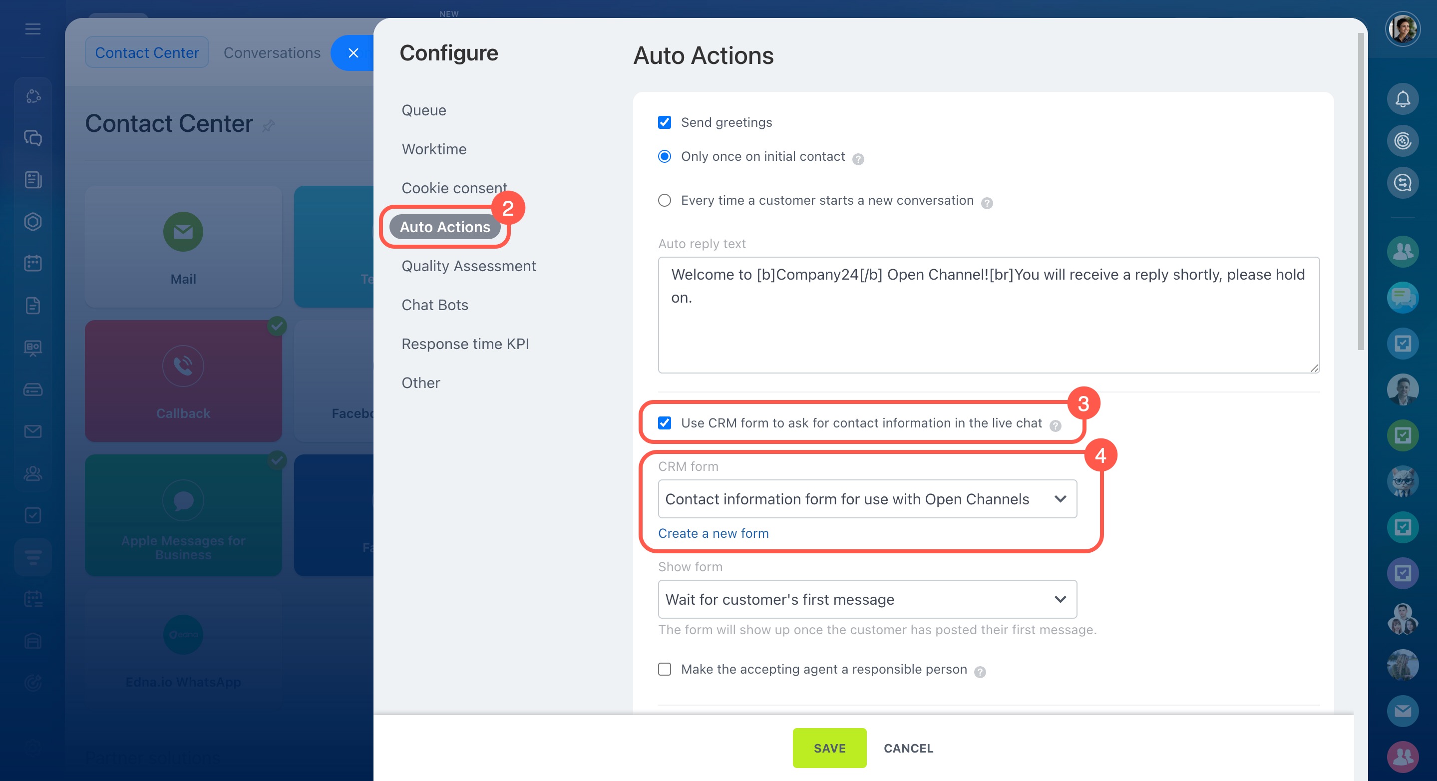 You can enable the CRM form in the Open Channel settings. Open the Auto Actions tab, check the box for Use CRM form to ask for contact information in the live chat, and select or create a CRM form.