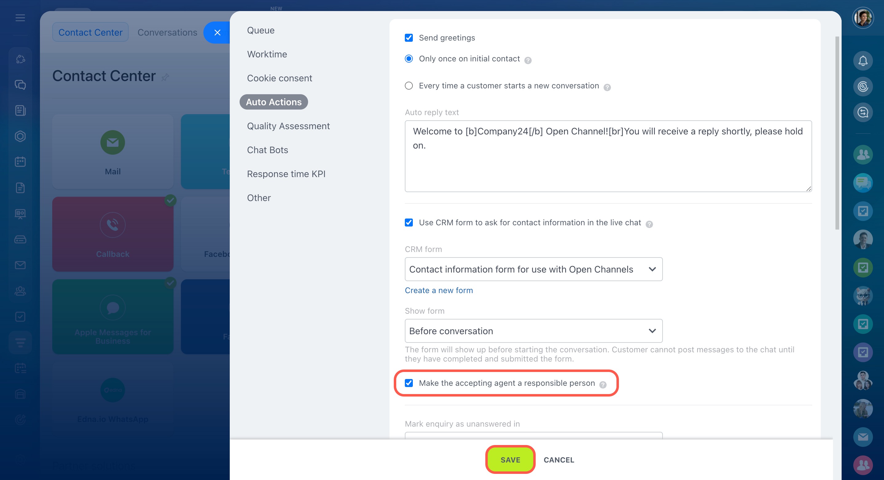When a customer submits the form, a CRM item is created in Bitrix24. By default, the responsible agent is the one set in the CRM form settings. To assign it to the agent who accepted the chat, enable the Make the accepting agent a responsible person option.