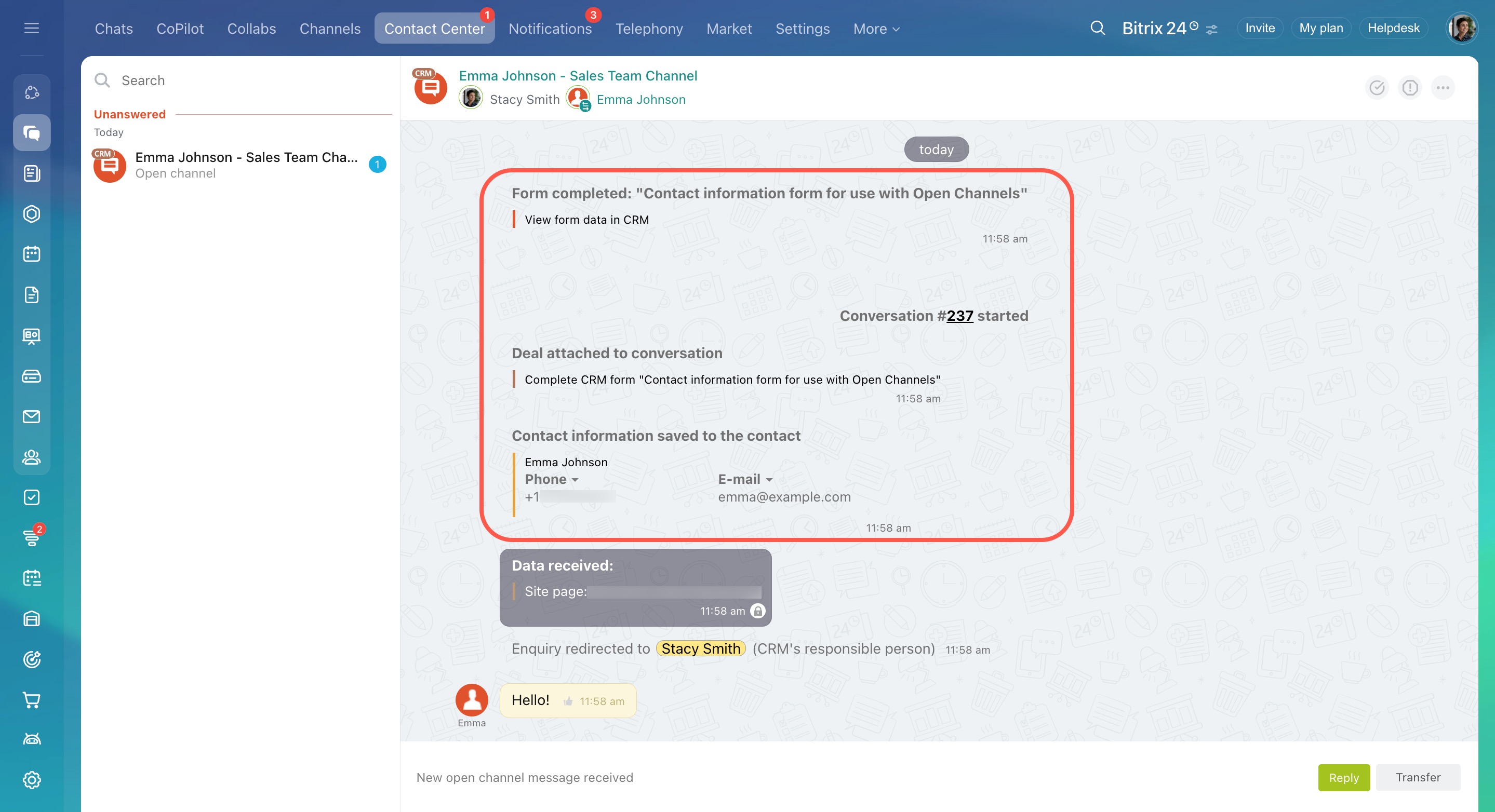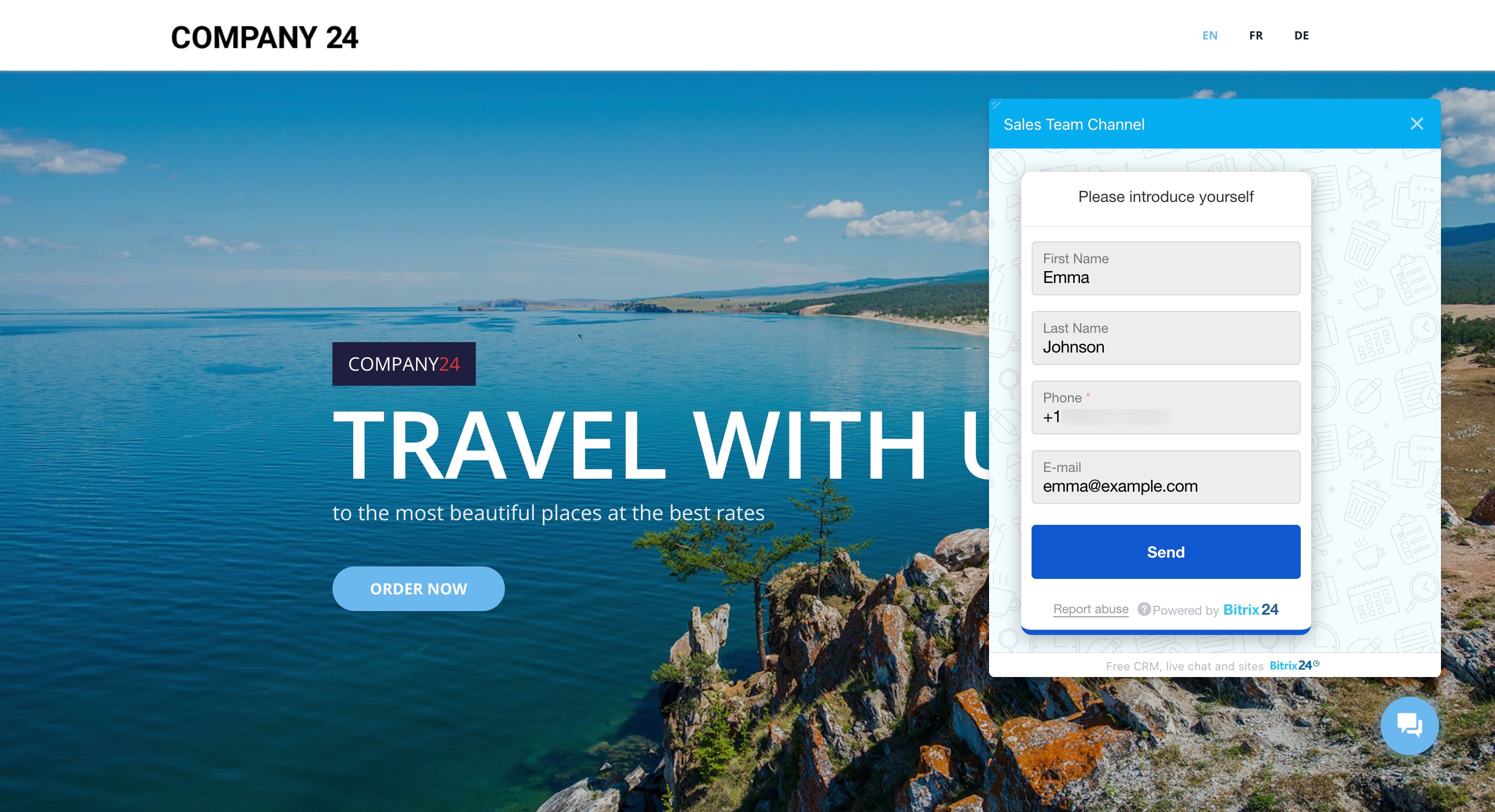 Using the live chat, customers can connect with your company directly on your website. To add them to the CRM and continue the conversation, agents need their contact details. In Bitrix24, you can set up a CRM form to display automatically in the live chat. Once the customer completes the form, their details are saved to the CRM.