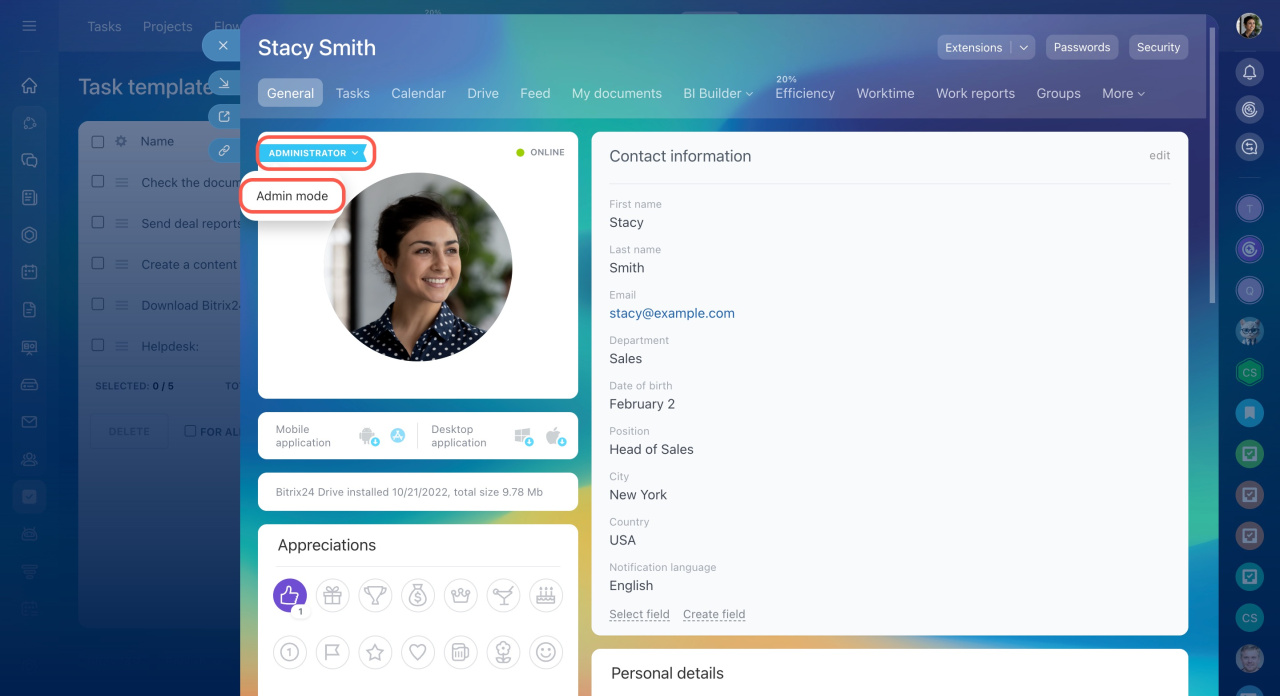 By default, Bitrix24 administrators can only see task templates they created or have access to. To view all templates, enable Admin mode.
