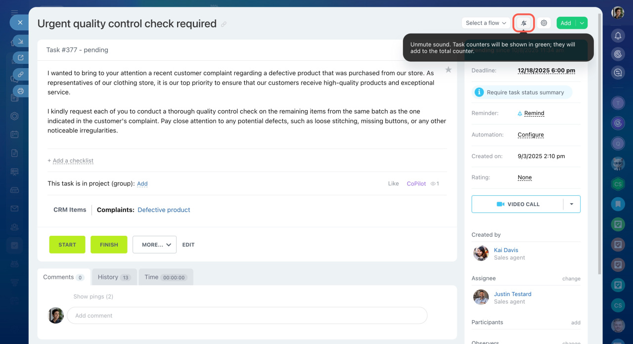 Notifications for task observers are muted by default. Observers don't receive updates but see a gray counter for unread comments. This helps avoid unnecessary distractions since observers aren’t directly involved in the task but can check its progress at any time.