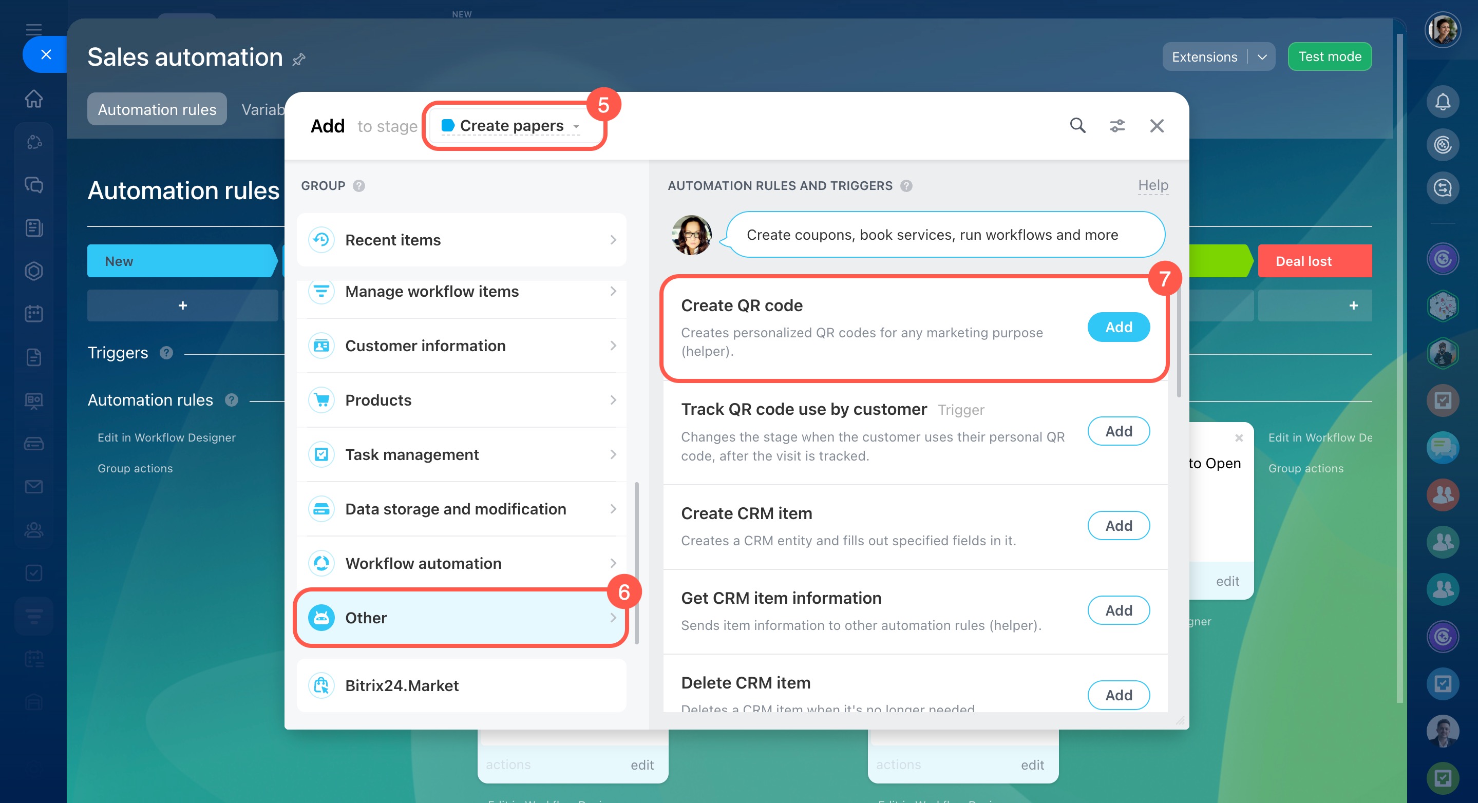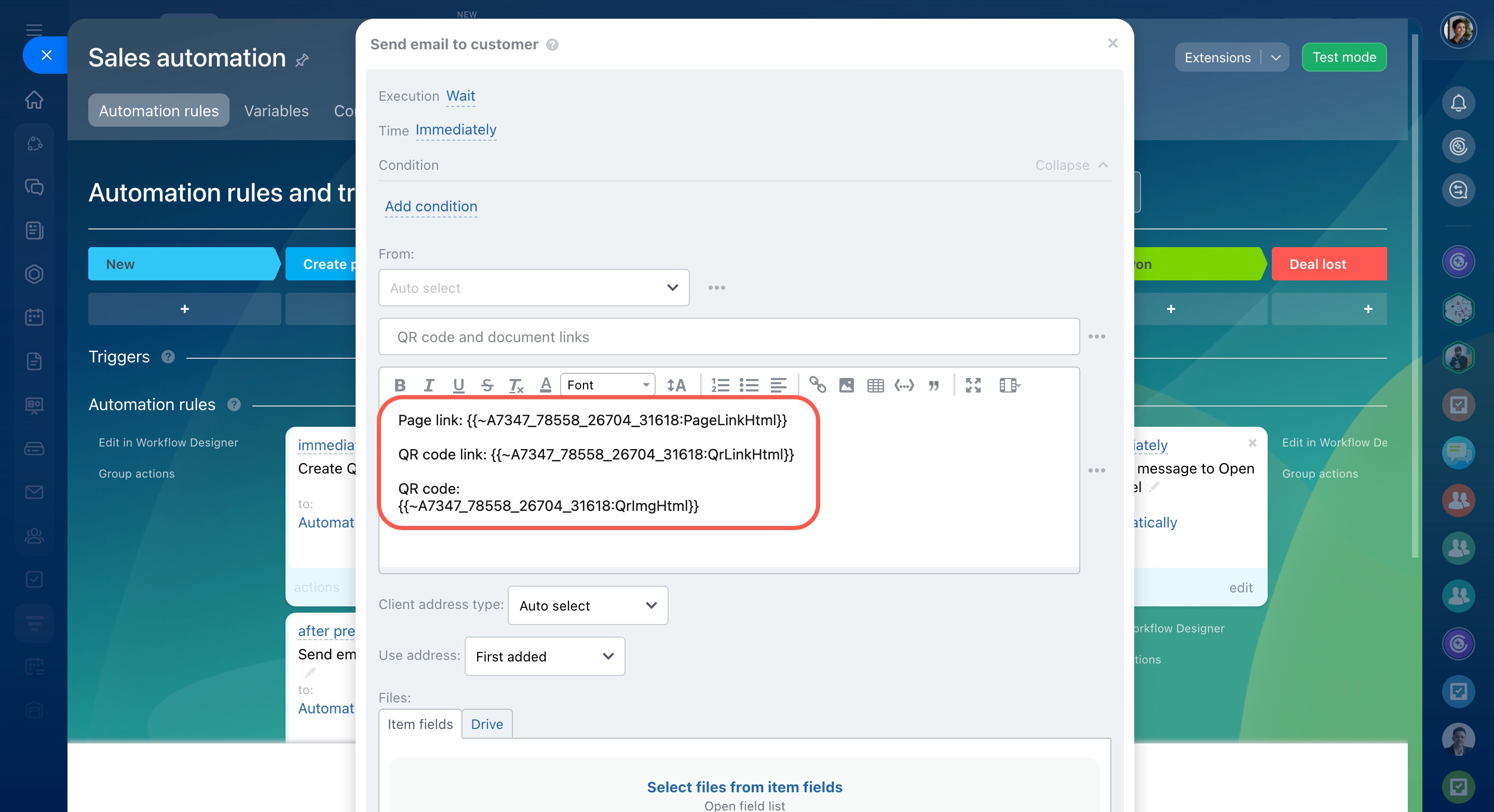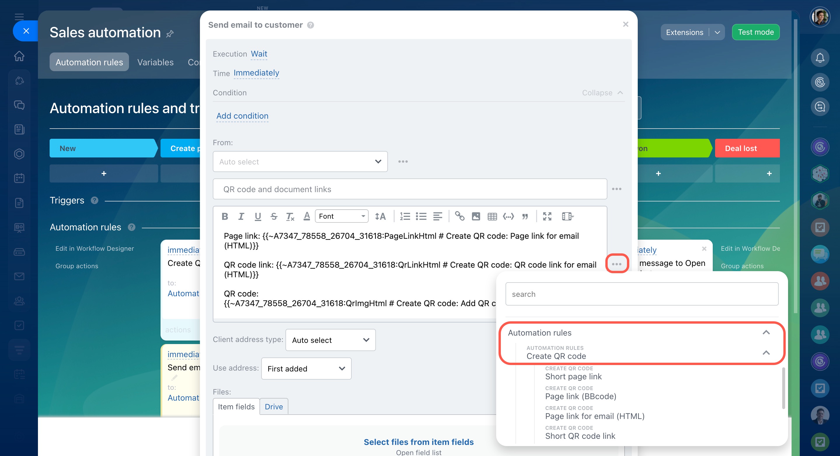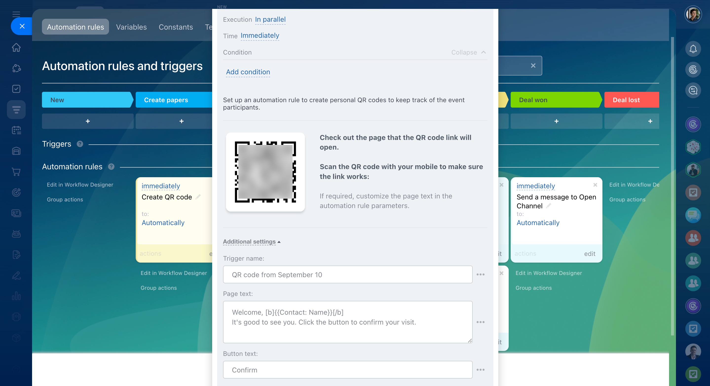 You can send QR codes generated by the automation rule to your customers by email or SMS, add them to deal comments, etc.