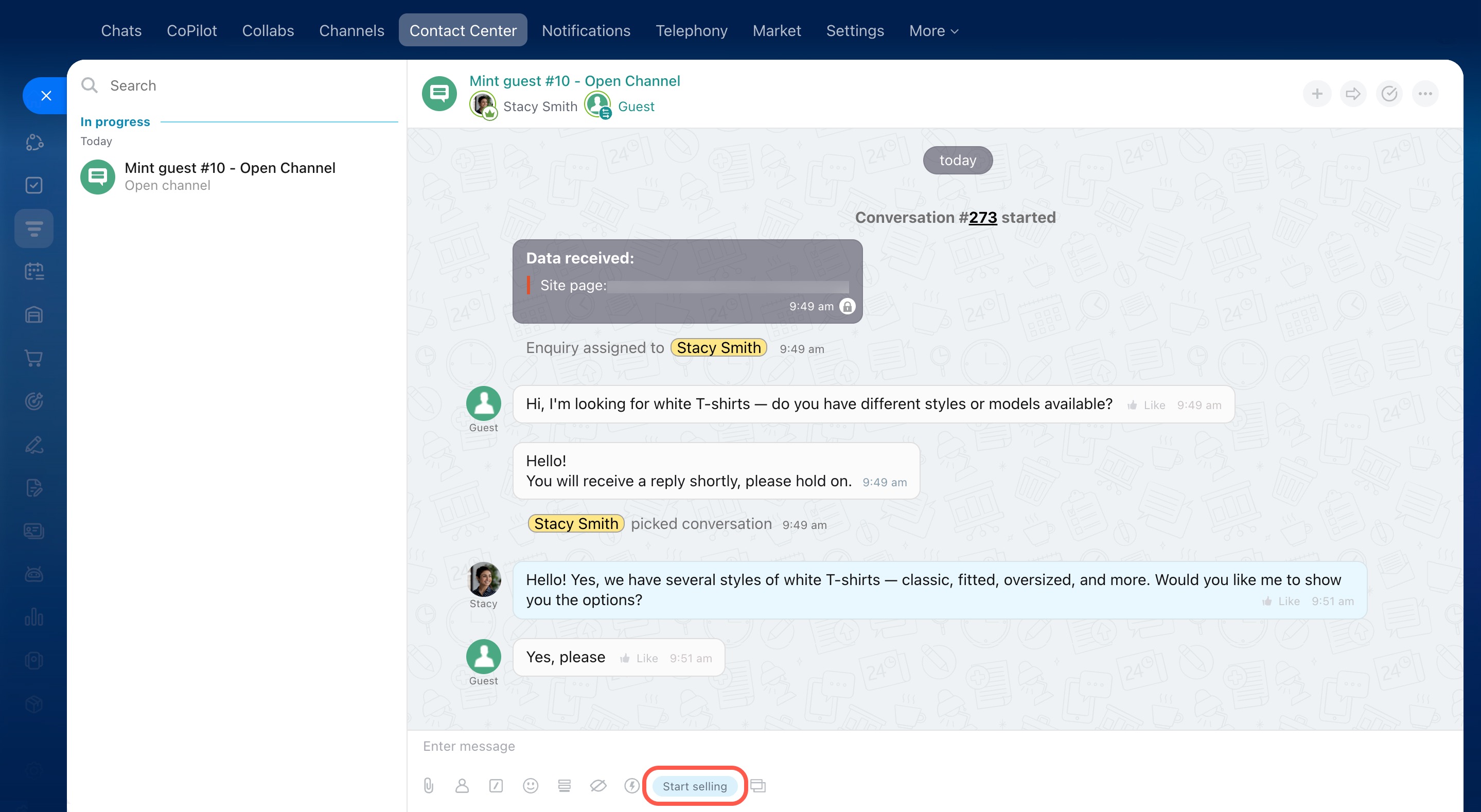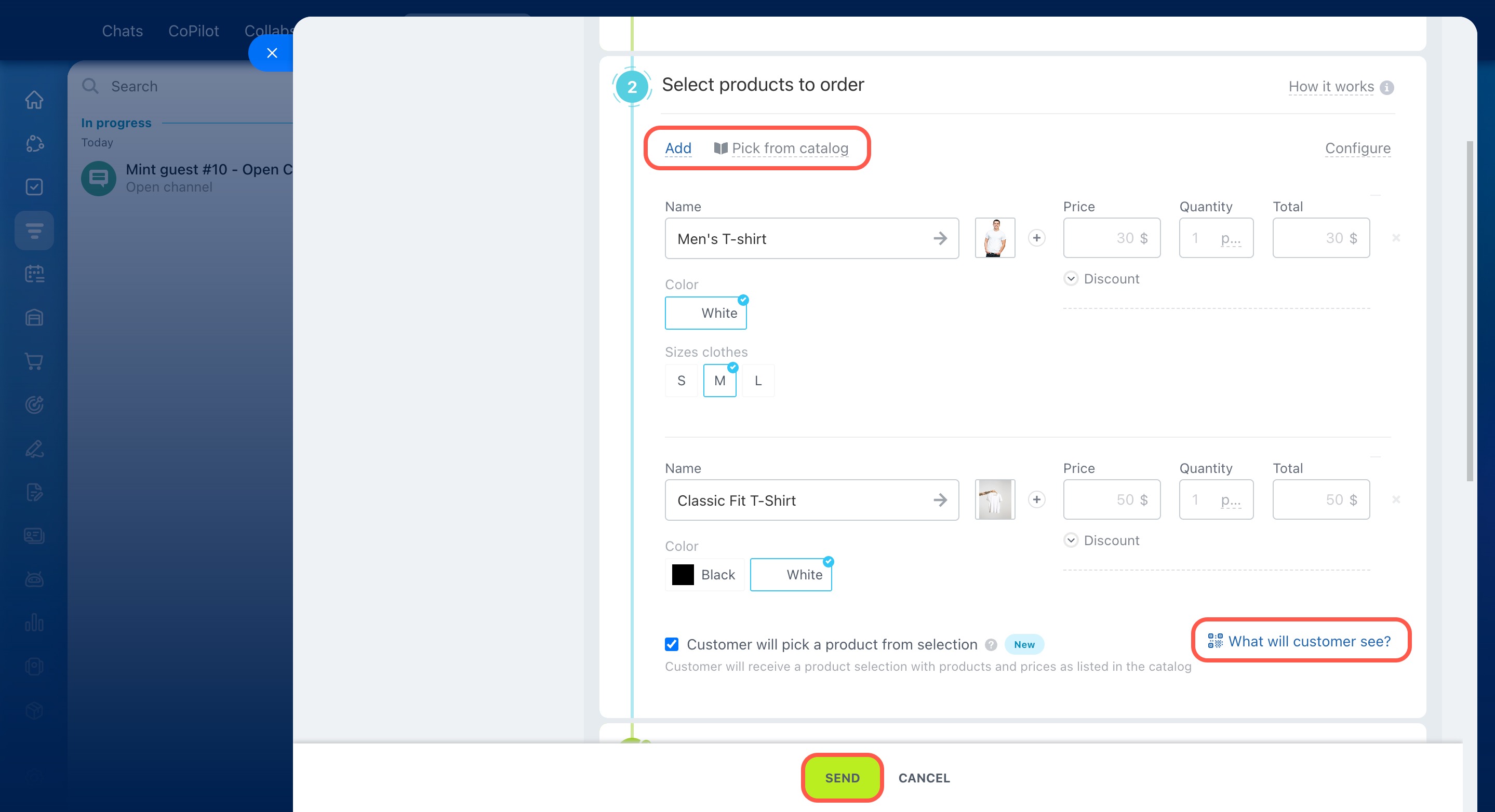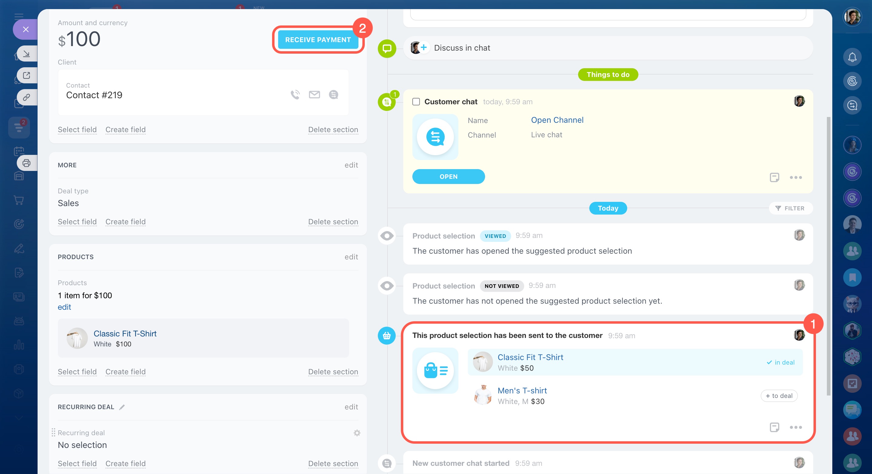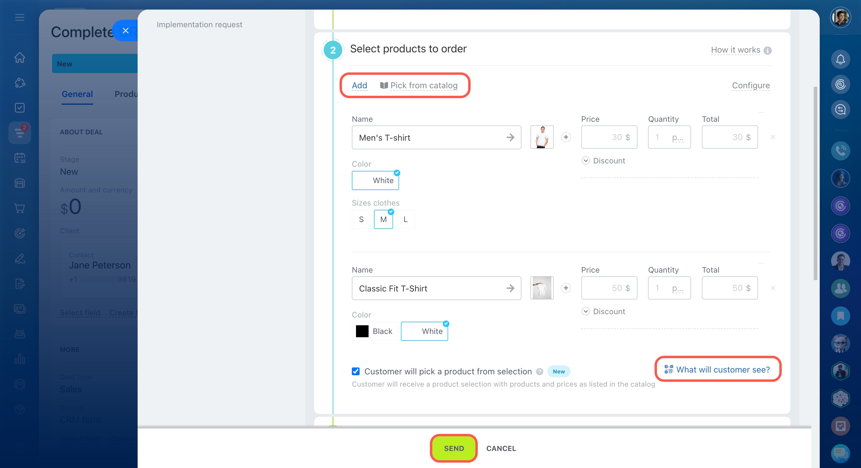 For example, if a customer is looking for white T-shirts, a manager puts together a few options and shares a link. After the customer makes a choice, the selected product appears in the deal form.