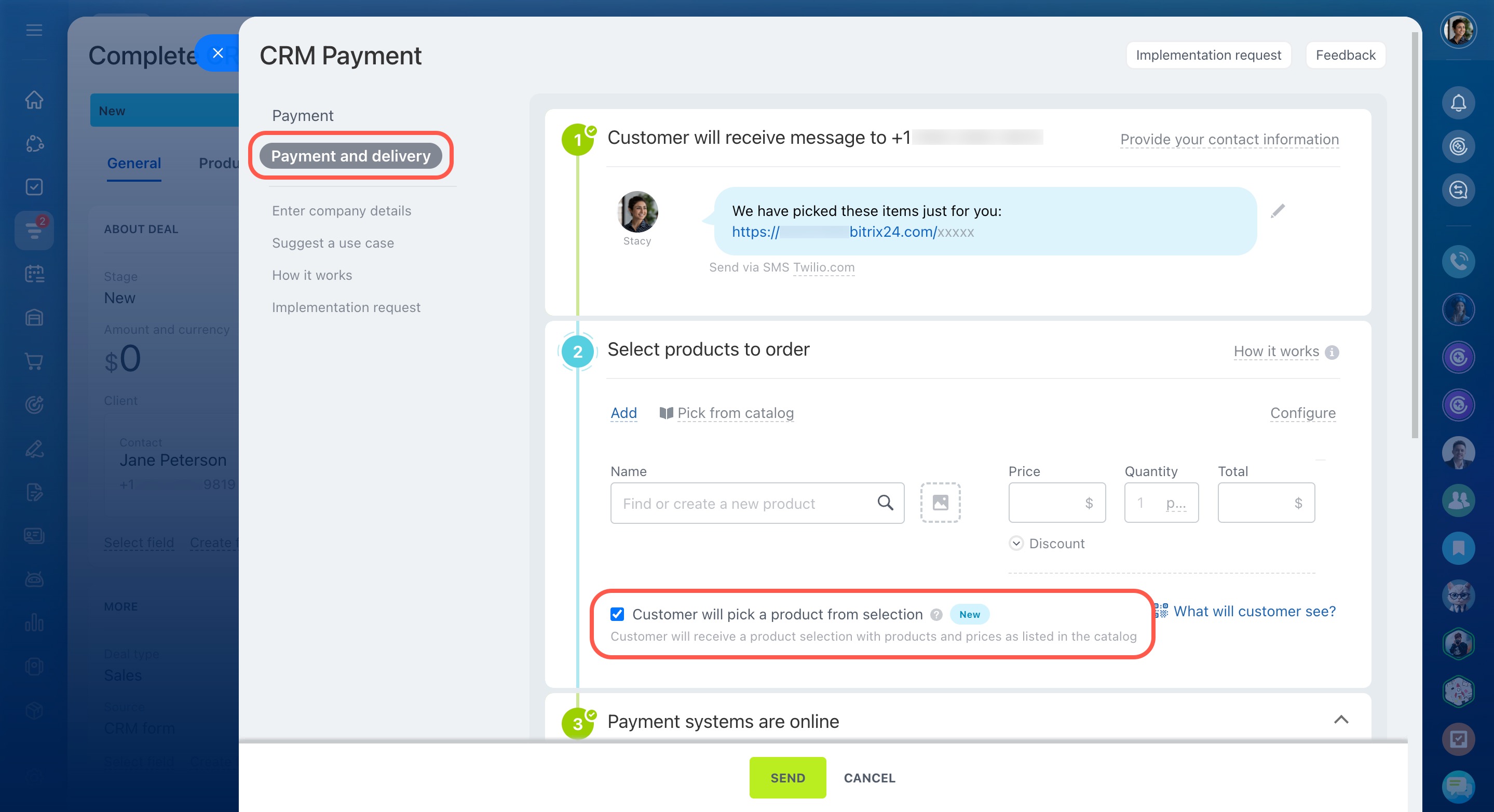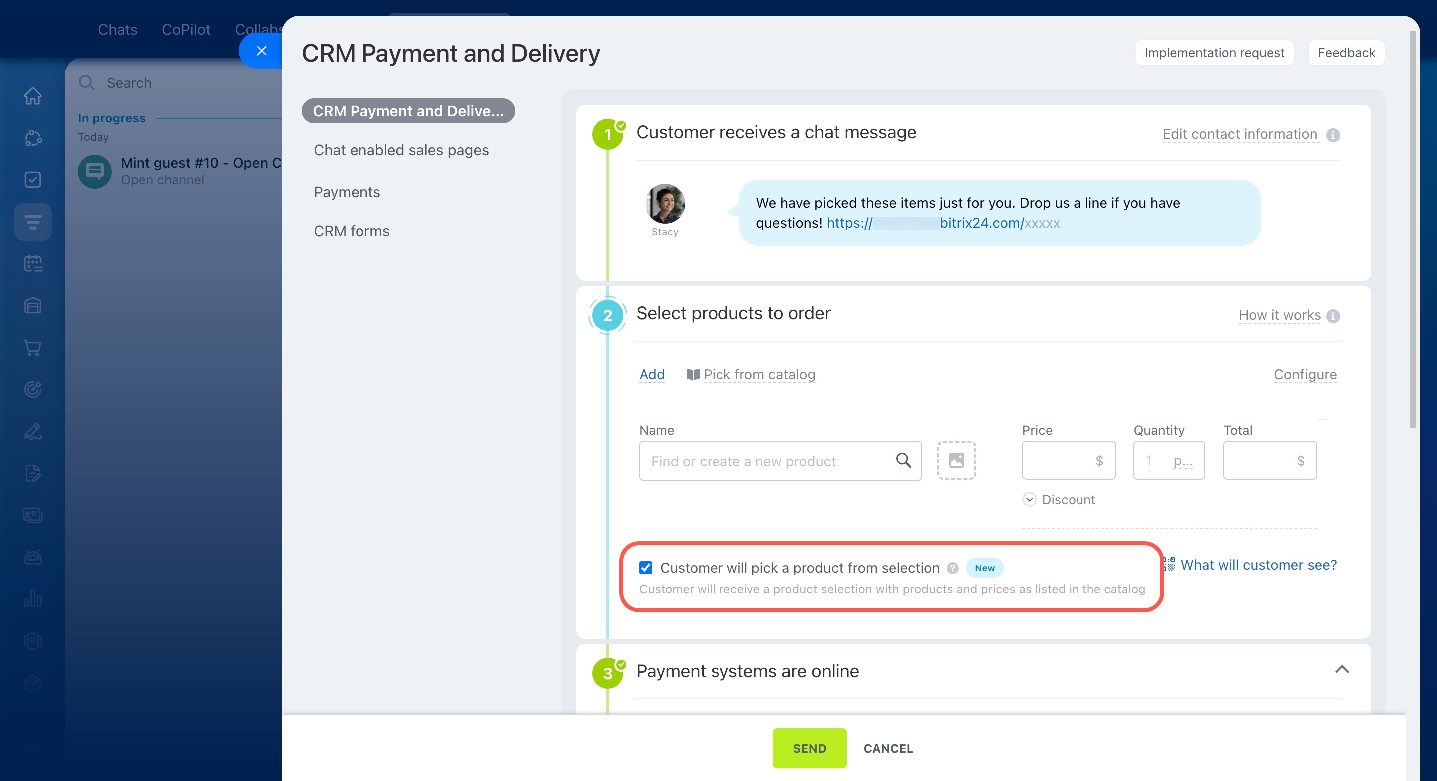 In Bitrix24, you can send customers a personalized selection of products, allowing them to choose what to order and pay online right away.
