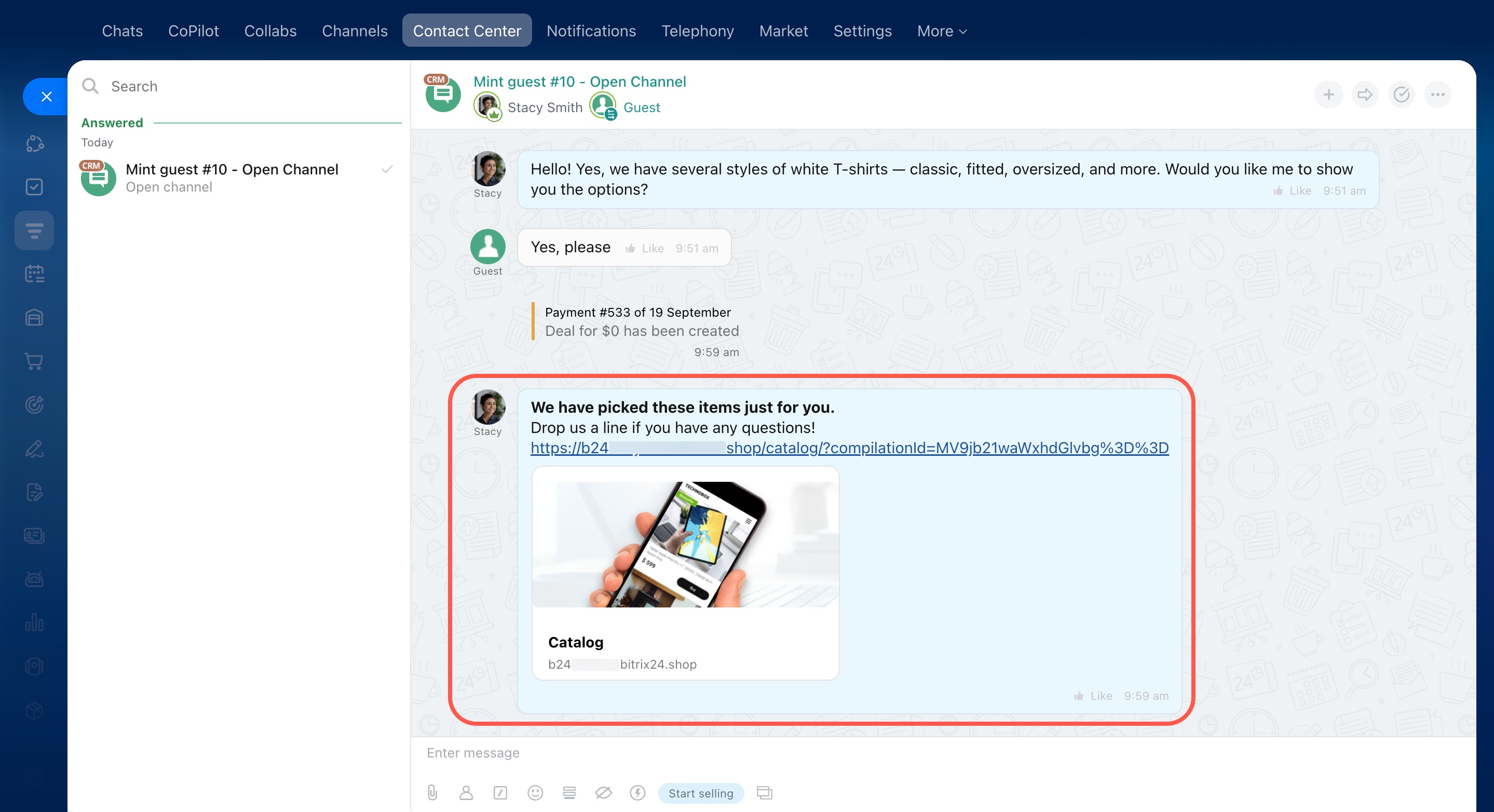 For example, a customer contacts you through your website widget or on WhatsApp. In Bitrix24, you’ll see their message and can send them a product selection.
