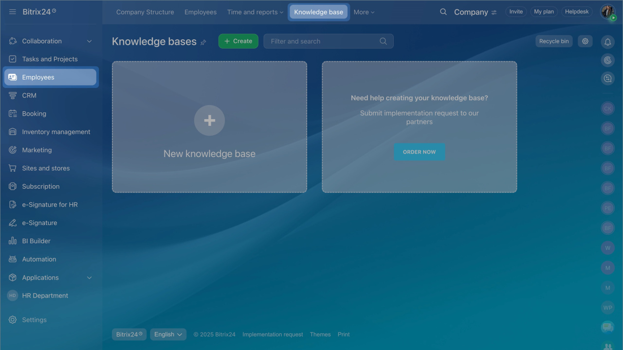 By default, all your company employees have full access to all company knowledge bases. You can configure access permissions to all knowledge bases or to the specific knowledge base.
