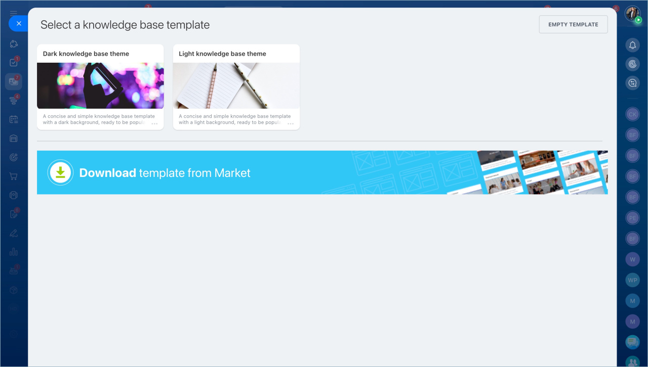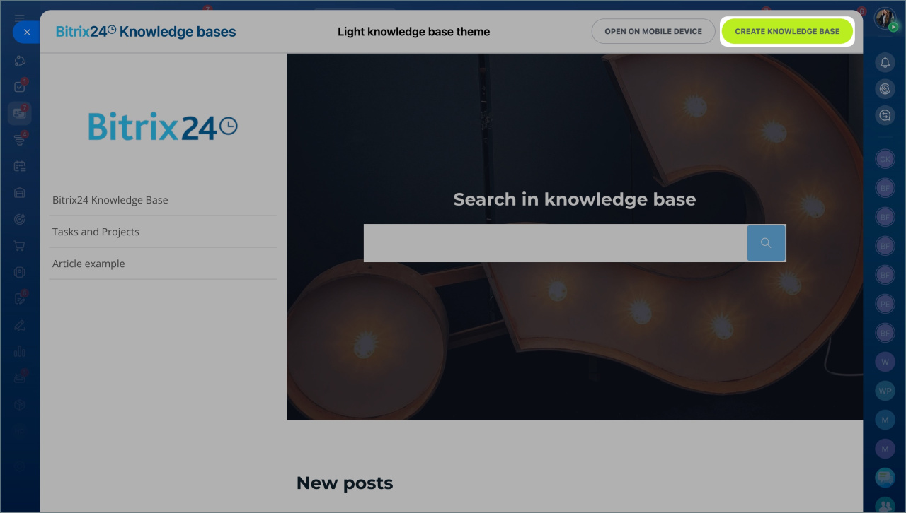 - Specify the knowledge base name and description, select a color theme and click Create.