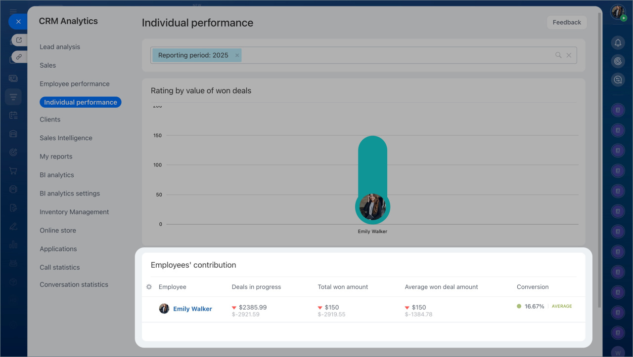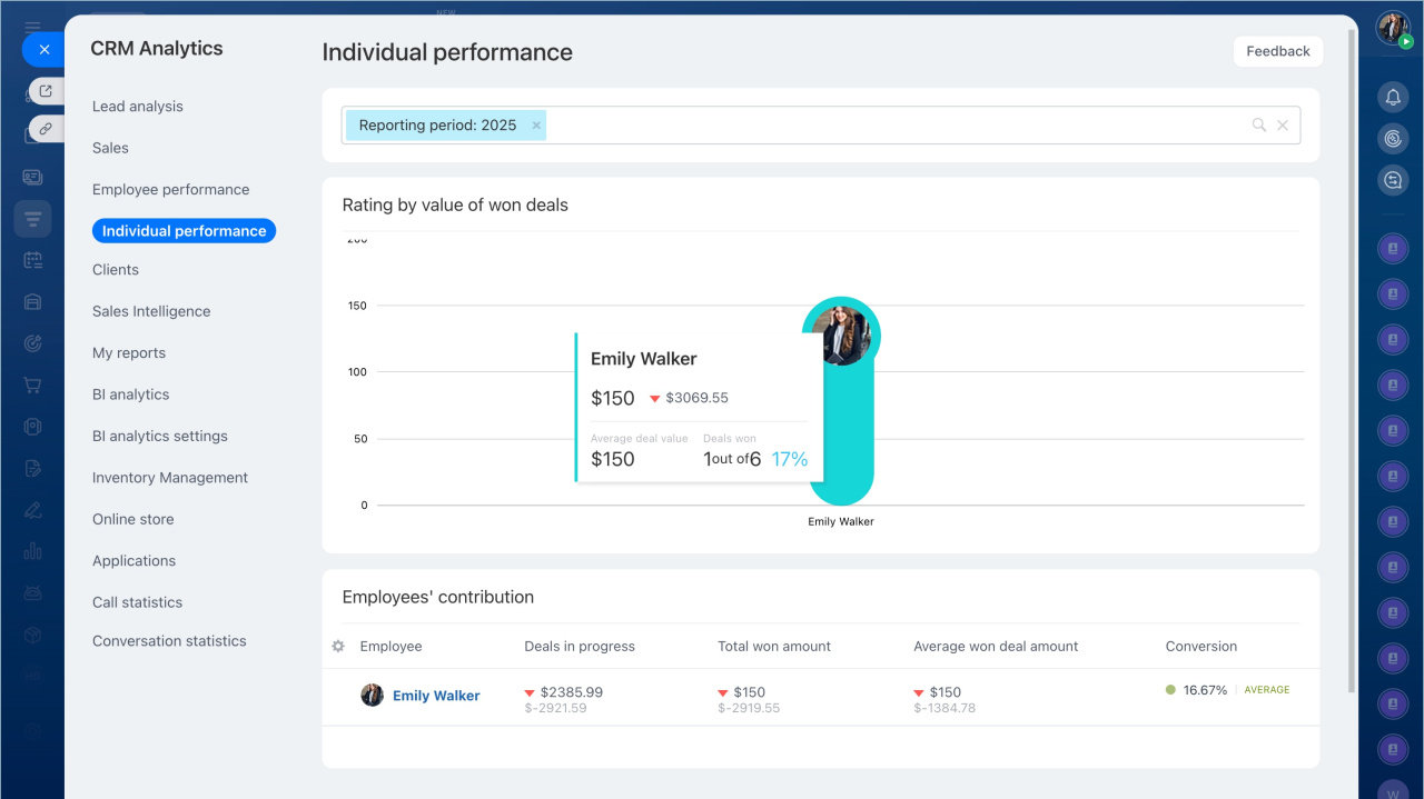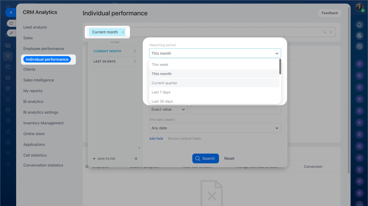 The individual performance report allows you to rank sales managers based on the number of won deals. Use this report to assess each manager's work results.