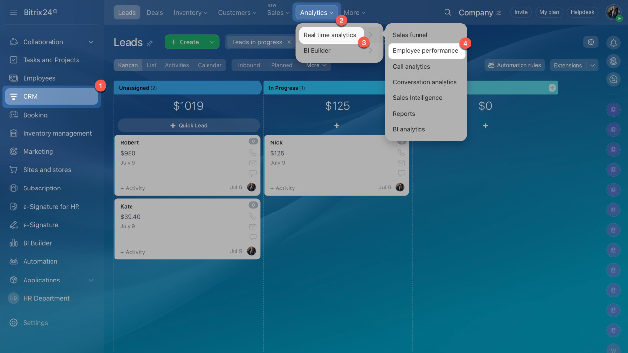 - Go to the CRM section > Analytics > Real time analytics > Employee performance.