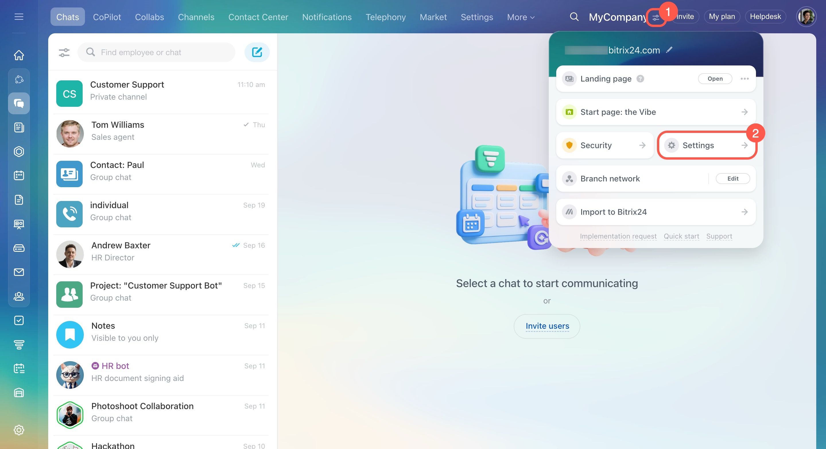 The Settings section lets you manage Bitrix24 in one place. Administrators can enable only the tools your company needs, change the account address, name, and logo, and choose a theme. This article answers the most common questions about Bitrix24 settings.