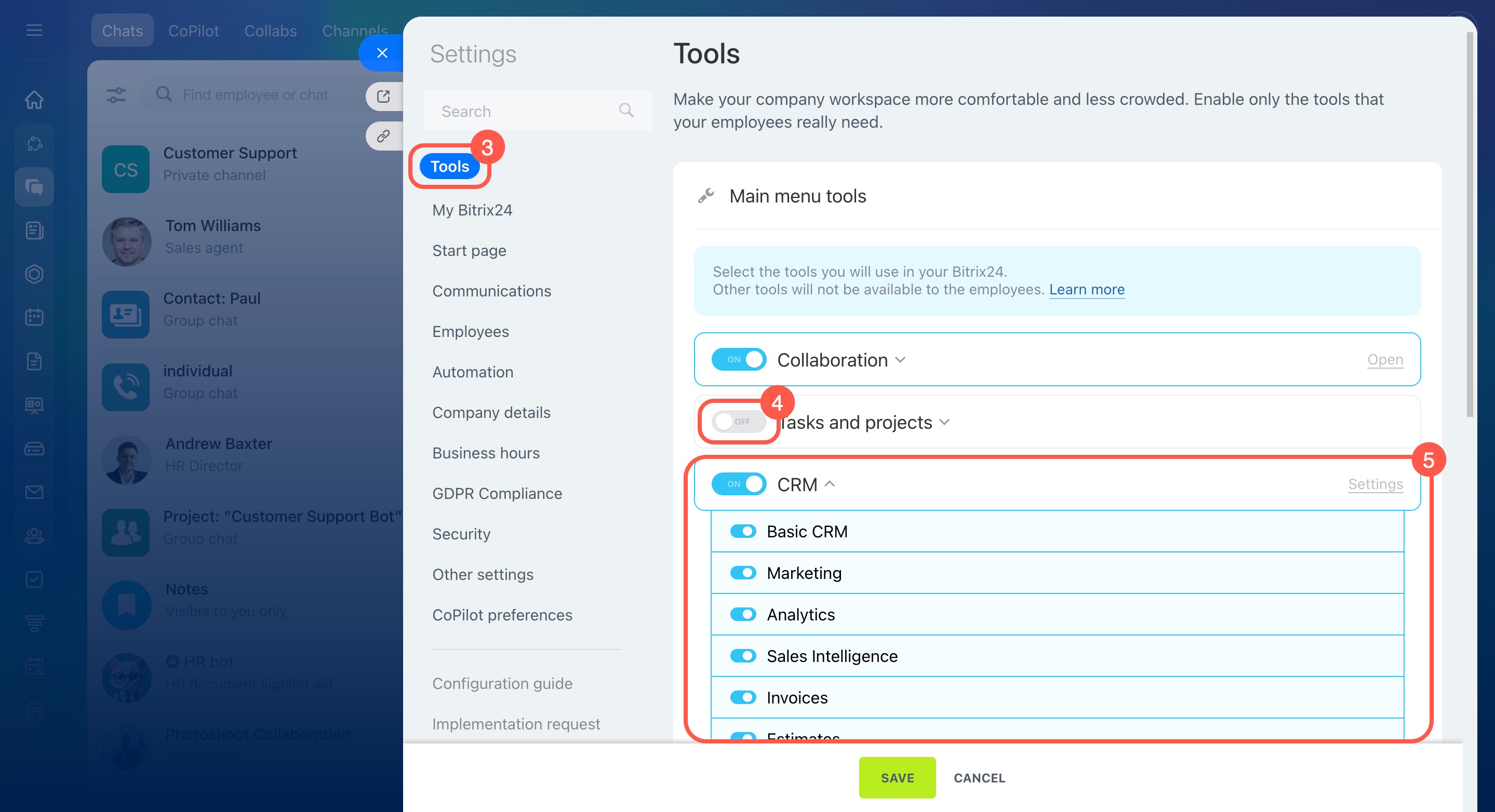 If you disable a tool in Bitrix24 settings, it will be turned off for everyone in the company.