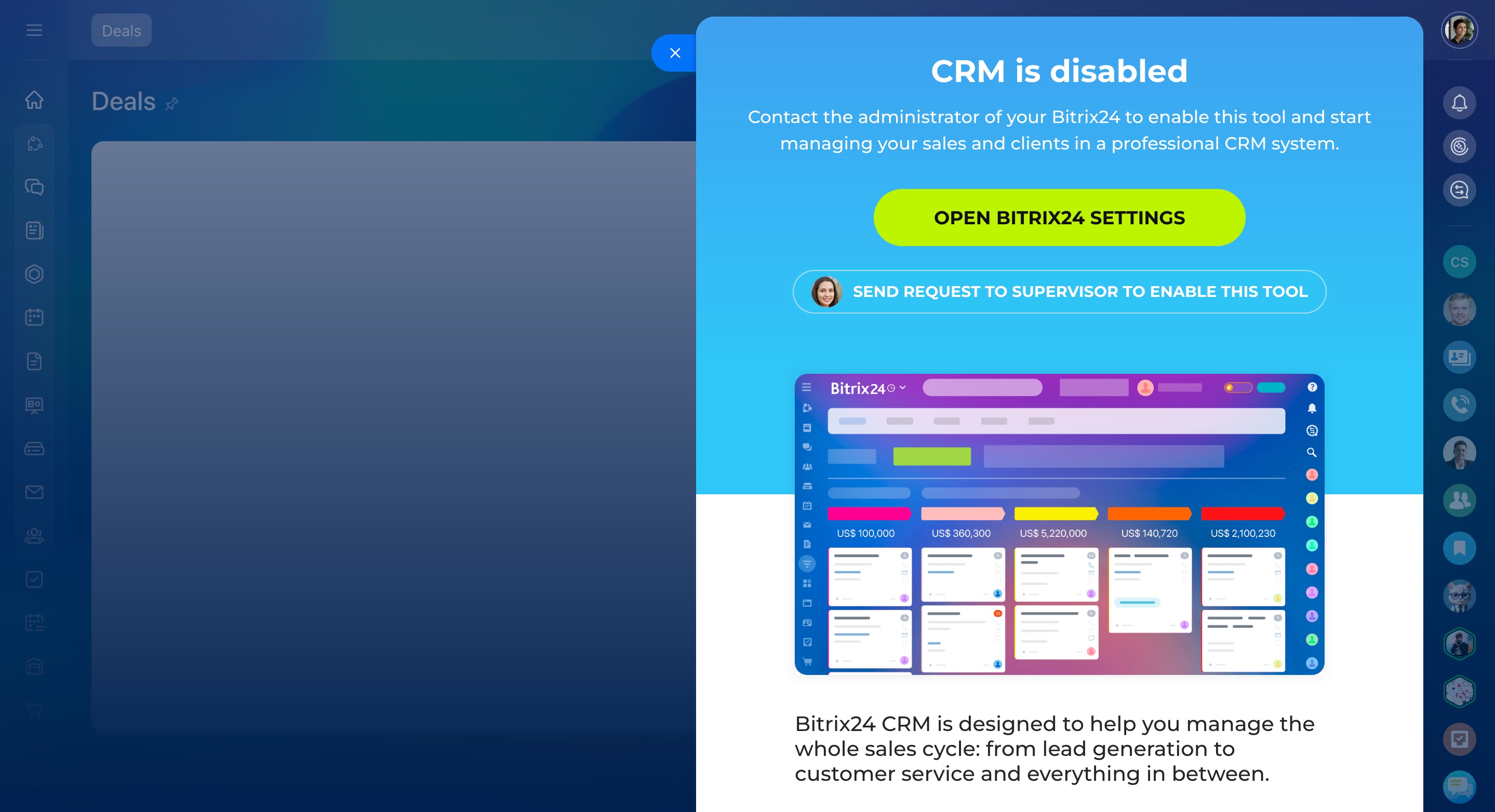 For example, if you disable CRM, it will no longer appear in the main menu. If someone tries to open CRM using a direct link, they’ll see a notification that the tool is disabled.