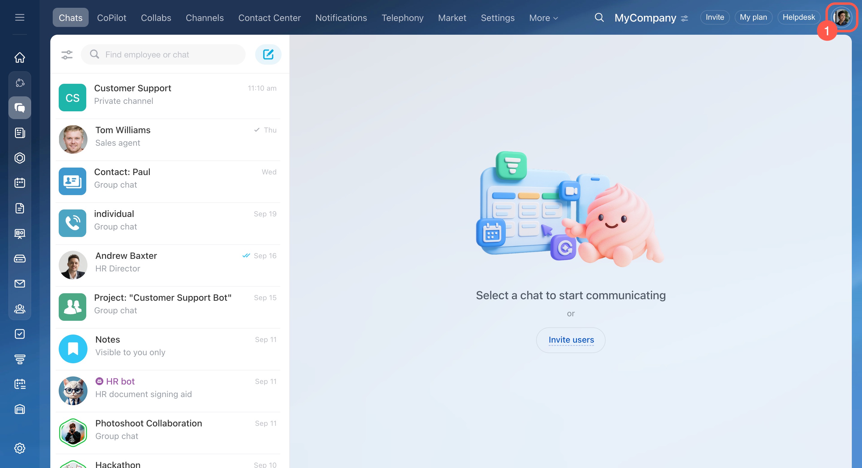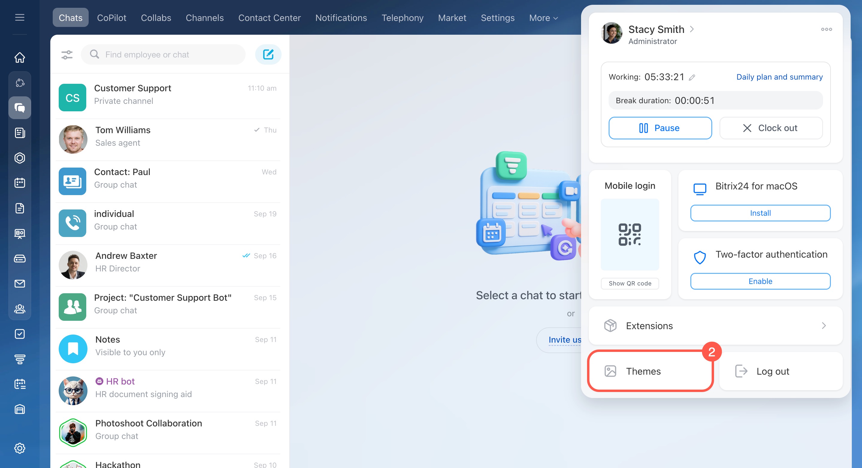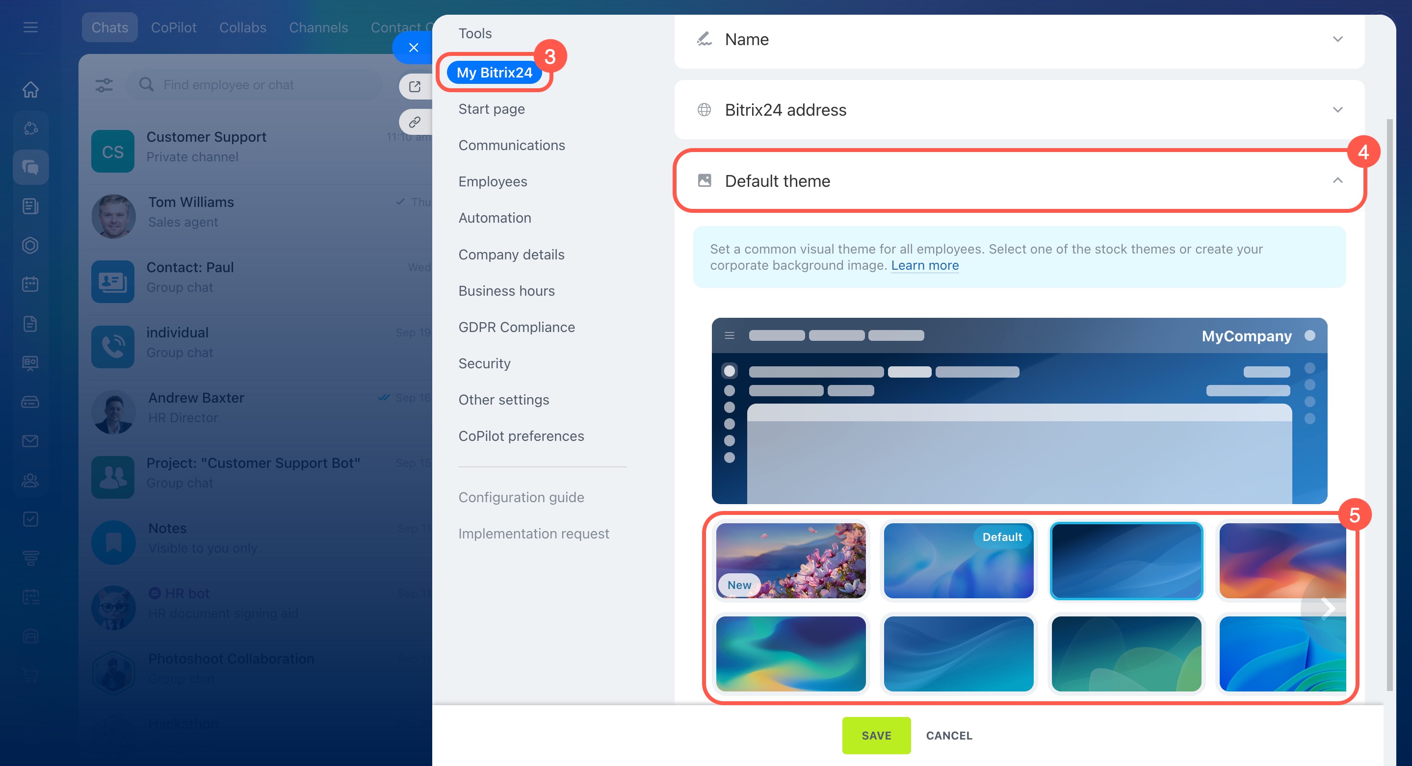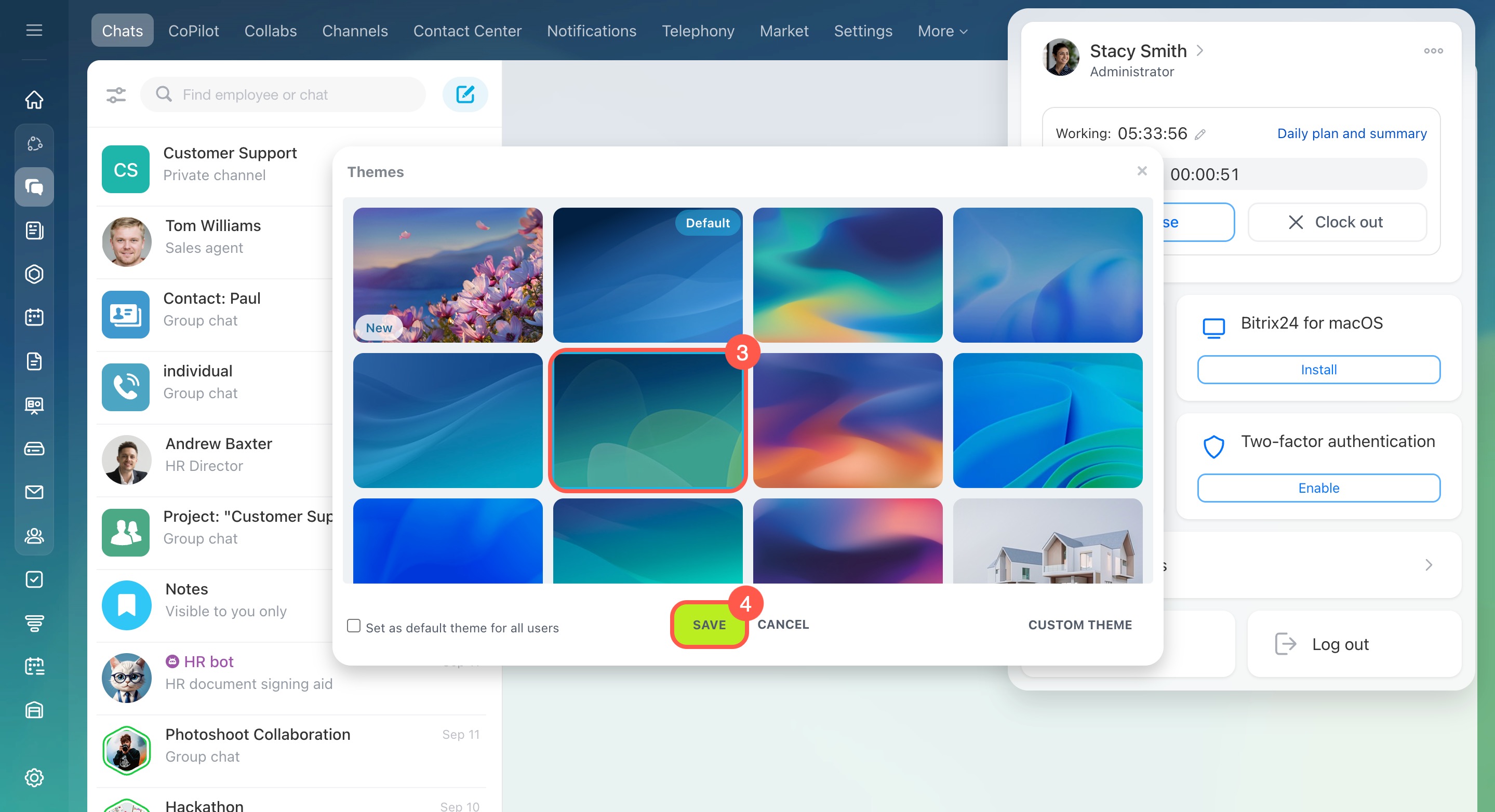 - Choose a theme or upload your own. All employees in your Bitrix24 will see it.