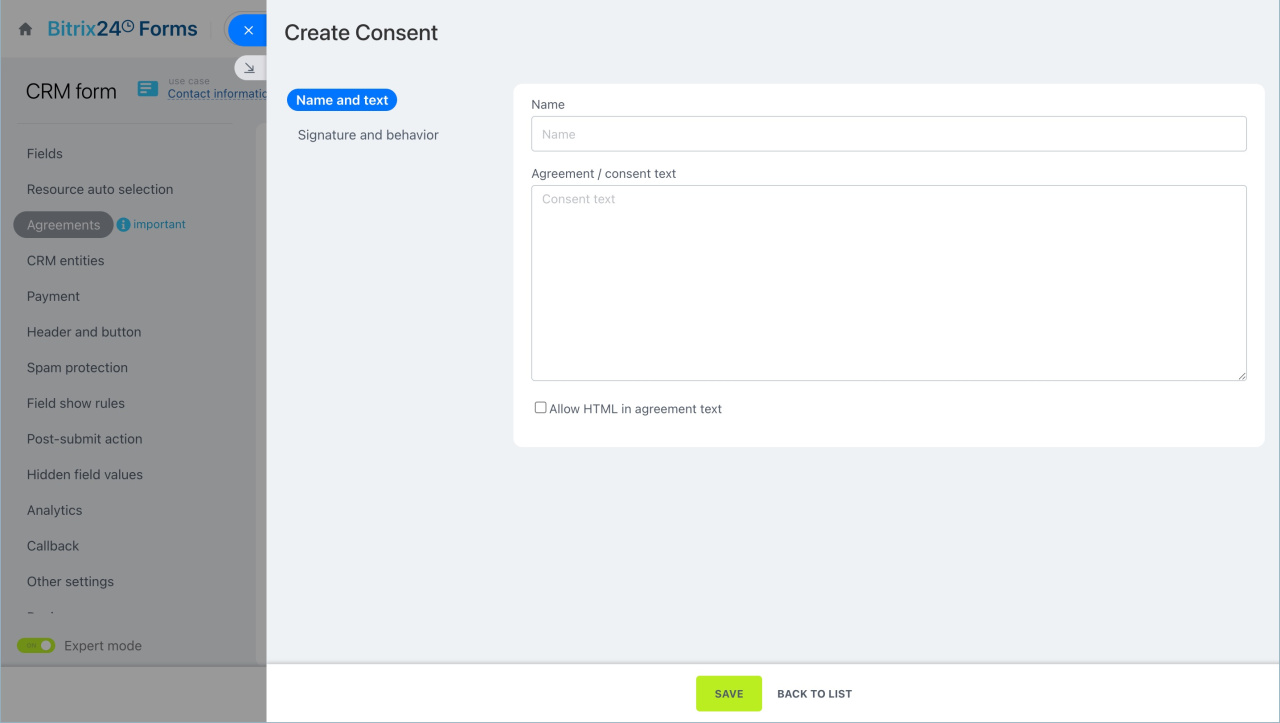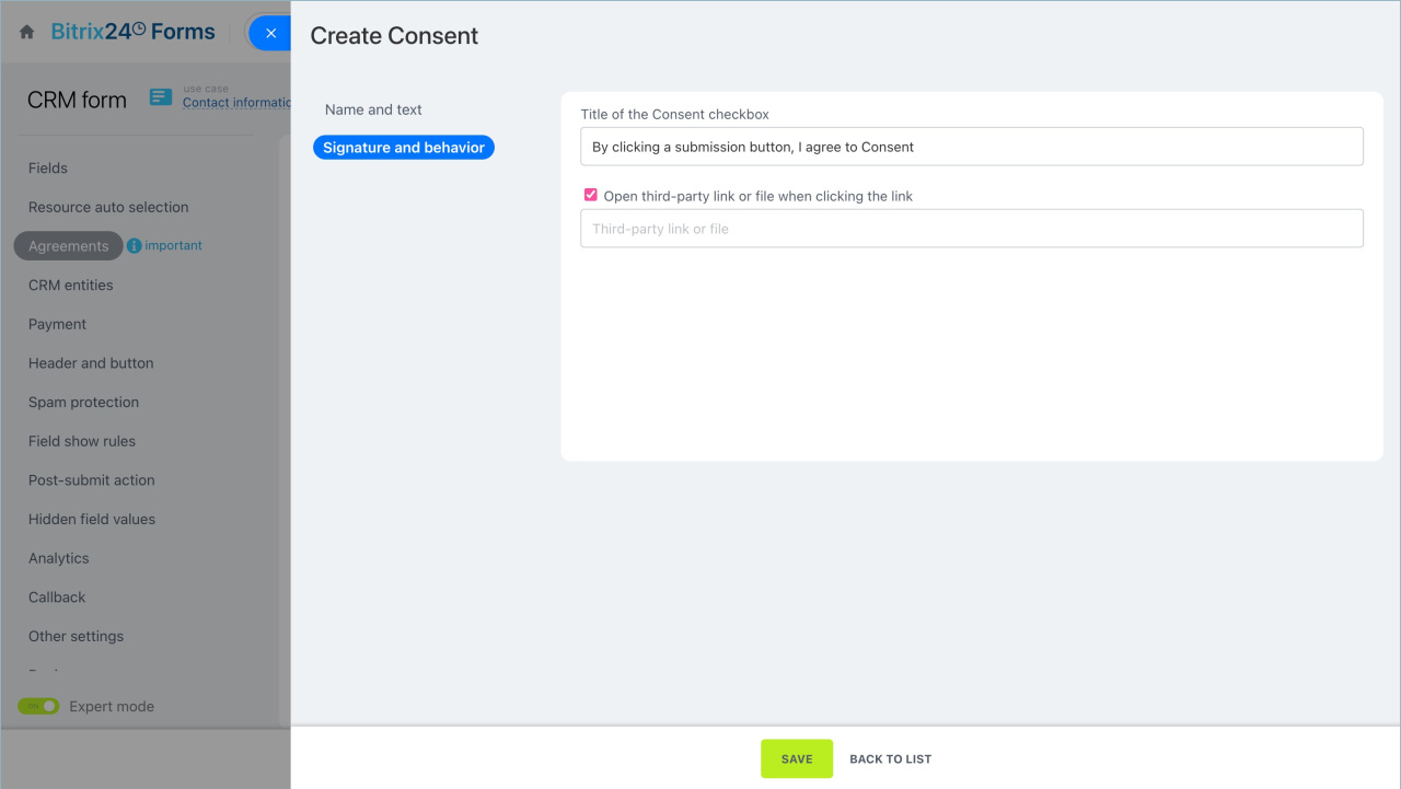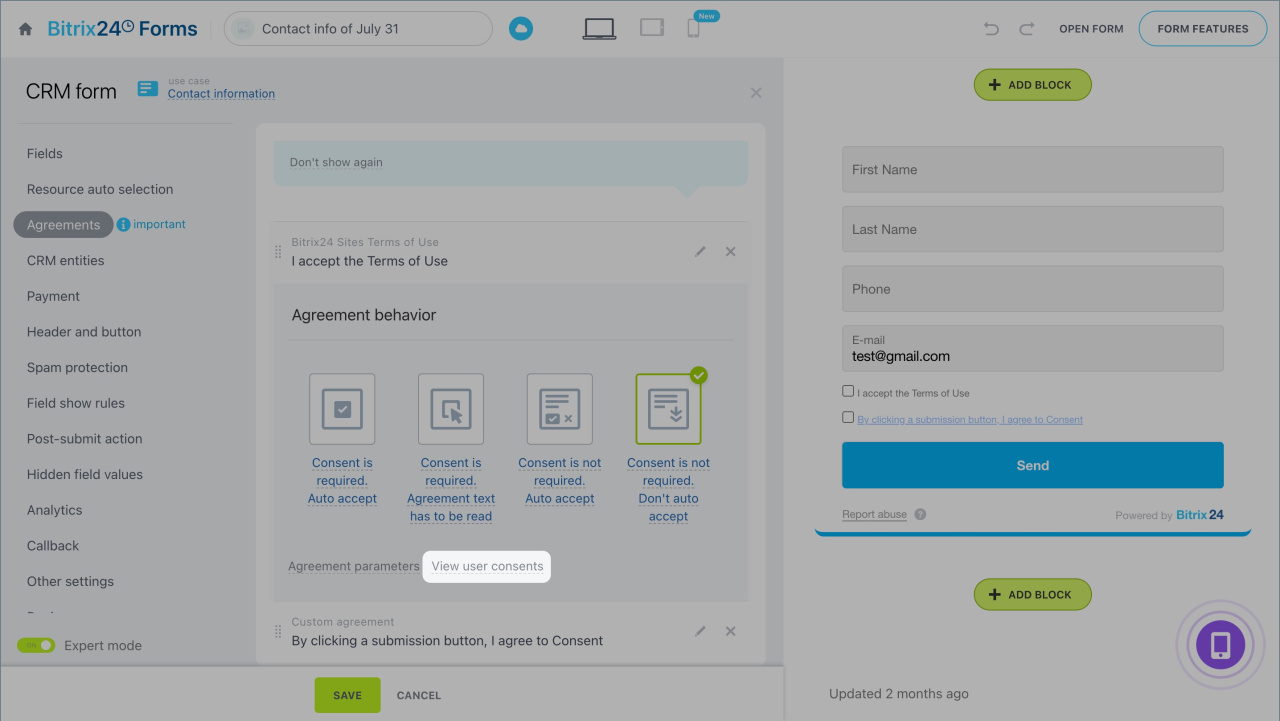 - Bitrix24 CRM forms allow you to collect user consents for processing personal data, receiving campaigns, participating in promotions, and more. This helps companies comply with the law while protecting customer interests.
