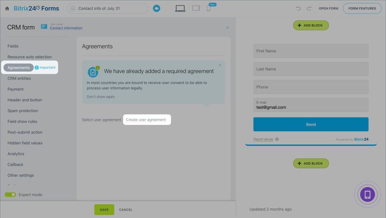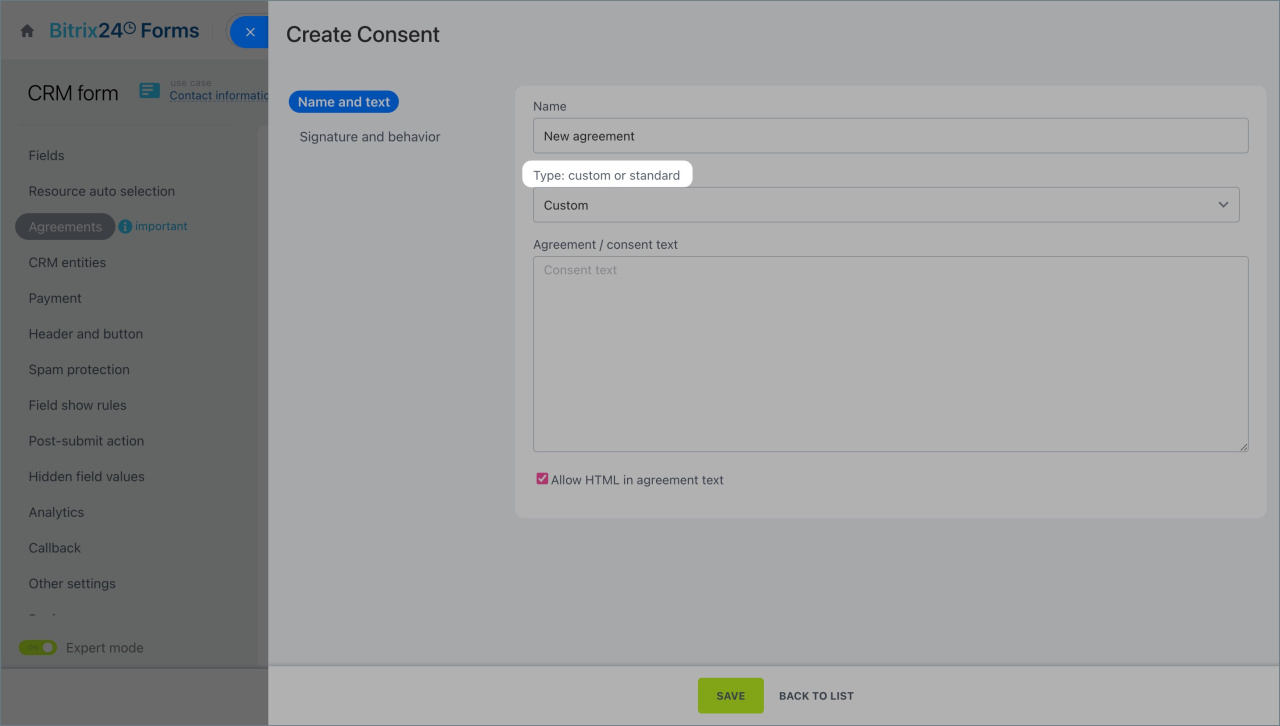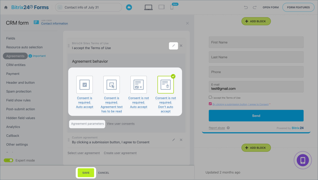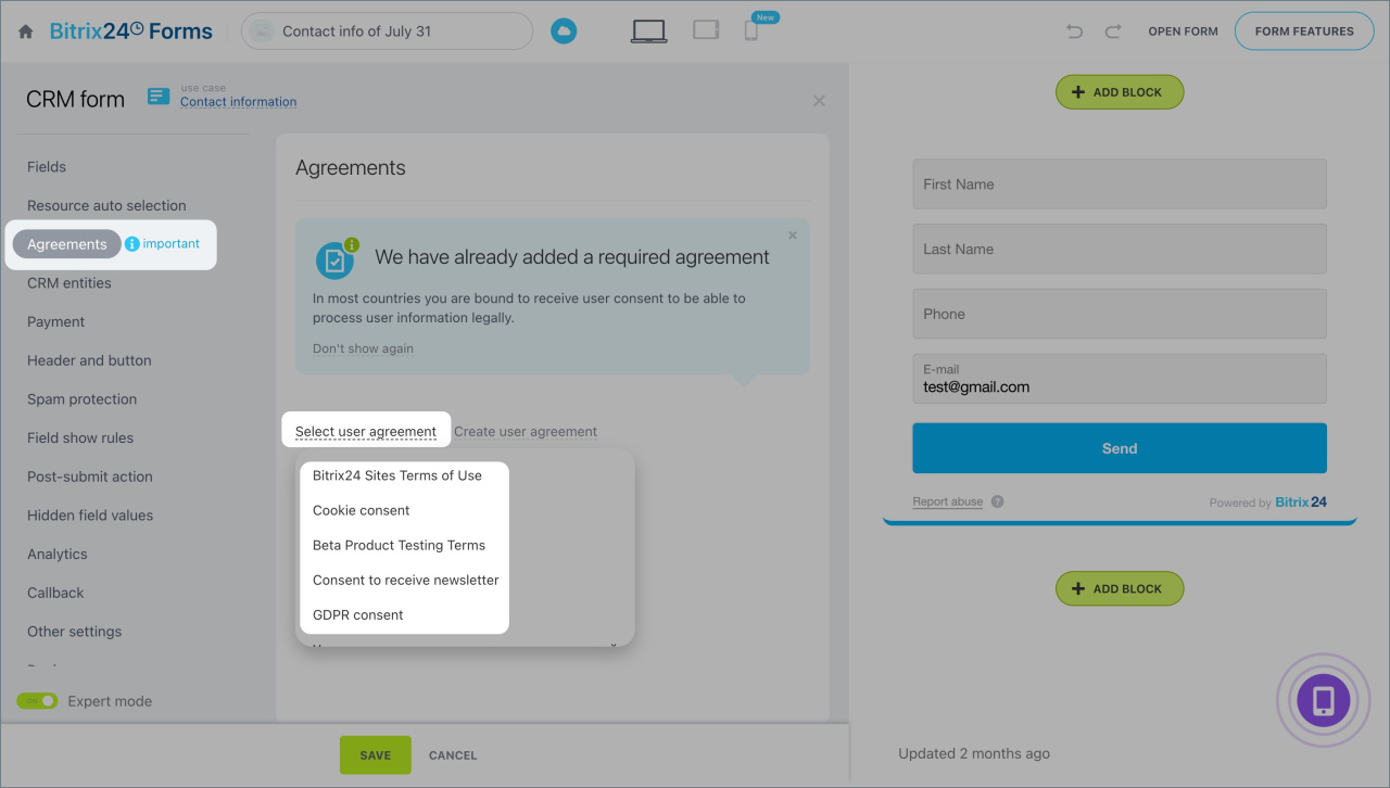 - Bitrix24 CRM forms allow you to collect user consents for processing personal data, receiving campaigns, participating in promotions, and more. This helps companies comply with the law while protecting customer interests.