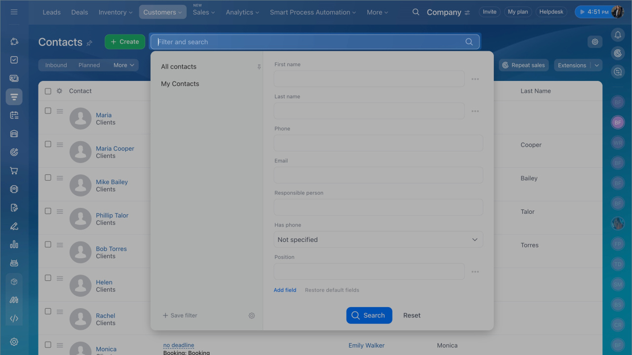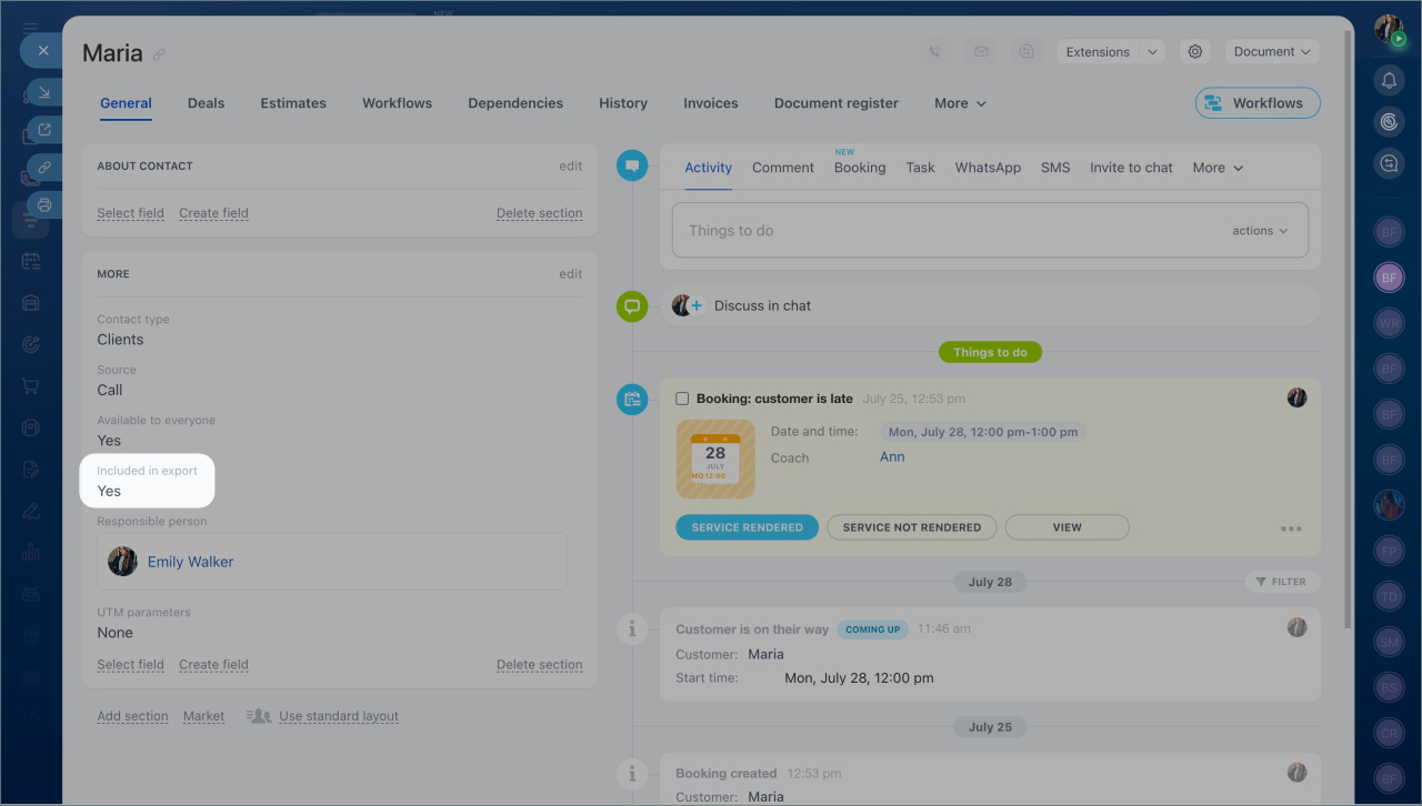 - Leads, deals, contacts, companies, estimates, invoices, and smart processes.