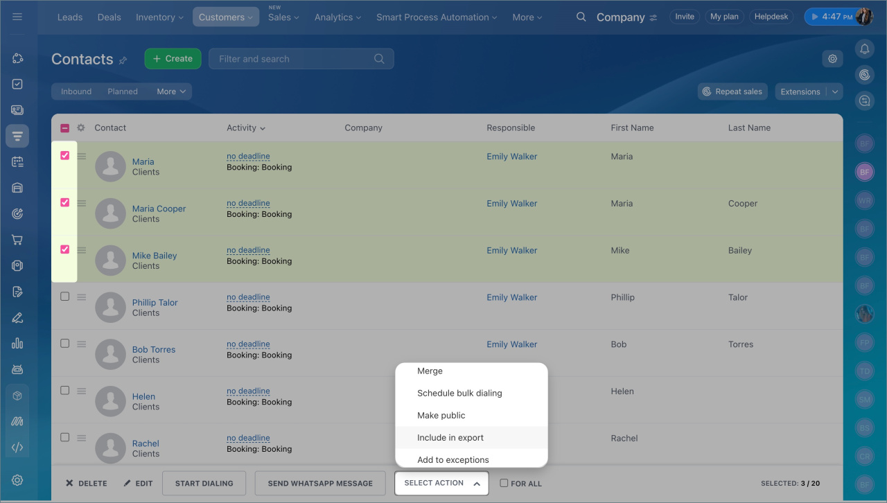 Open the list of required CRM entities. There is an Included in export option in contacts. You can export only those contacts that have the option enabled.