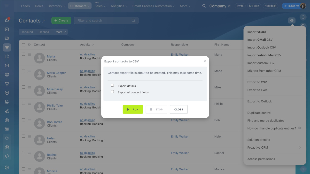 - Export all deal fields and Export all fields of contacts and companies. These options allow you to upload all fields from entities to a file at once.