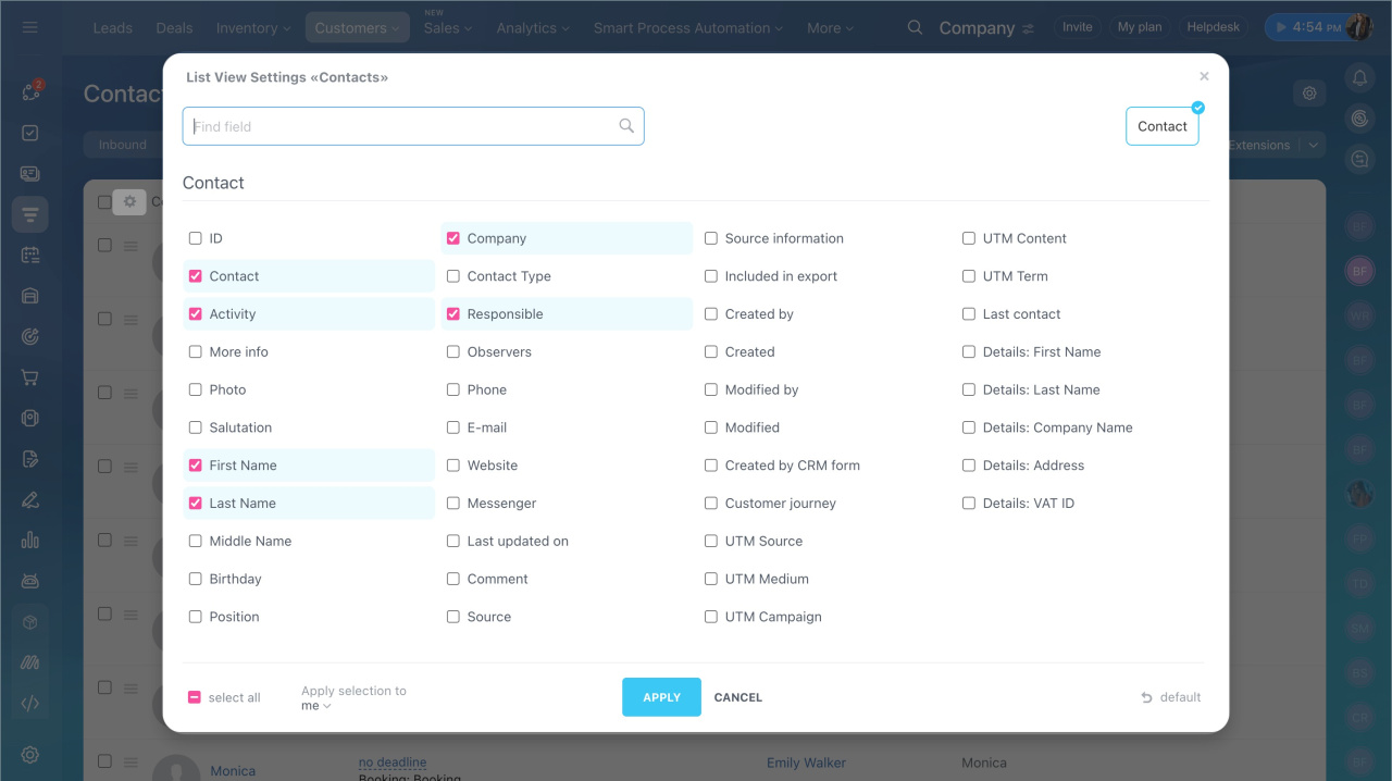 - Select fields for export. Open the List settings in the items table and check the required fields.