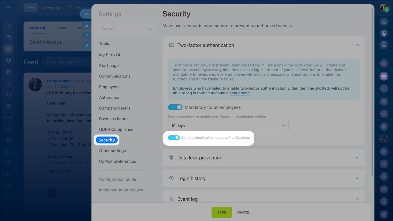 Two-step authorization. Enable two-step authorization for additional data protection in Bitrix24 Enterprise. In this case, logging in to Bitrix24 will consist of two stages: first, you need to enter your login and password, and then – a unique one-time code generated by a special application. The code is limited in time and is used only once.