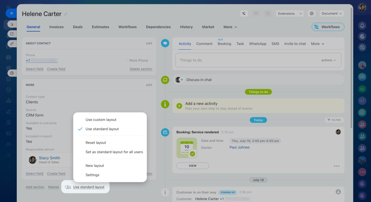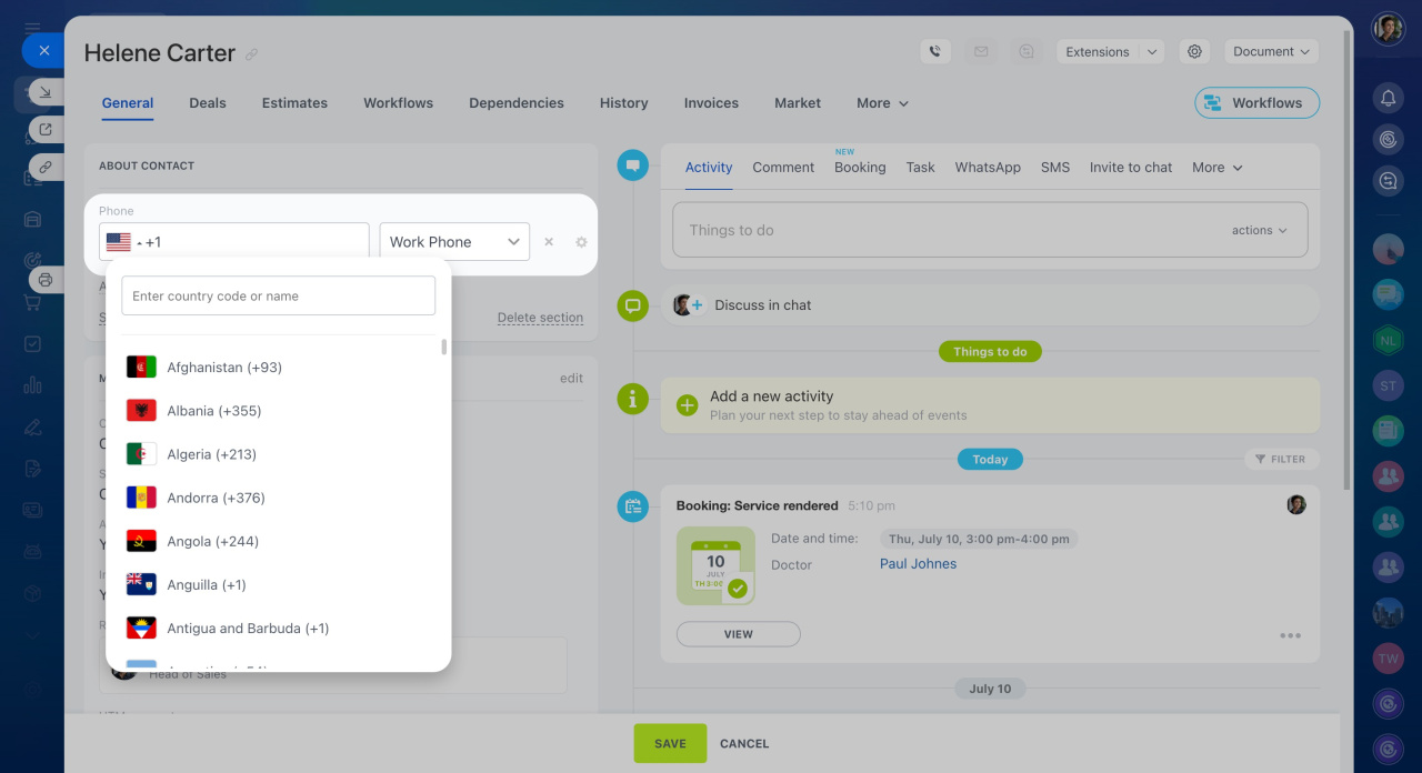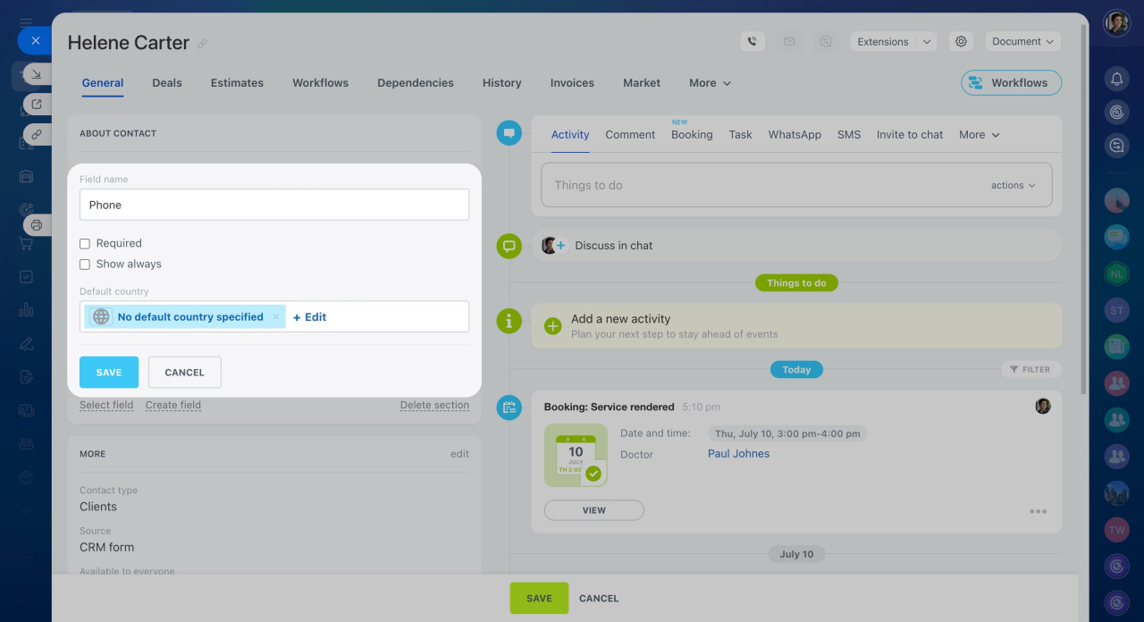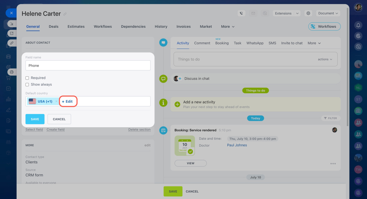 When you enter a number in the standard Phone field, Bitrix24 automatically detects a country by its phone code and displays the corresponding flag. You can also set a default country so that users don’t have to enter the country code manually every time they add contact information.