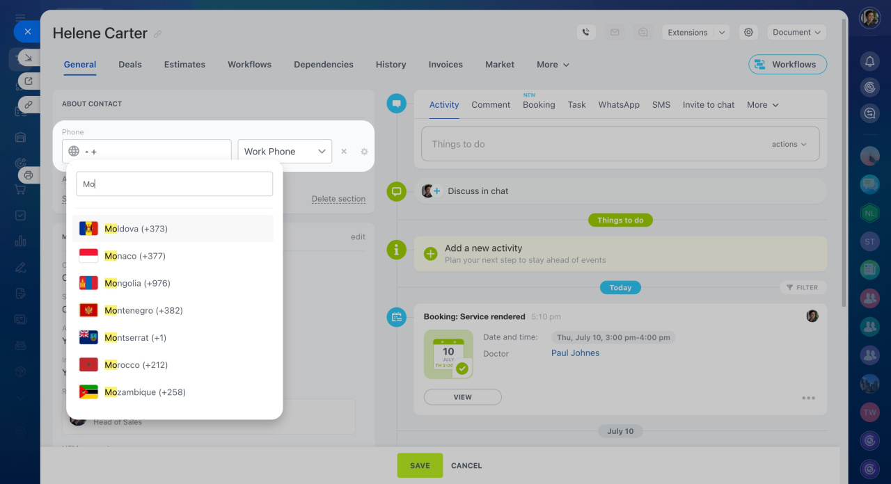 Bitrix24 automatically detects the country by the phone number’s country code.