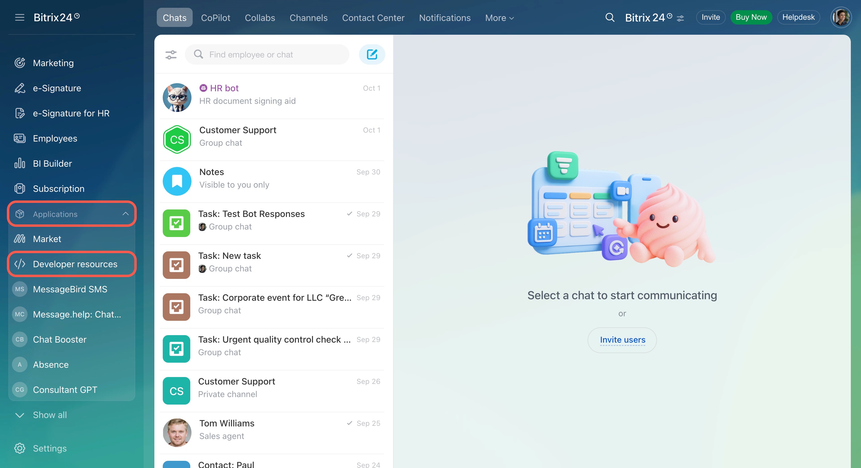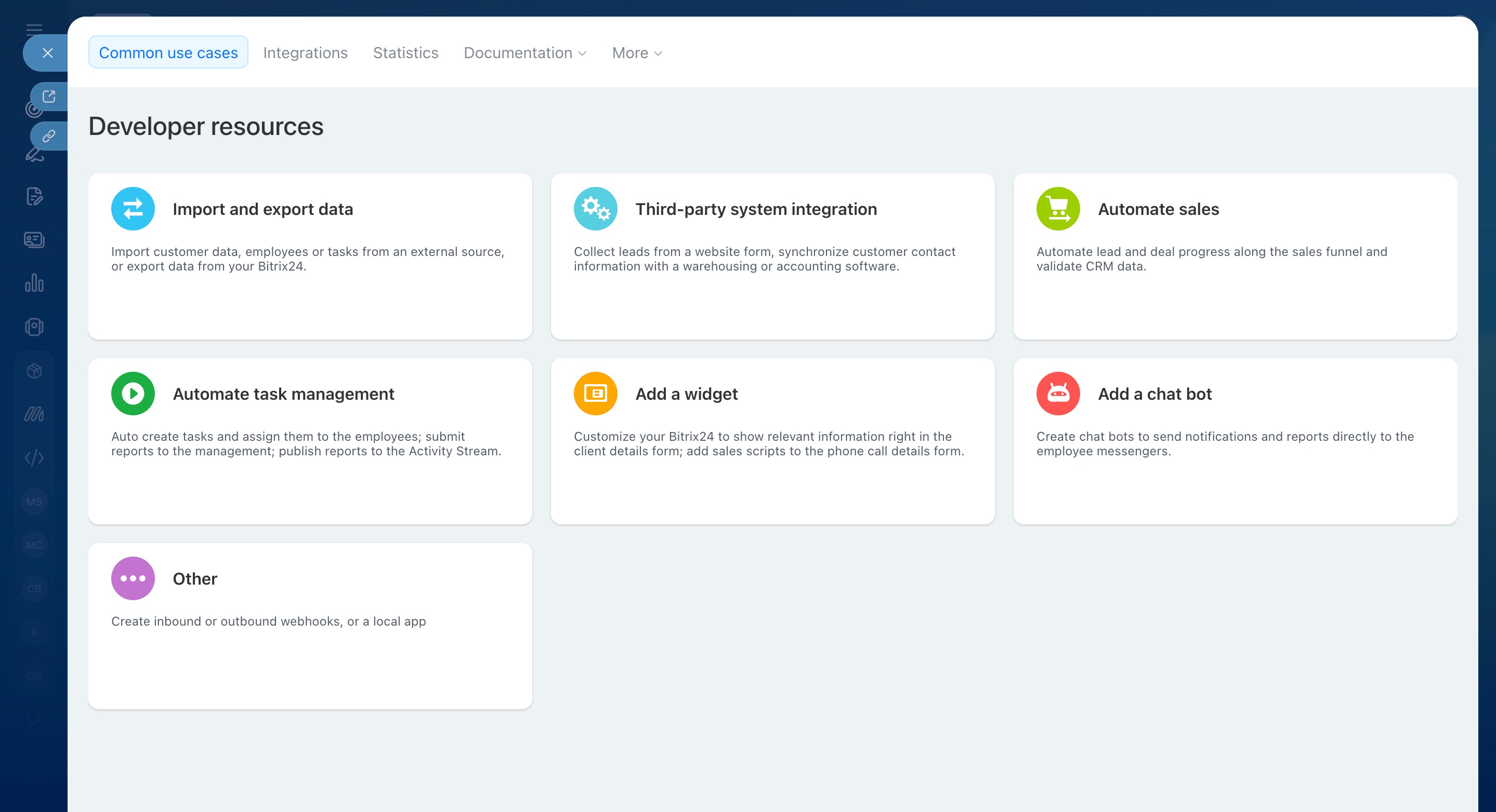 The Developer resources section is for companies that want to build local applications, set up integrations, or customize Bitrix24 tools. Here you can: