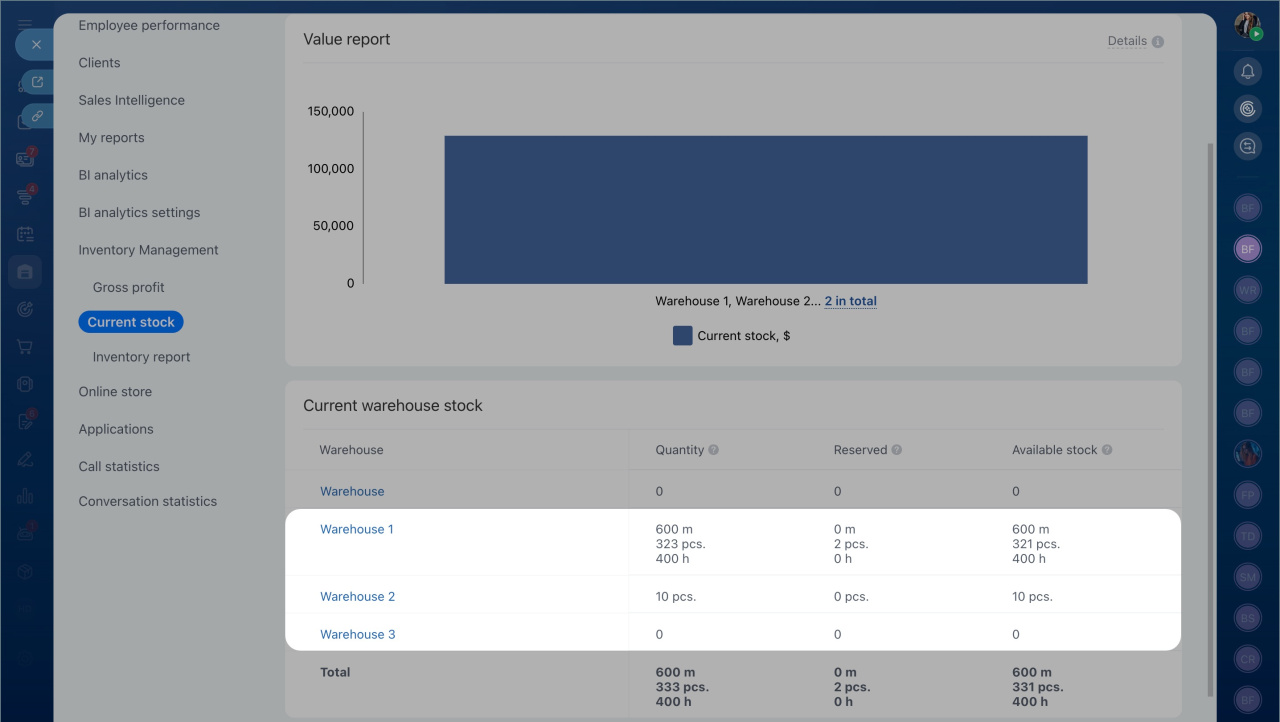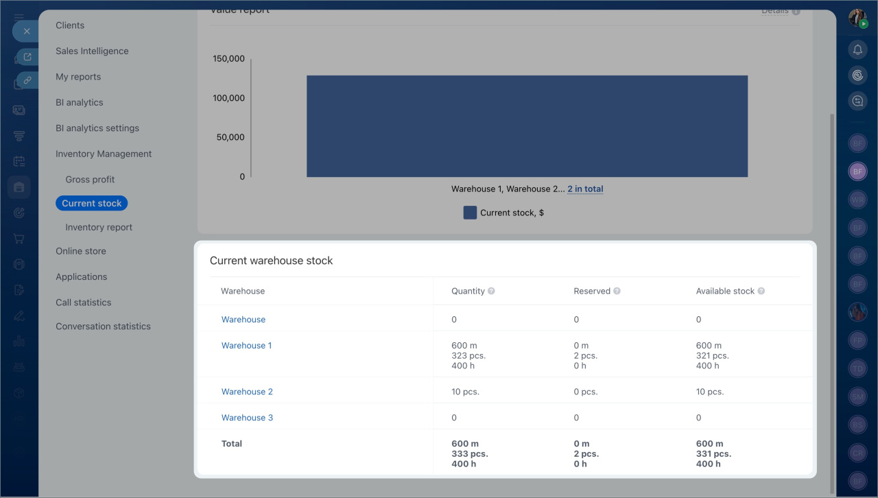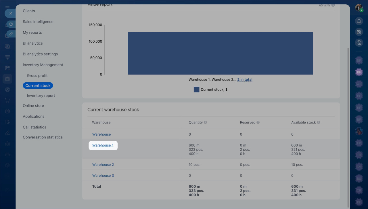 The top section of the report displays the total value of inventory. The value is calculated based on purchase prices. To view data for each warehouse, click In total.