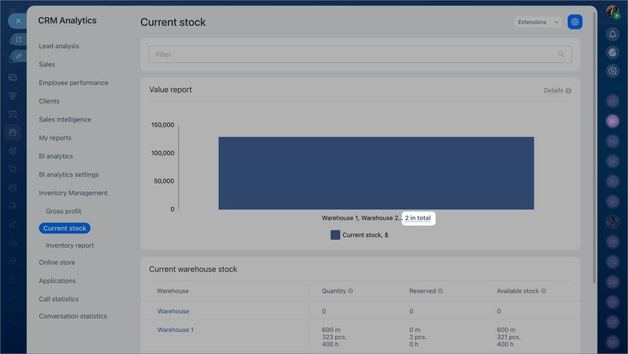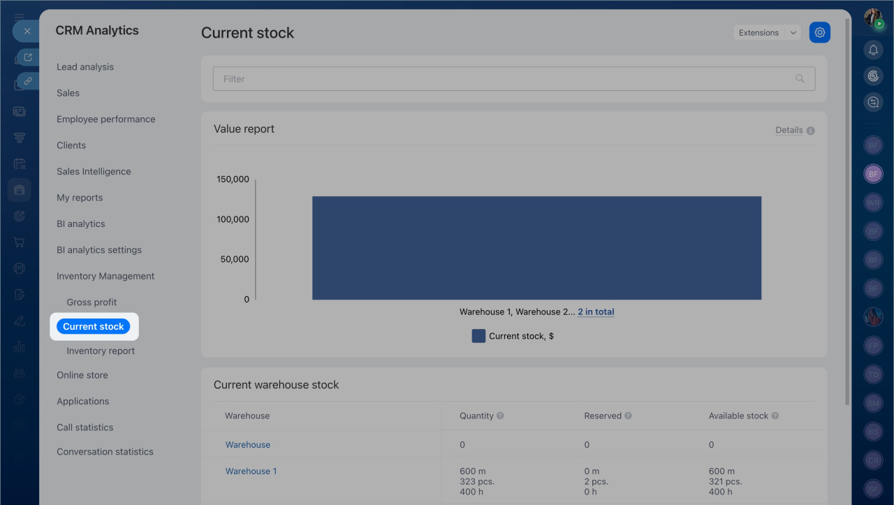 To view the report, go to the Inventory management section > Analytics > Current stock.
