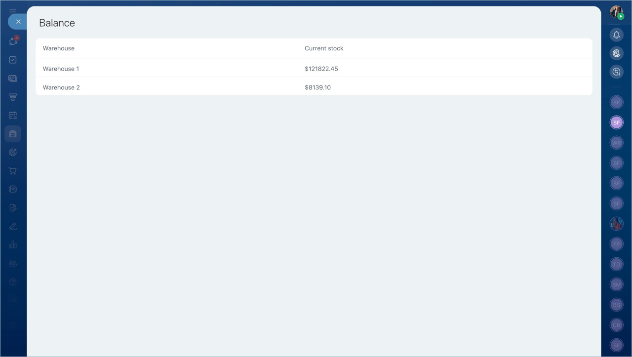 - The top section of the report displays the total inventory value. The bottom section contains a table with current stock levels. You can view detailed information about each warehouse.