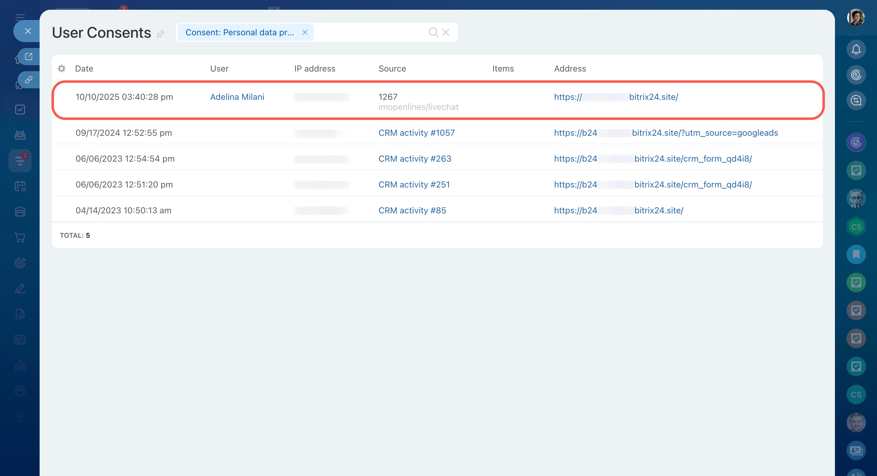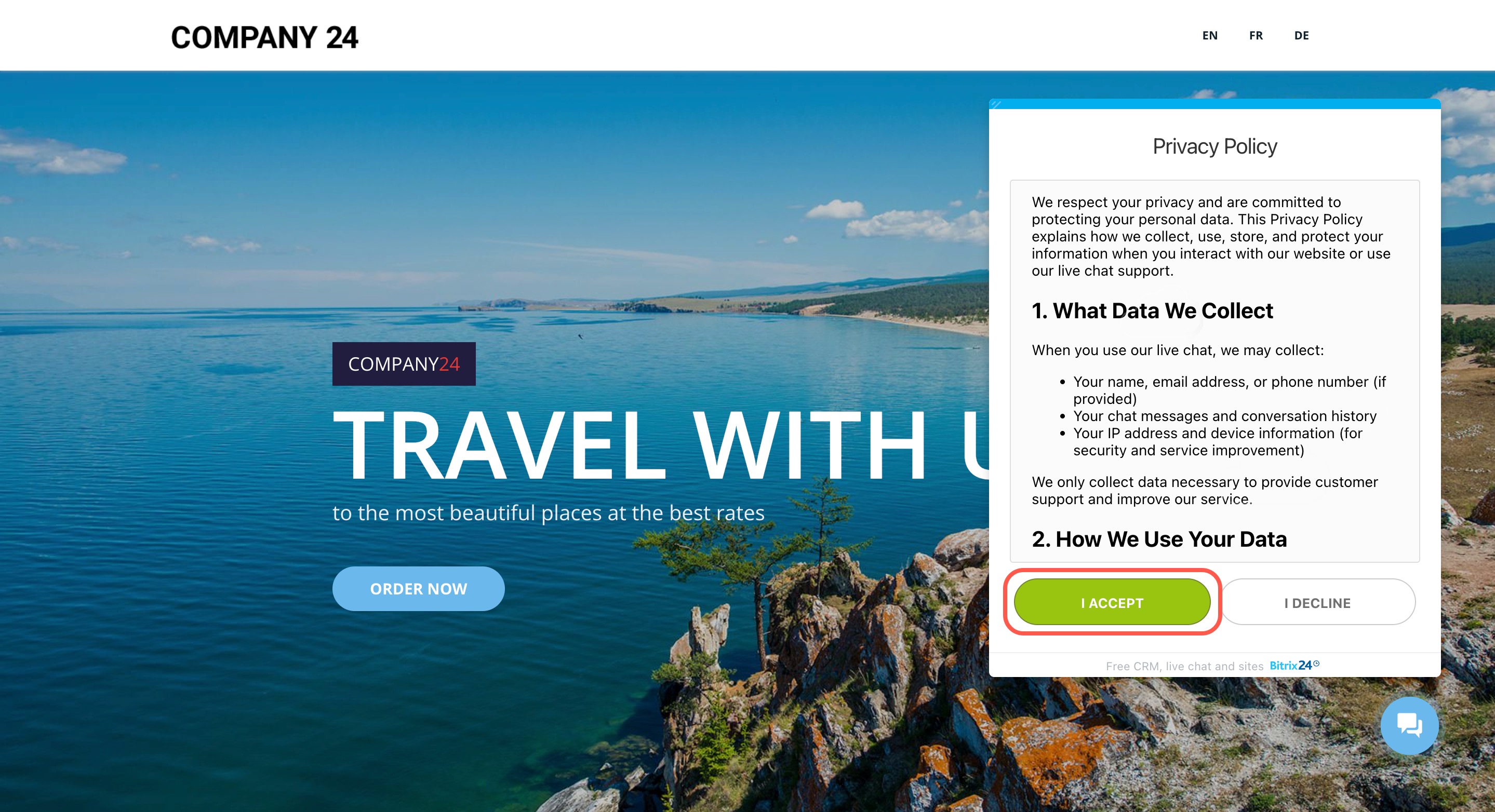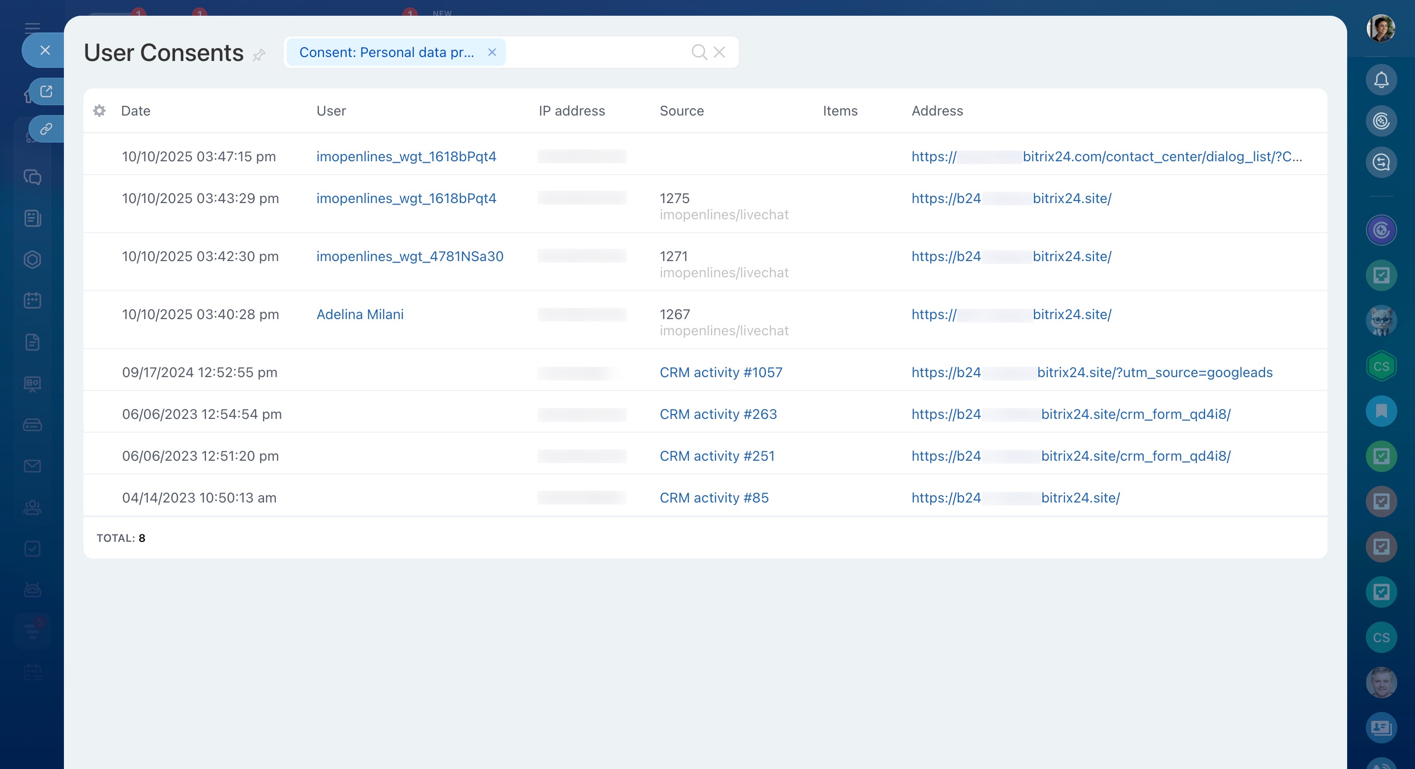 In Bitrix24, you can automatically request consent for data processing through Open Channel communication, such as live chat or messengers.