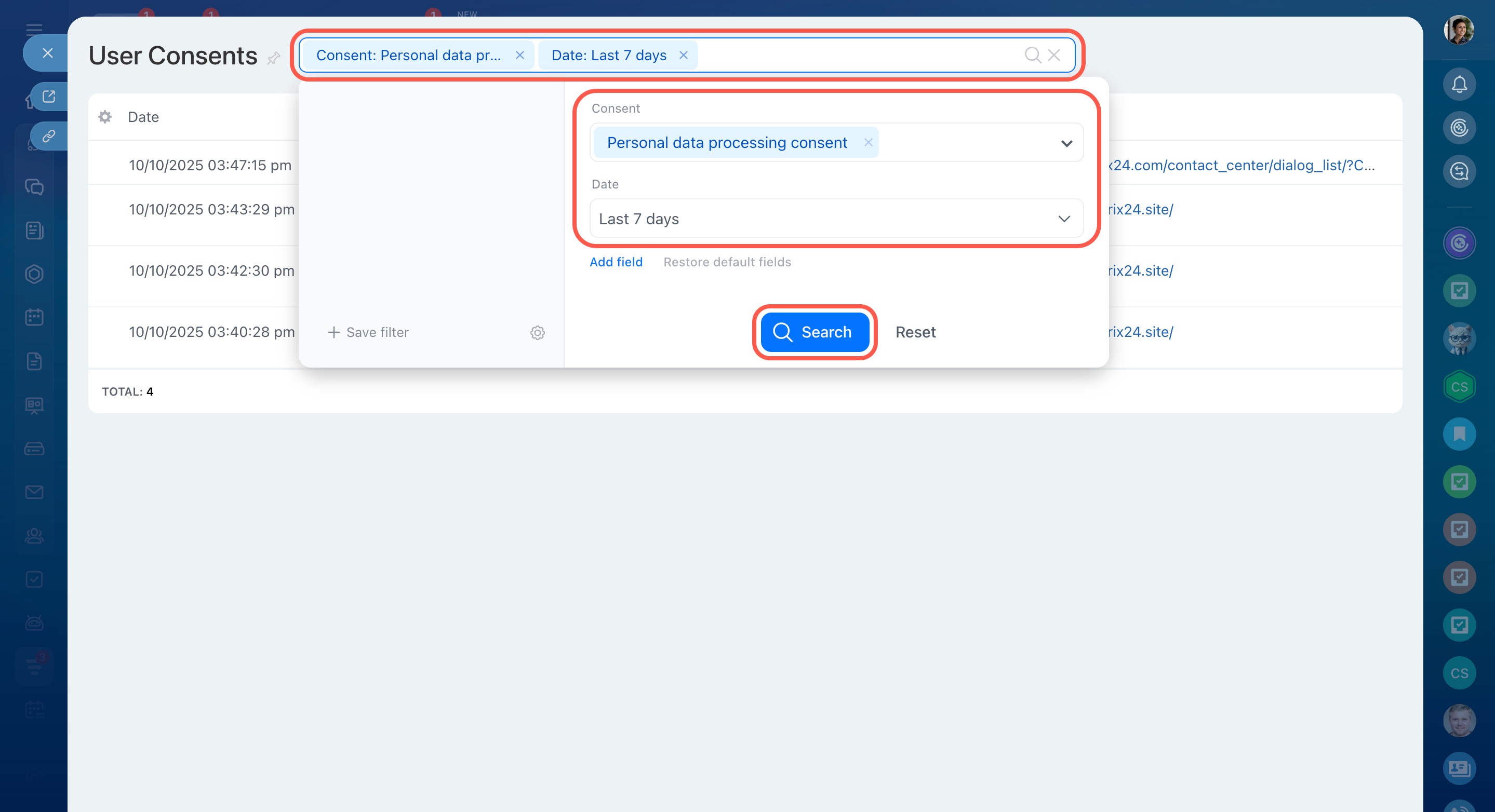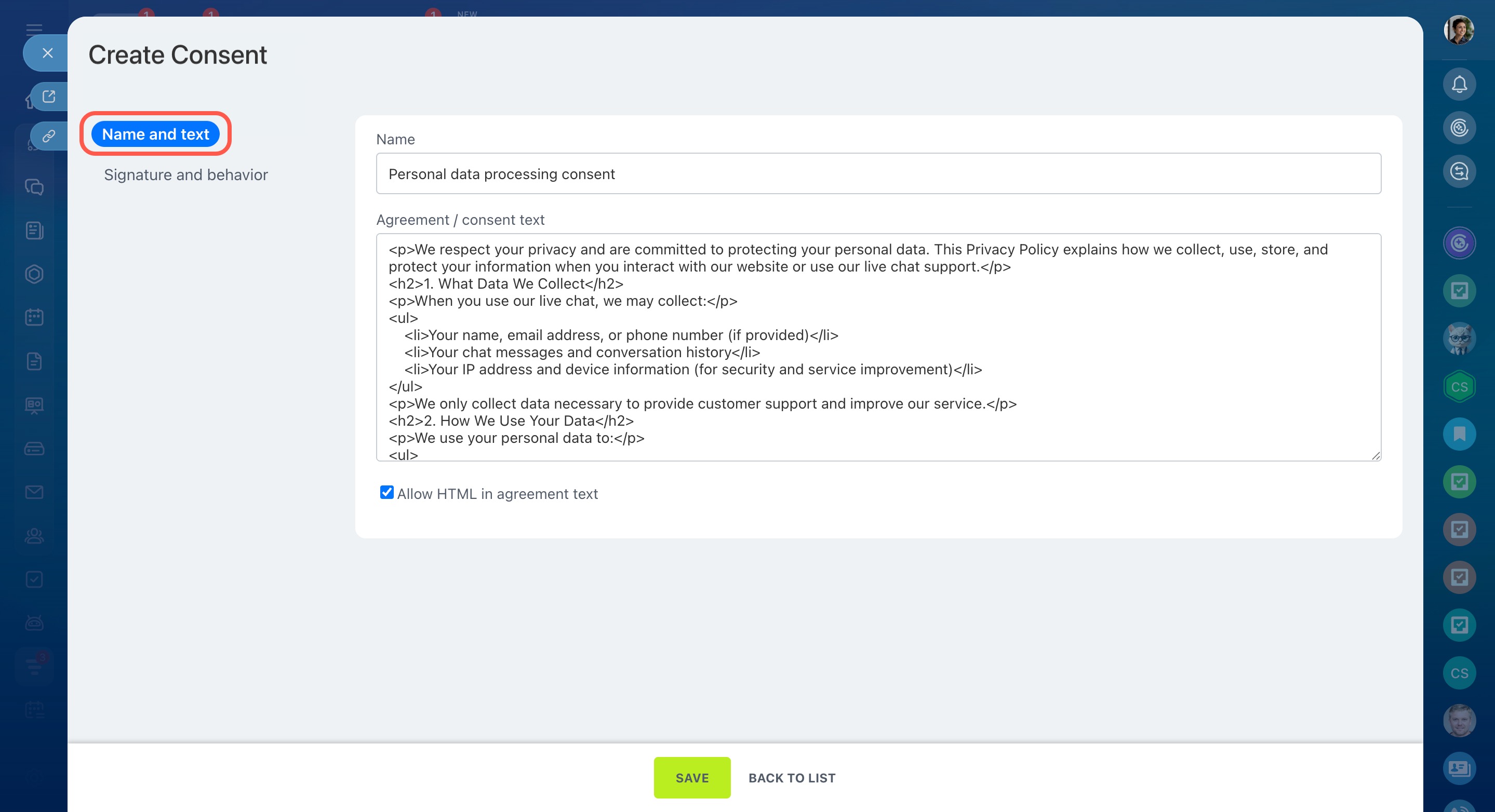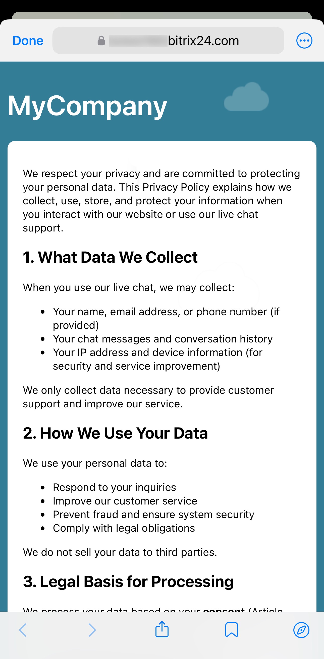 In Bitrix24, you can automatically request consent for data processing through Open Channel communication, such as live chat or messengers.