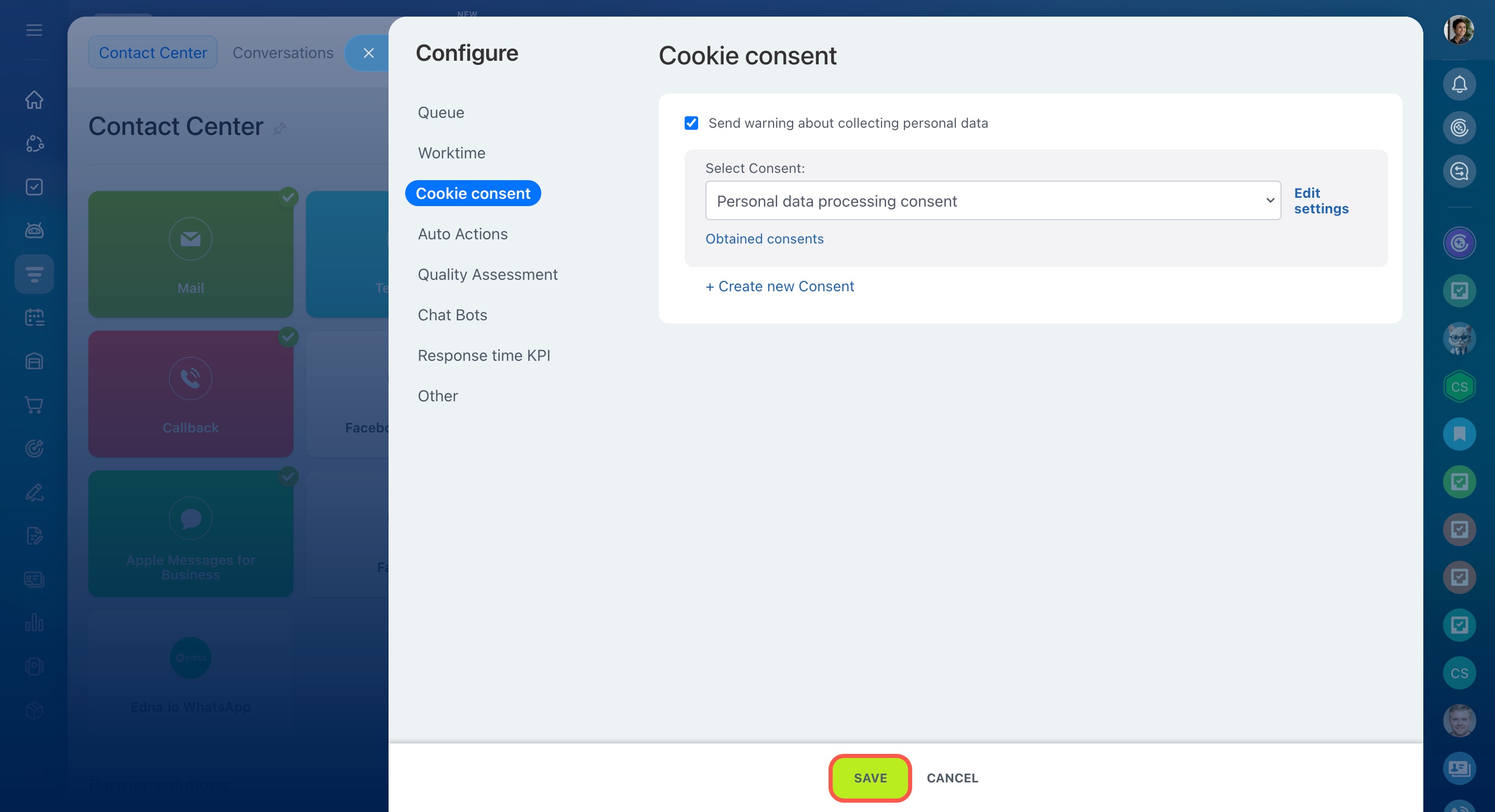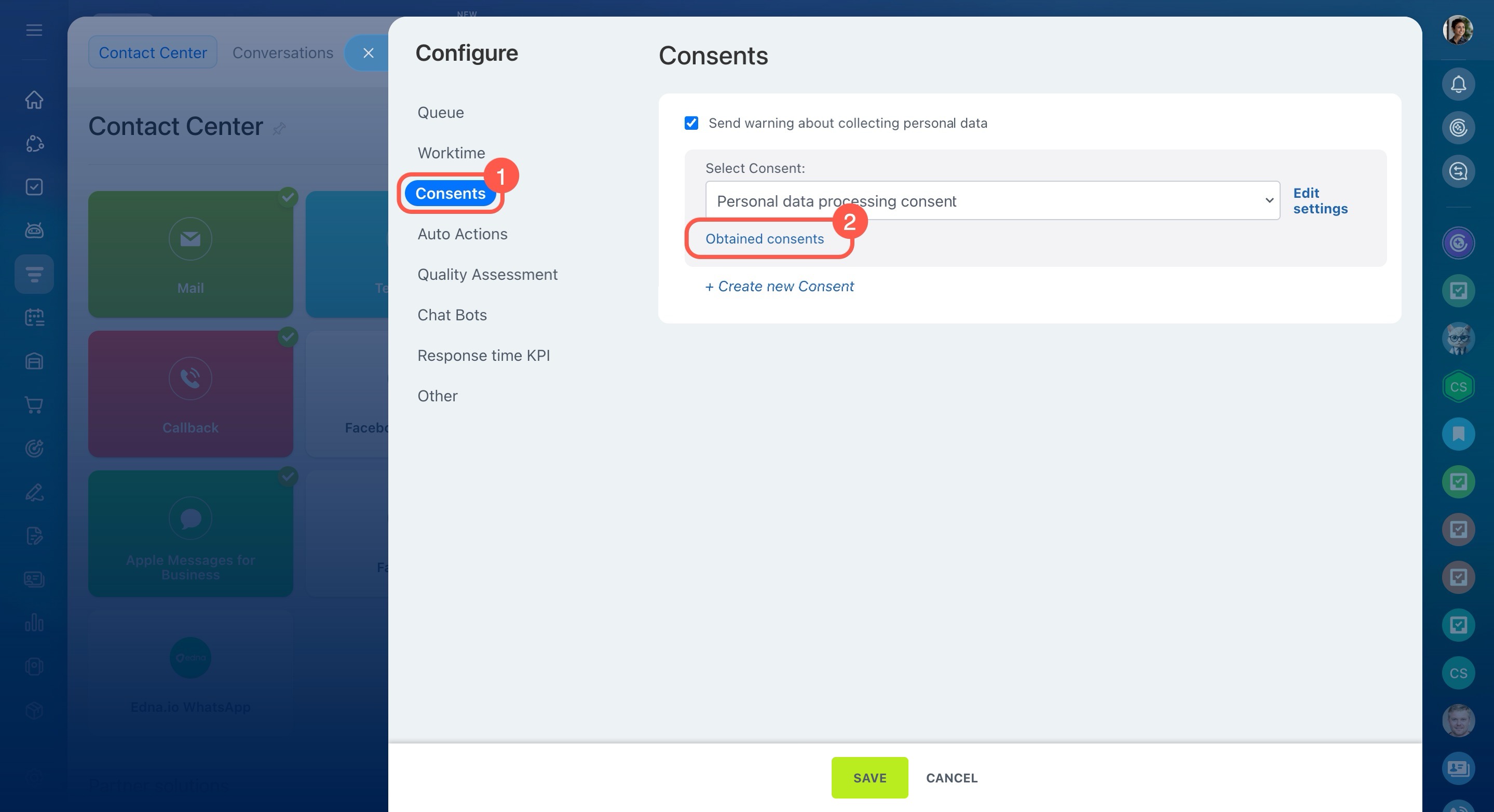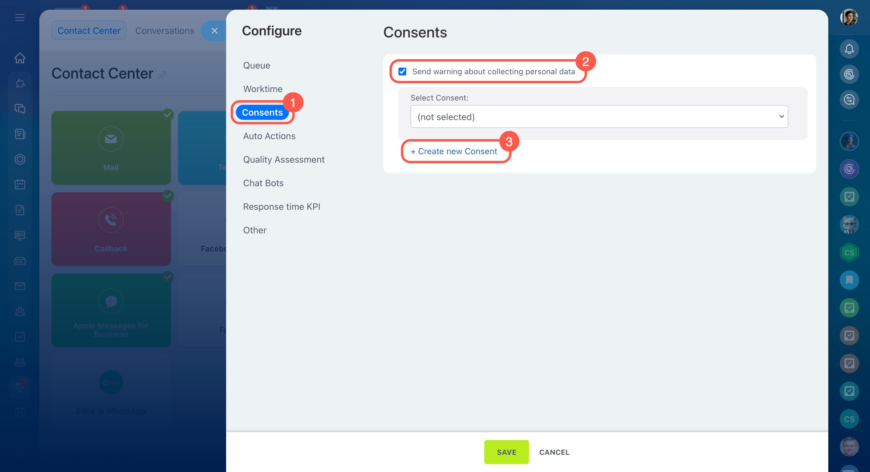 In many countries, including those in the European Union under GDPR, companies are legally required to get customer consent before collecting or using personal data. In Bitrix24, you can automatically request this consent when communicating through Open Channels like live chat or messengers.