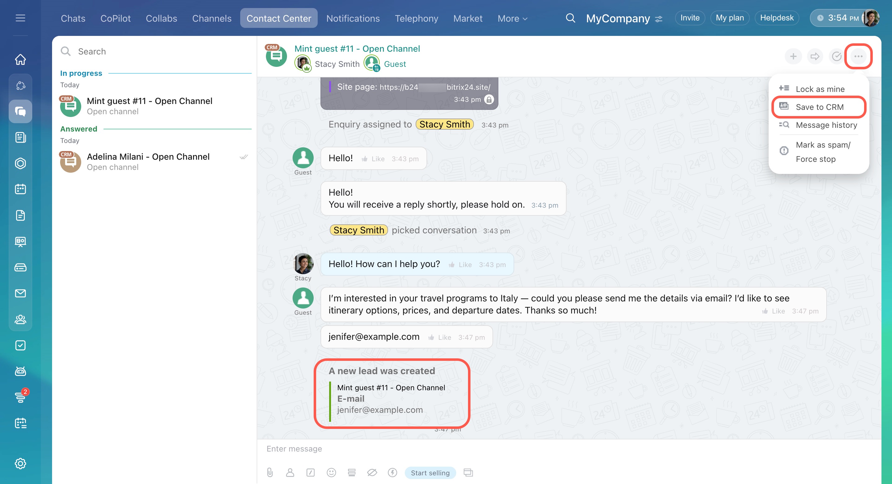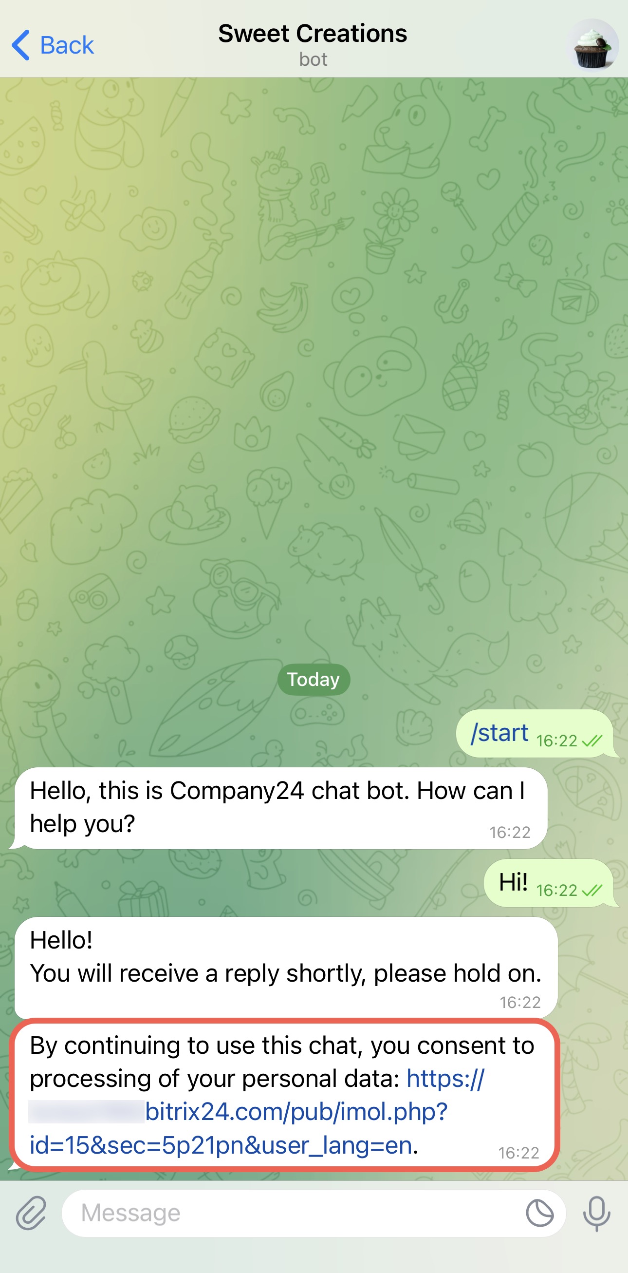- I accept: Bitrix24 starts a new conversation, and the client’s consent to process personal data is saved in the CRM.