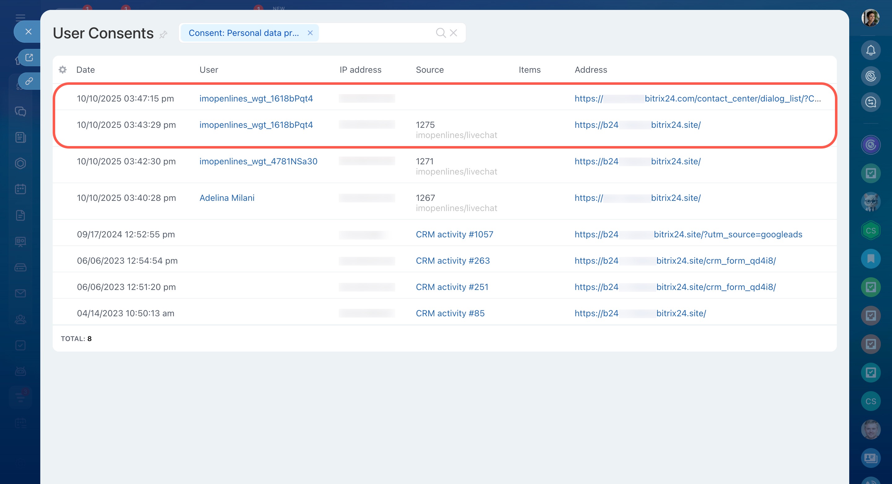 The list will include two consent records for the client. The first shows the page URL where the client confirmed consent in the Address column, and the second links to the conversation in Bitrix24.