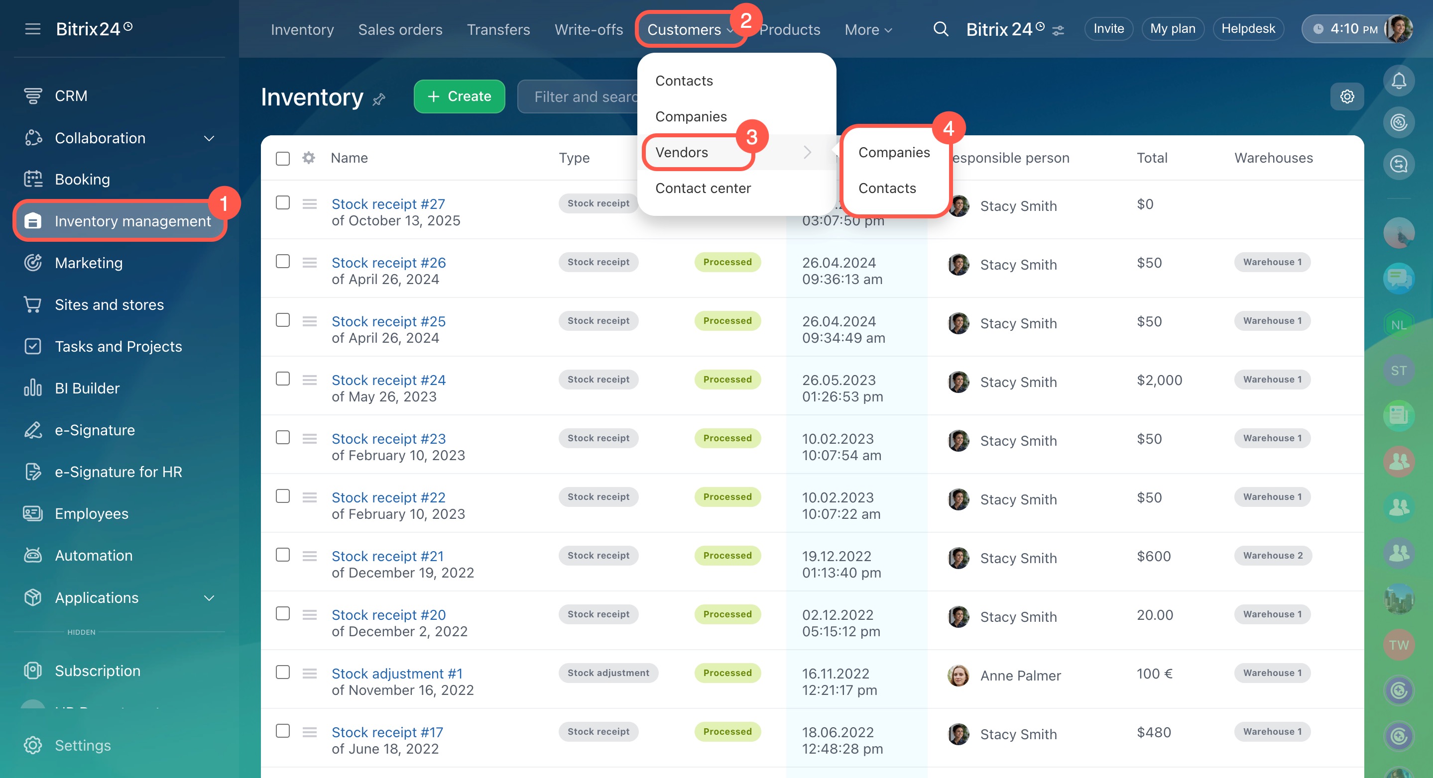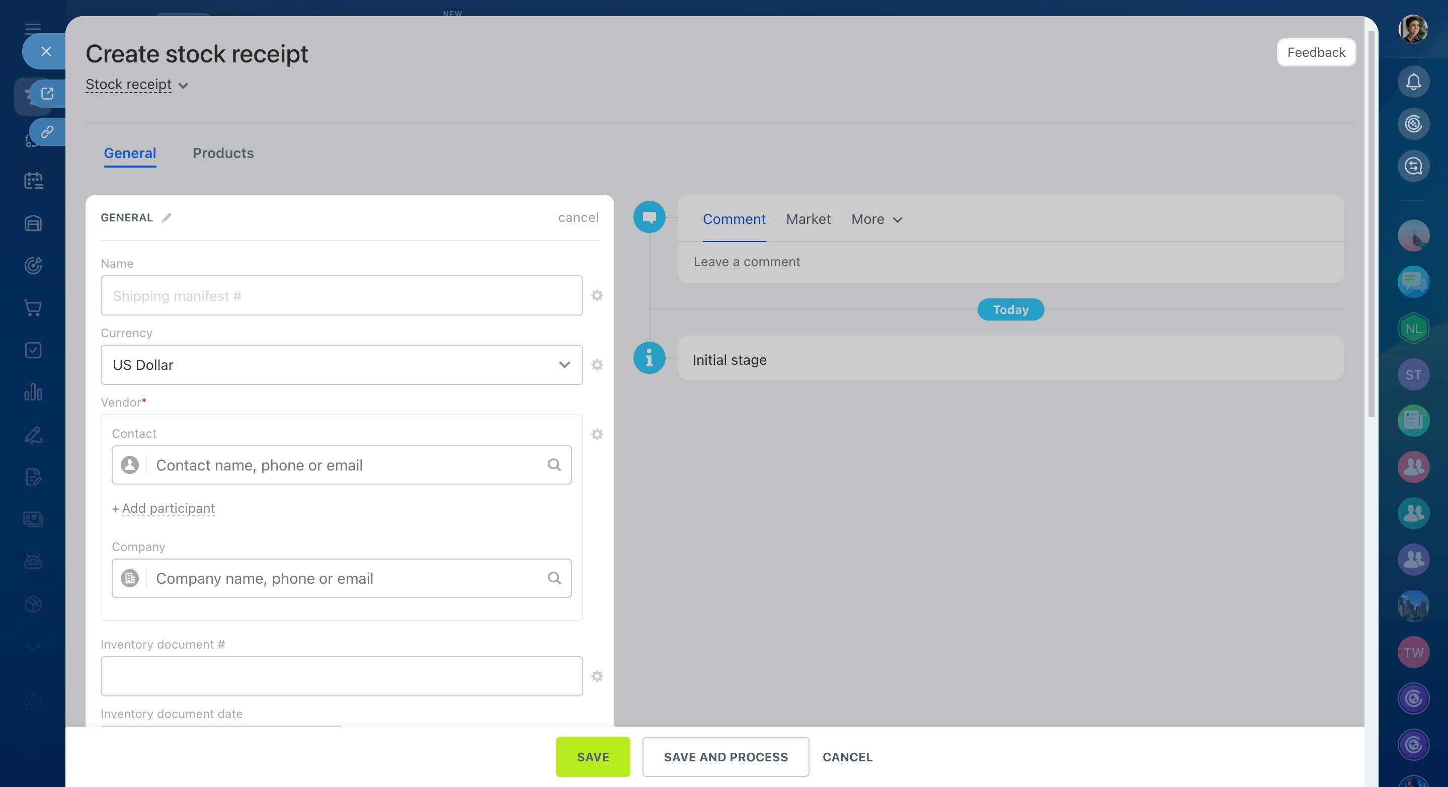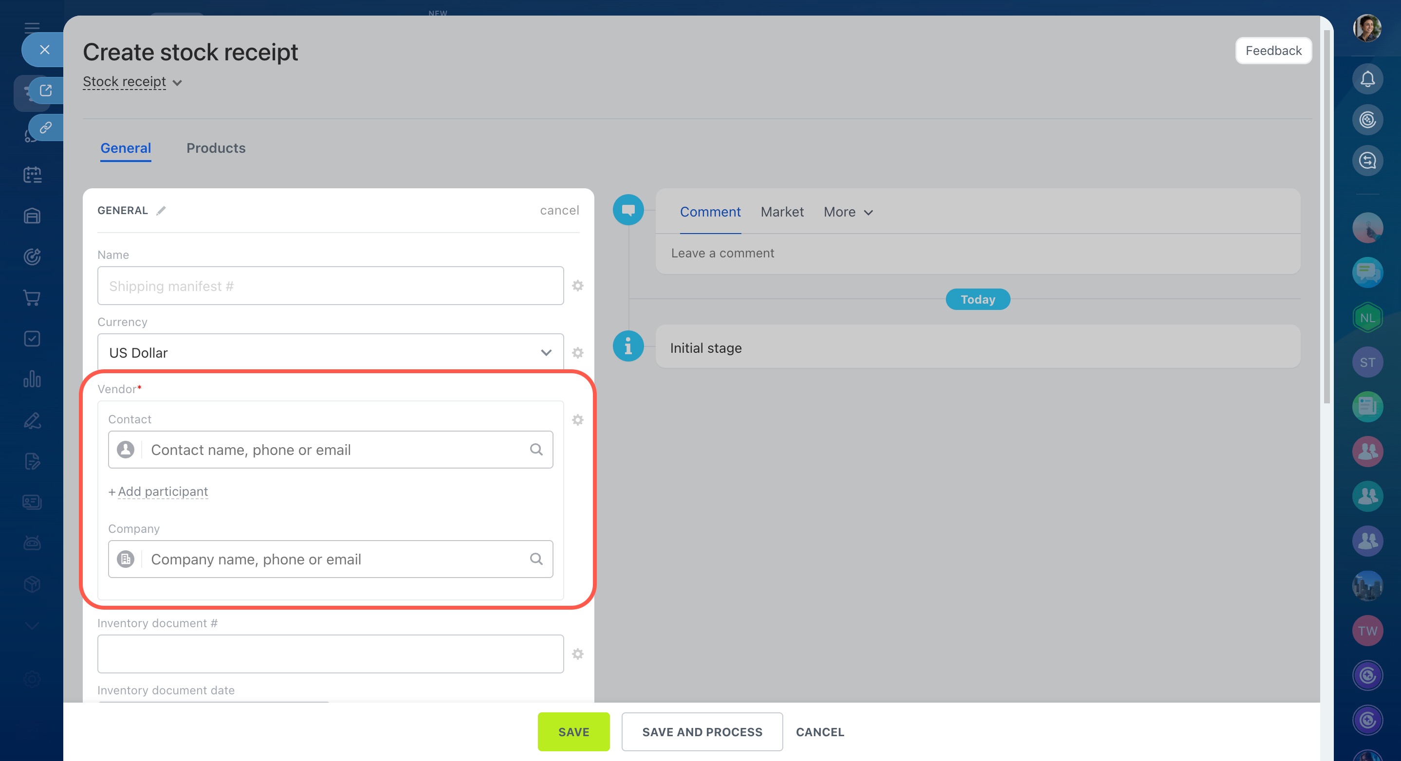 In Bitrix24, you can add new vendors and their details when filling out a stock receipt form.