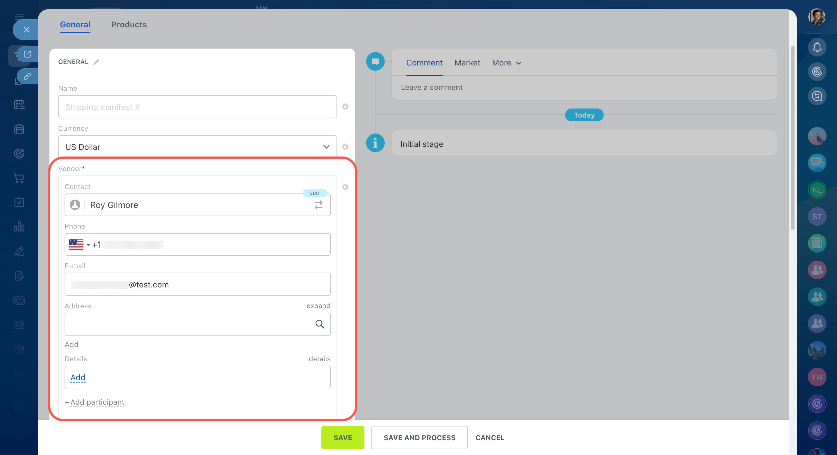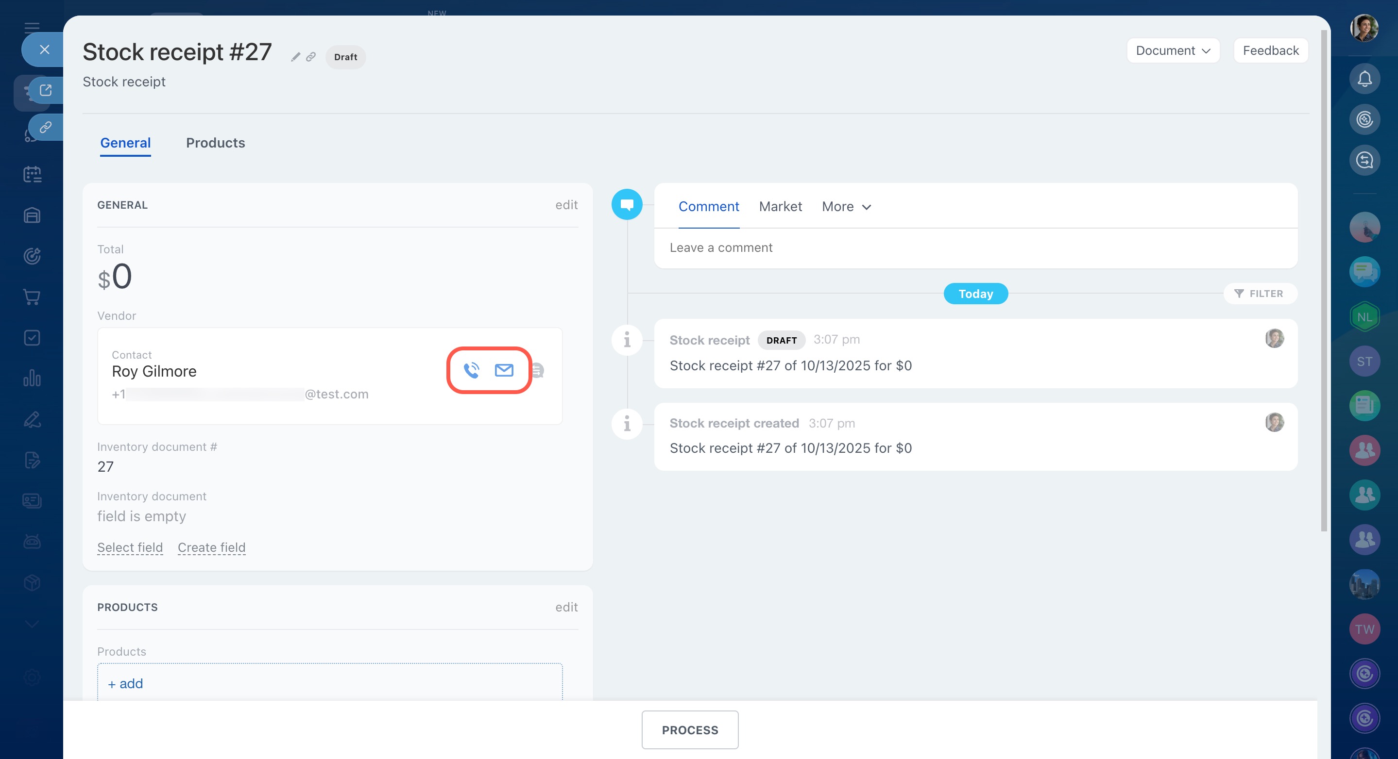 When creating a stock receipt, you can add the vendor's contact information, including a phone number, email, address, and other details.