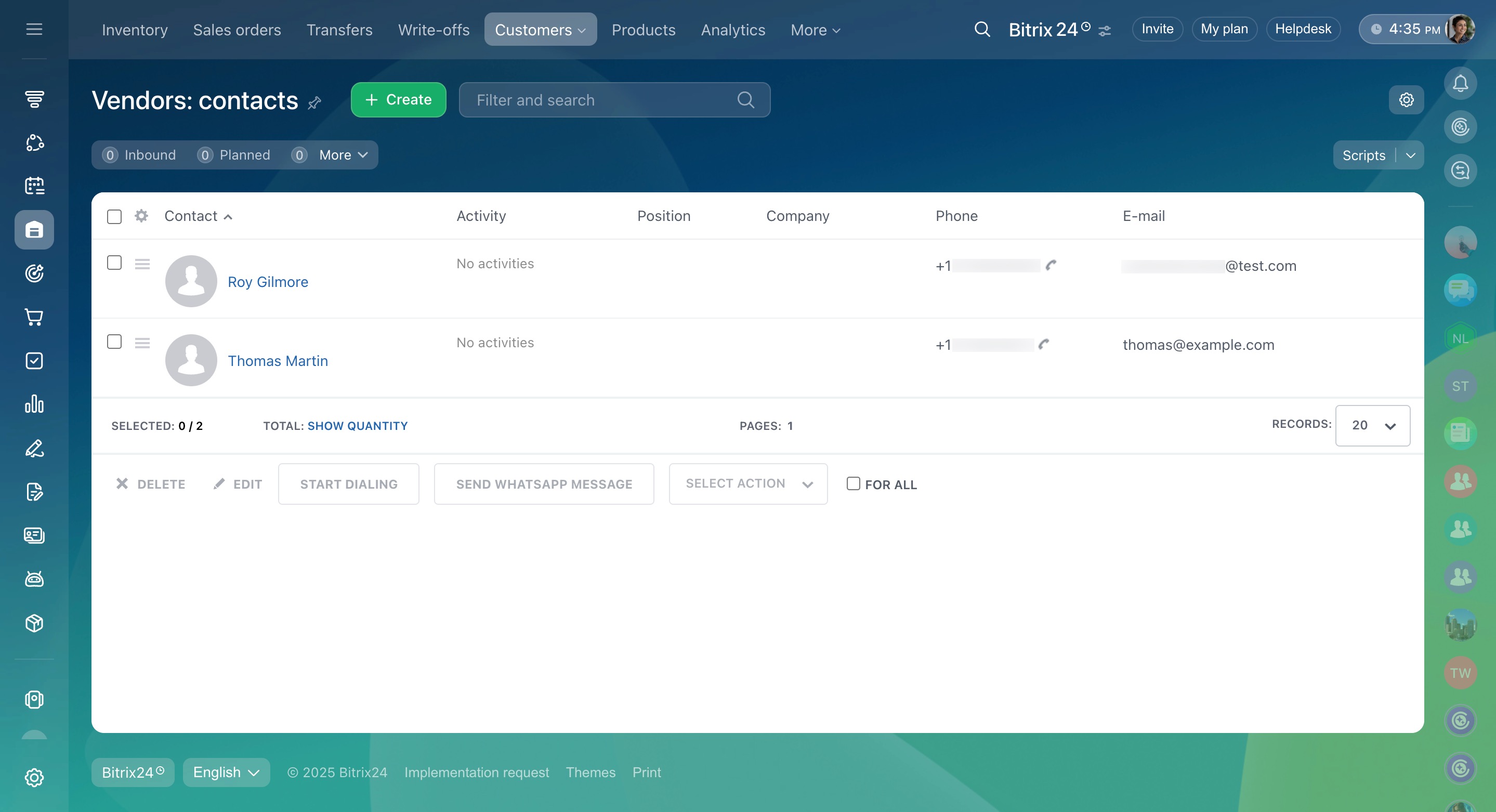 Select the vendor you want to view. In the form, you can plan activities, set reminders, create tasks, and communicate with the vendor.